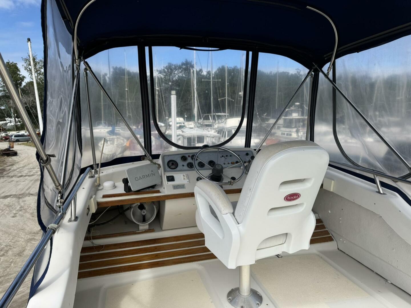 Upgraded 1984 Mainship 34 MK III “Fleur De Leigh II” with Perkins diesel, Phasor genset, new A/C, Garmin touchscreen, custom bridge canvas, and refreshed interior. Efficient 7-knot cruiser with dual helms—ideal for the Great Loop or liveaboard.