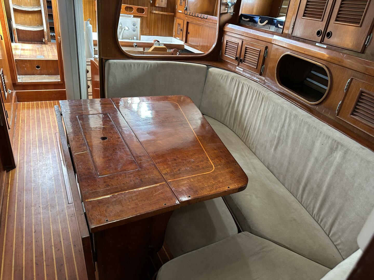 Below deck, the Pan-Oceanic 46 features a warm, traditional interior with generous headroom, excellent storage, and a practical layout designed for long-term living aboard. The spacious salon, functional galley, private cabins, and ample tankage make her well-suited for long passages or full-time cruising.