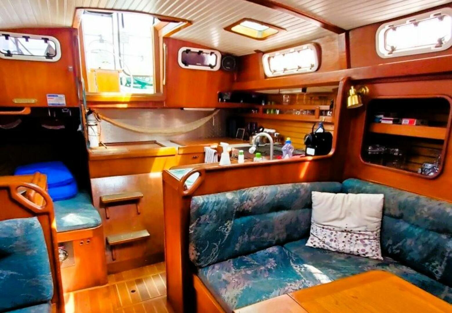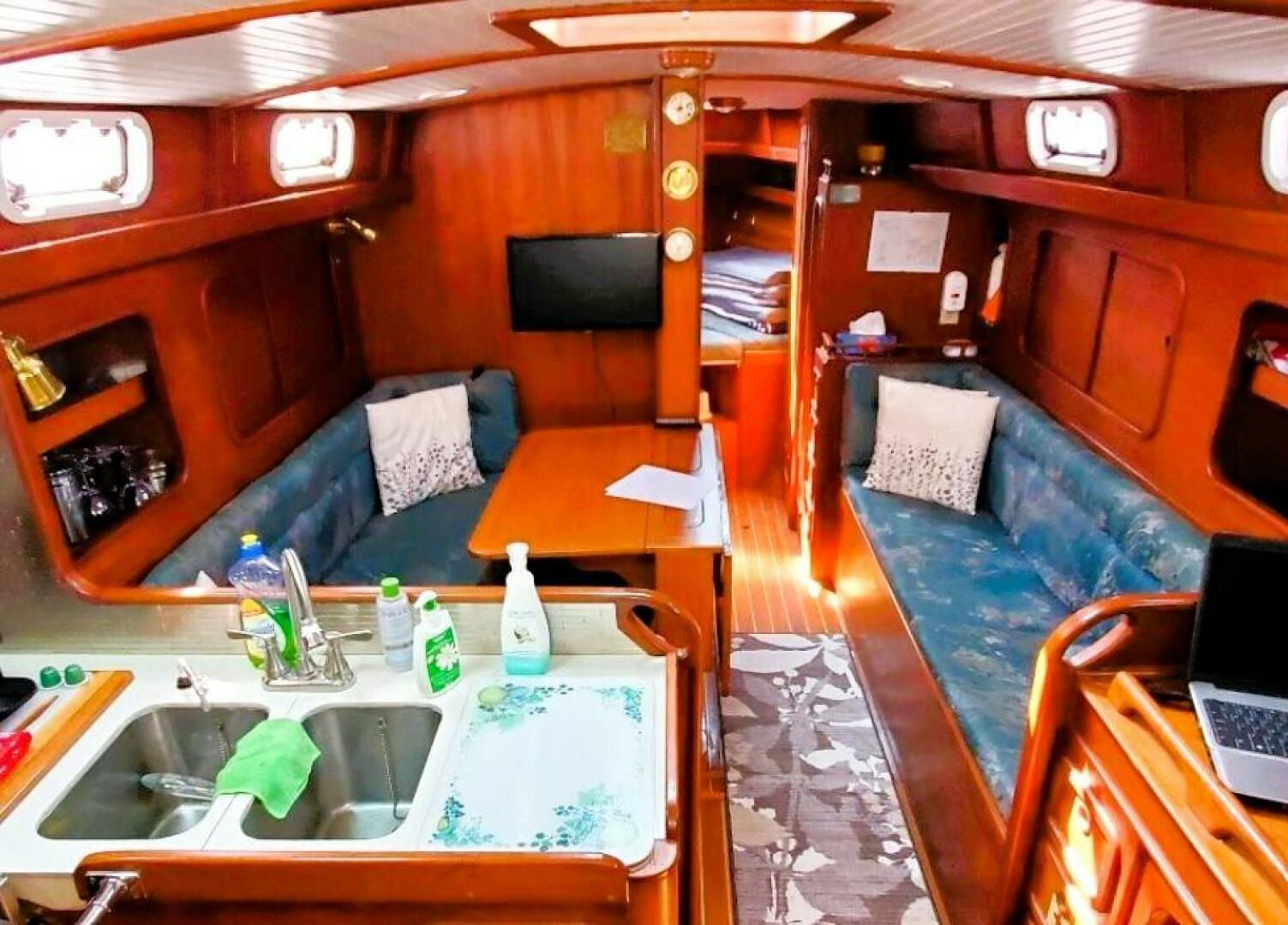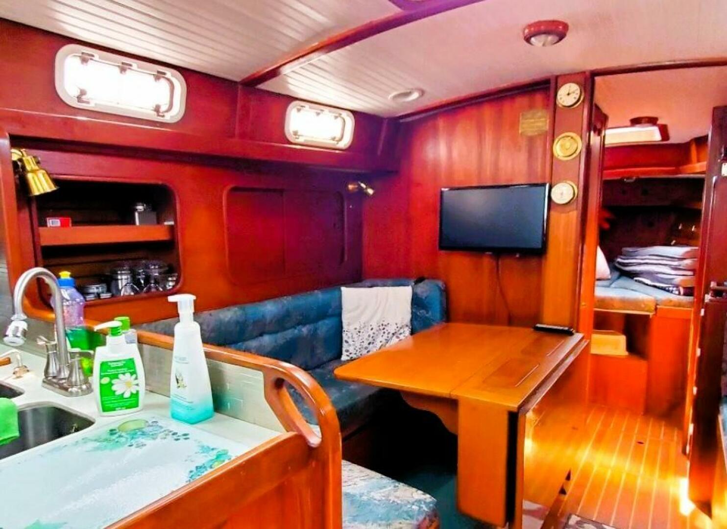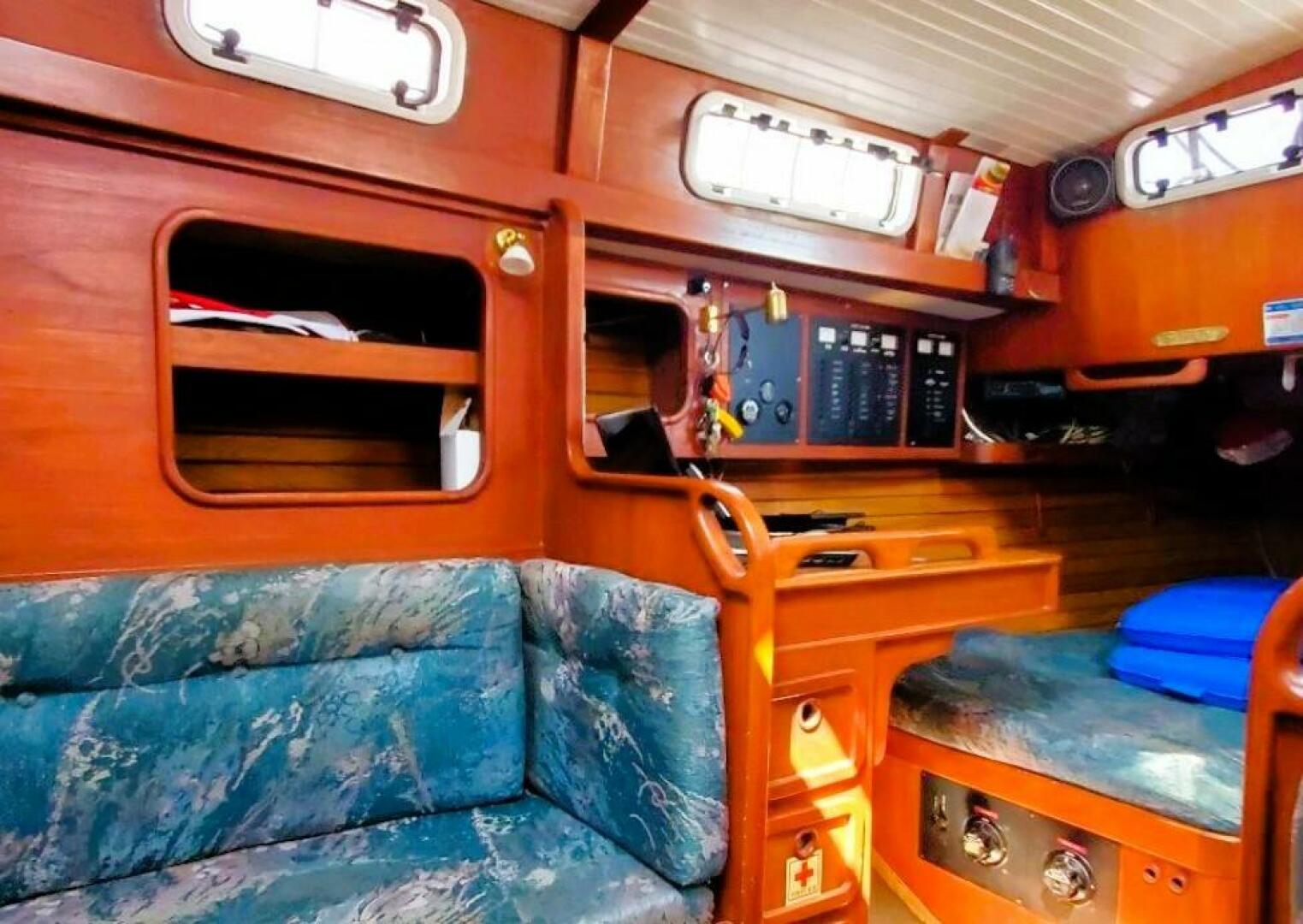 Interior accommodations are generous for a 35 ft vessel: a U-shaped galley with double sink and large ice box or fridge, roomy head and wet locker, fixed drop-leaf cabin table that doubles for storage and serving—crafted for the cruising couple, their guests, or extended itinerant voyages. The broad beam (11′3″) gives more volume than many similar size vessels, and the overall build quality and layout speak to a yacht built for more than weekend hops.