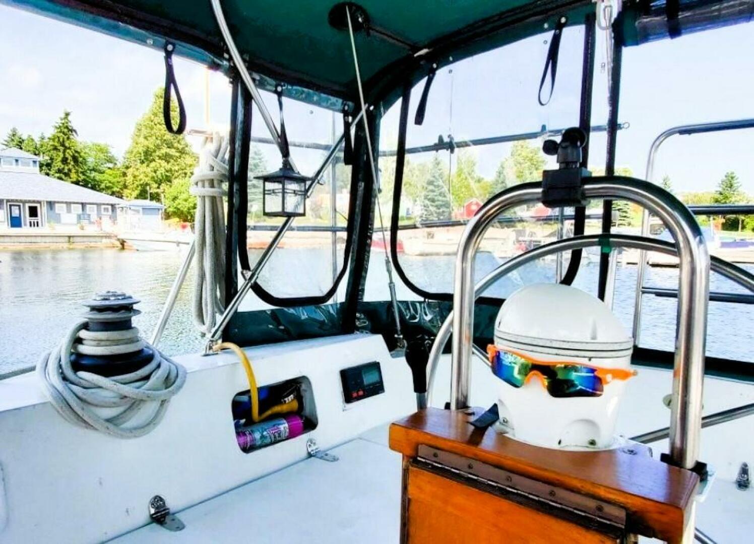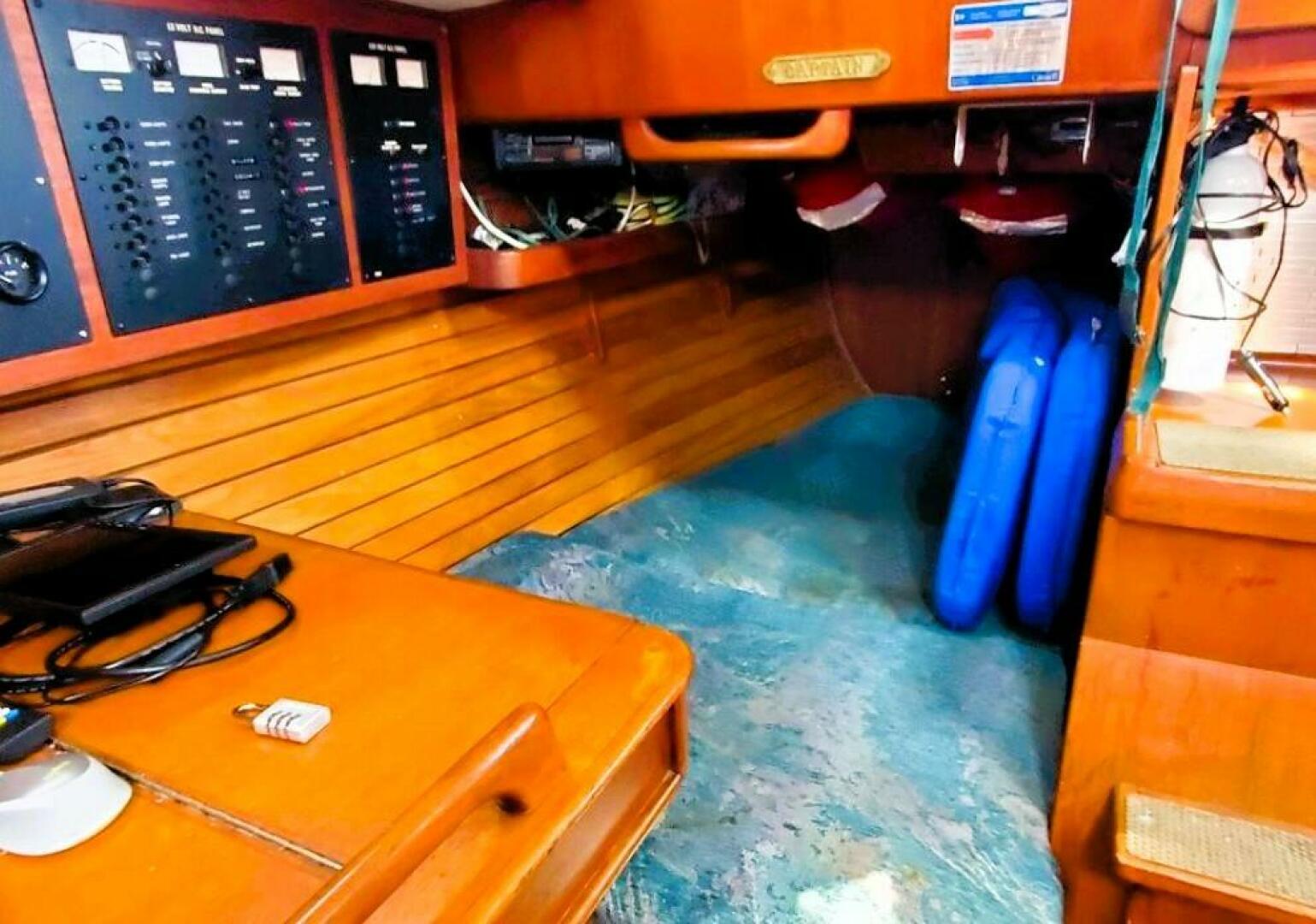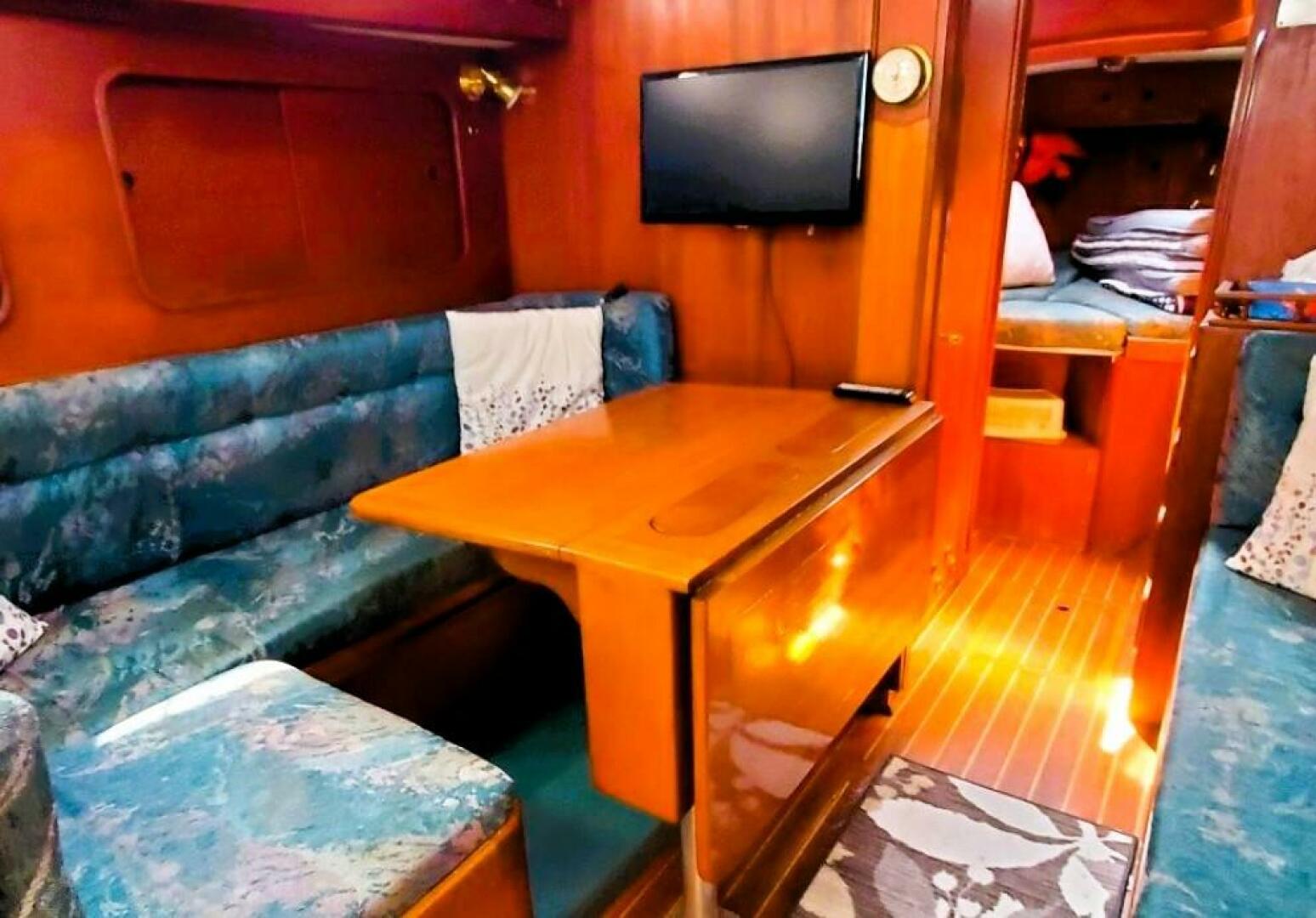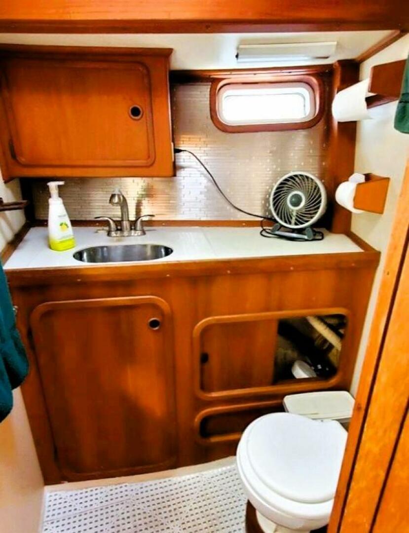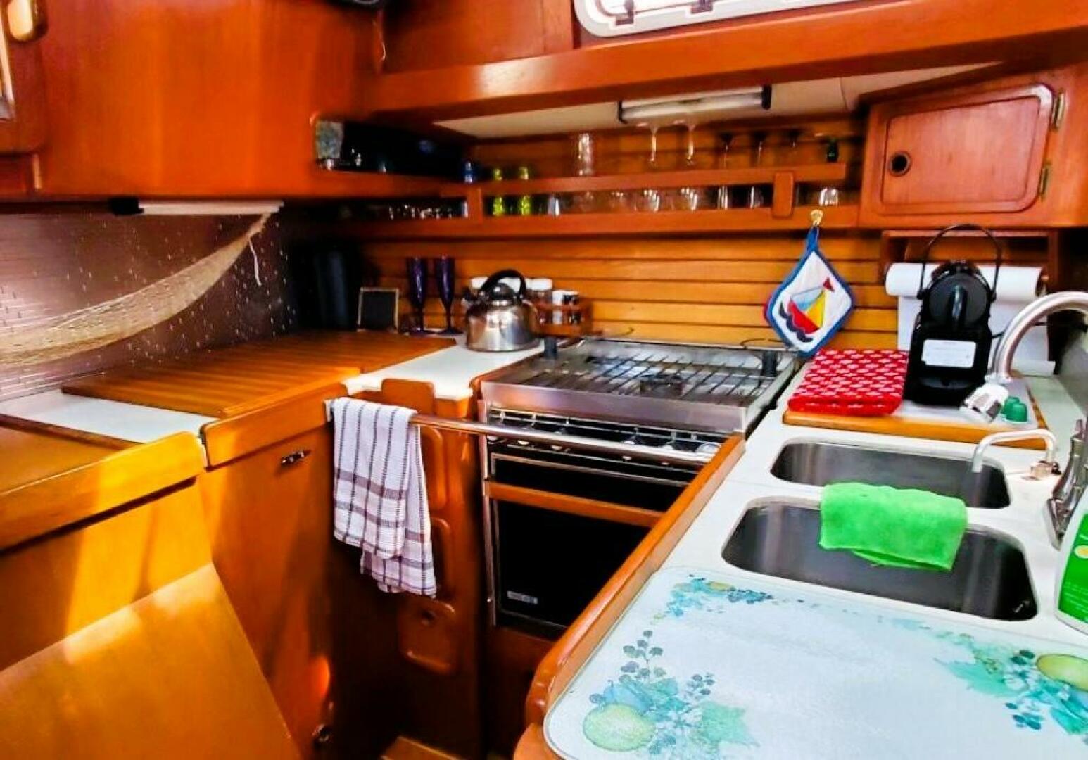 Interior accommodations are generous for a 35 ft vessel: a U-shaped galley with double sink and large ice box or fridge, roomy head and wet locker, fixed drop-leaf cabin table that doubles for storage and serving—crafted for the cruising couple, their guests, or extended itinerant voyages. The broad beam (11′3″) gives more volume than many similar size vessels, and the overall build quality and layout speak to a yacht built for more than weekend hops.
