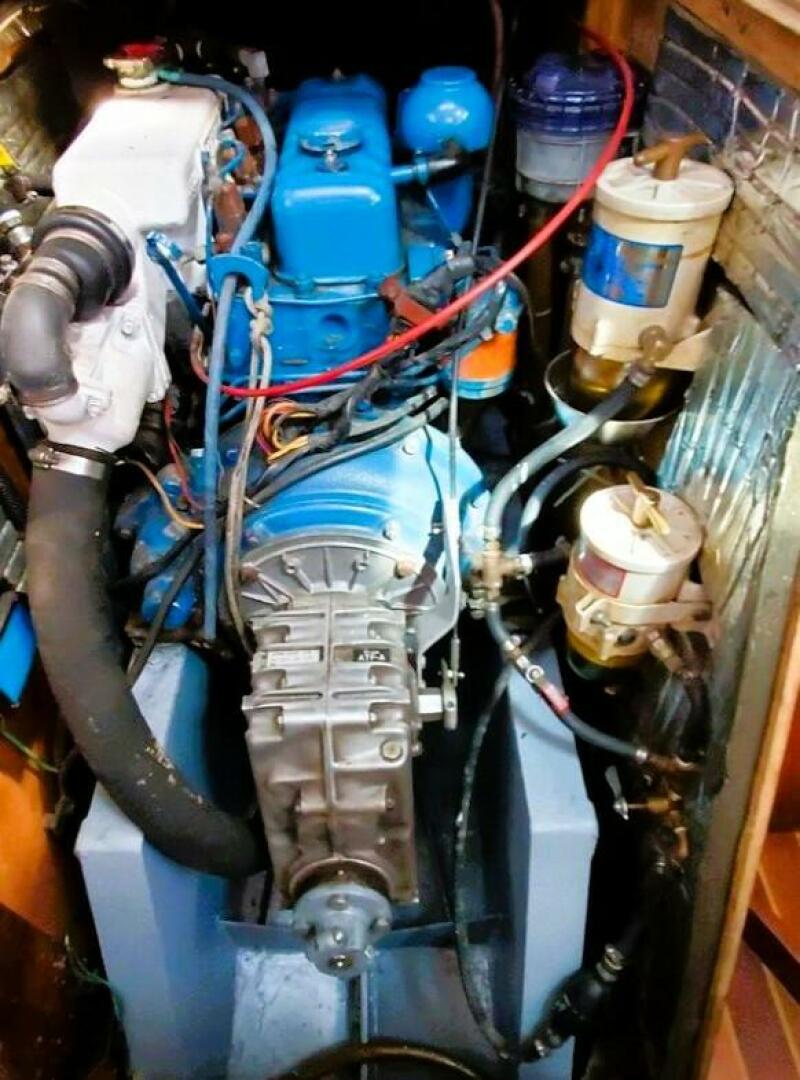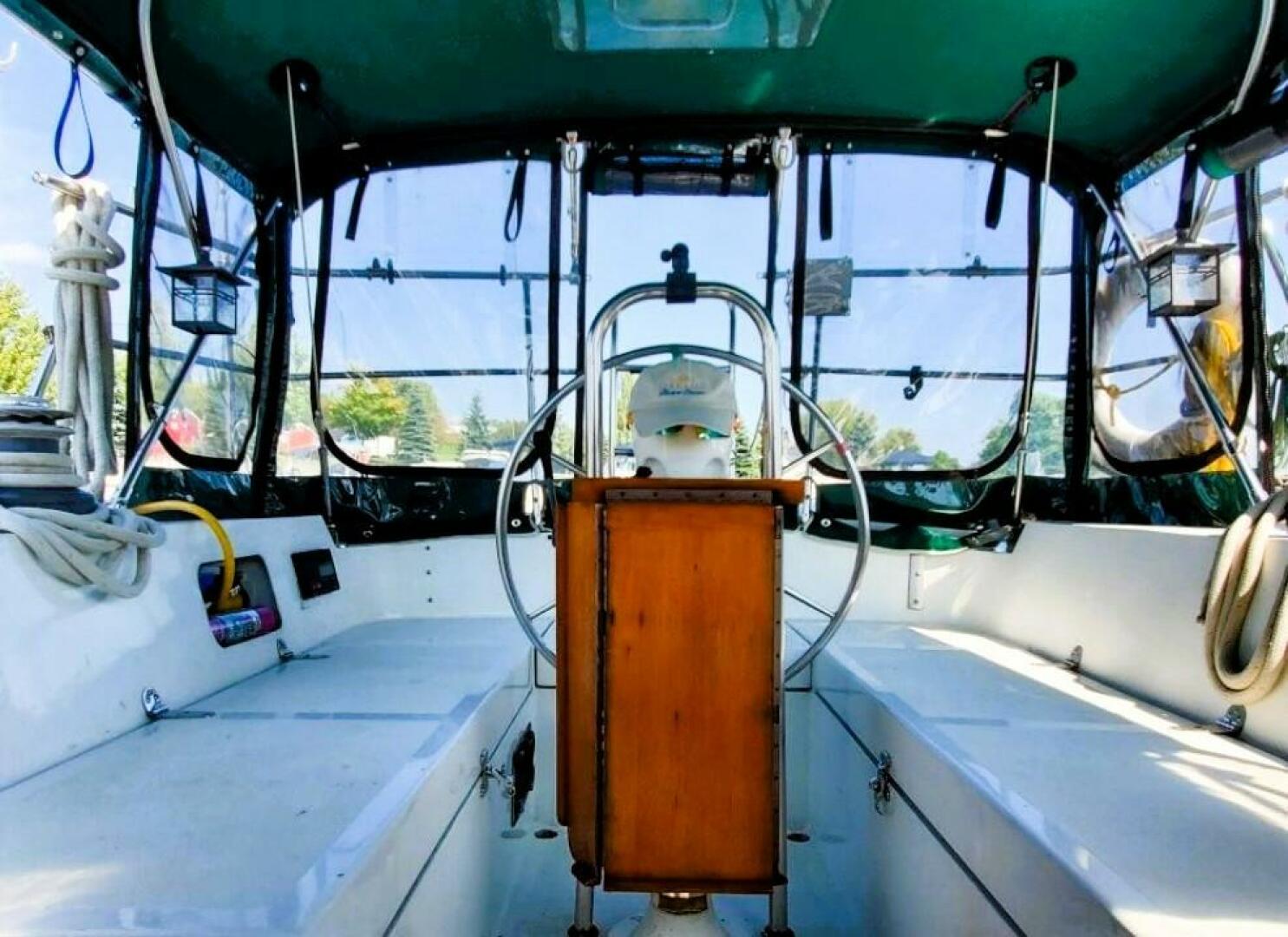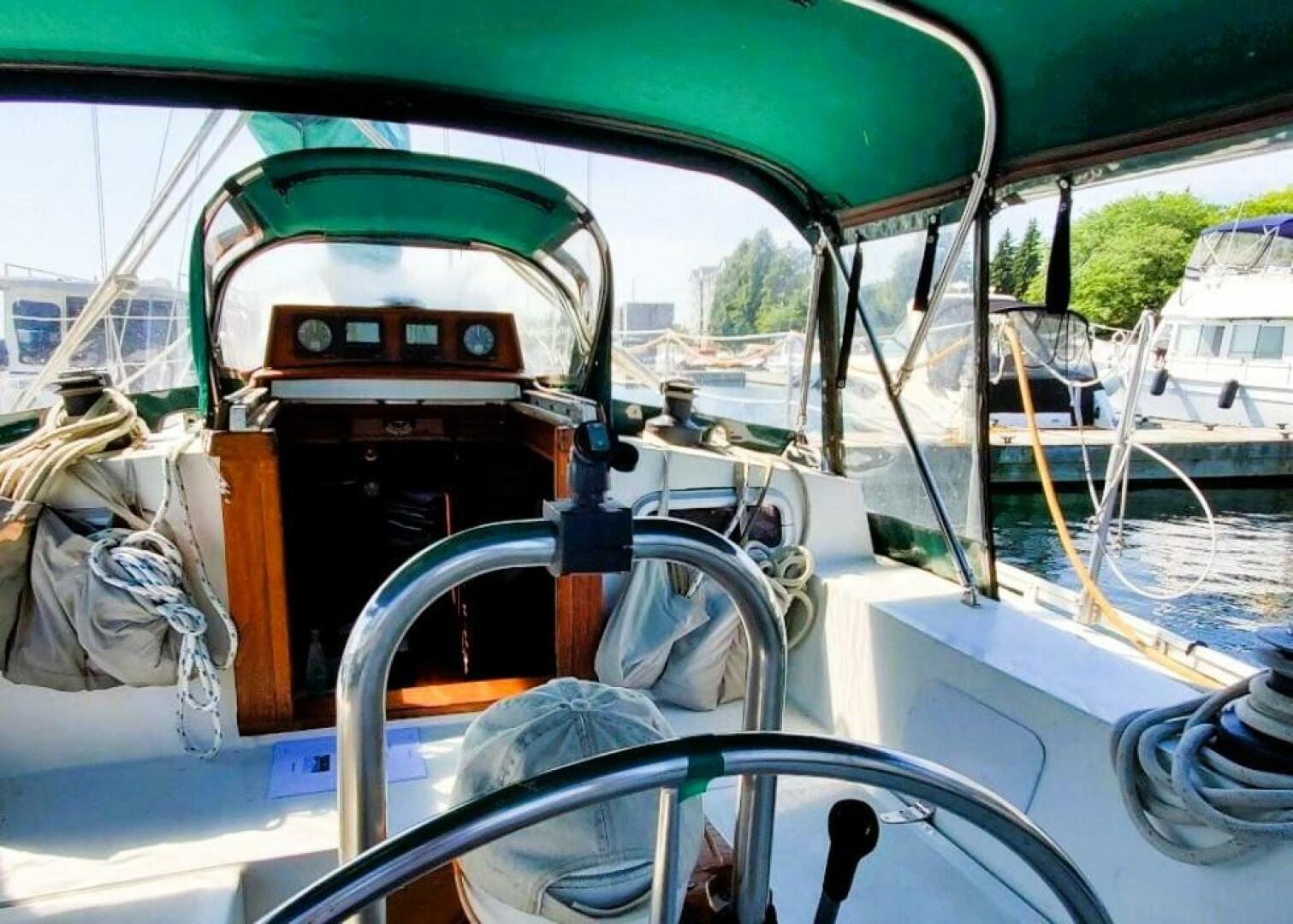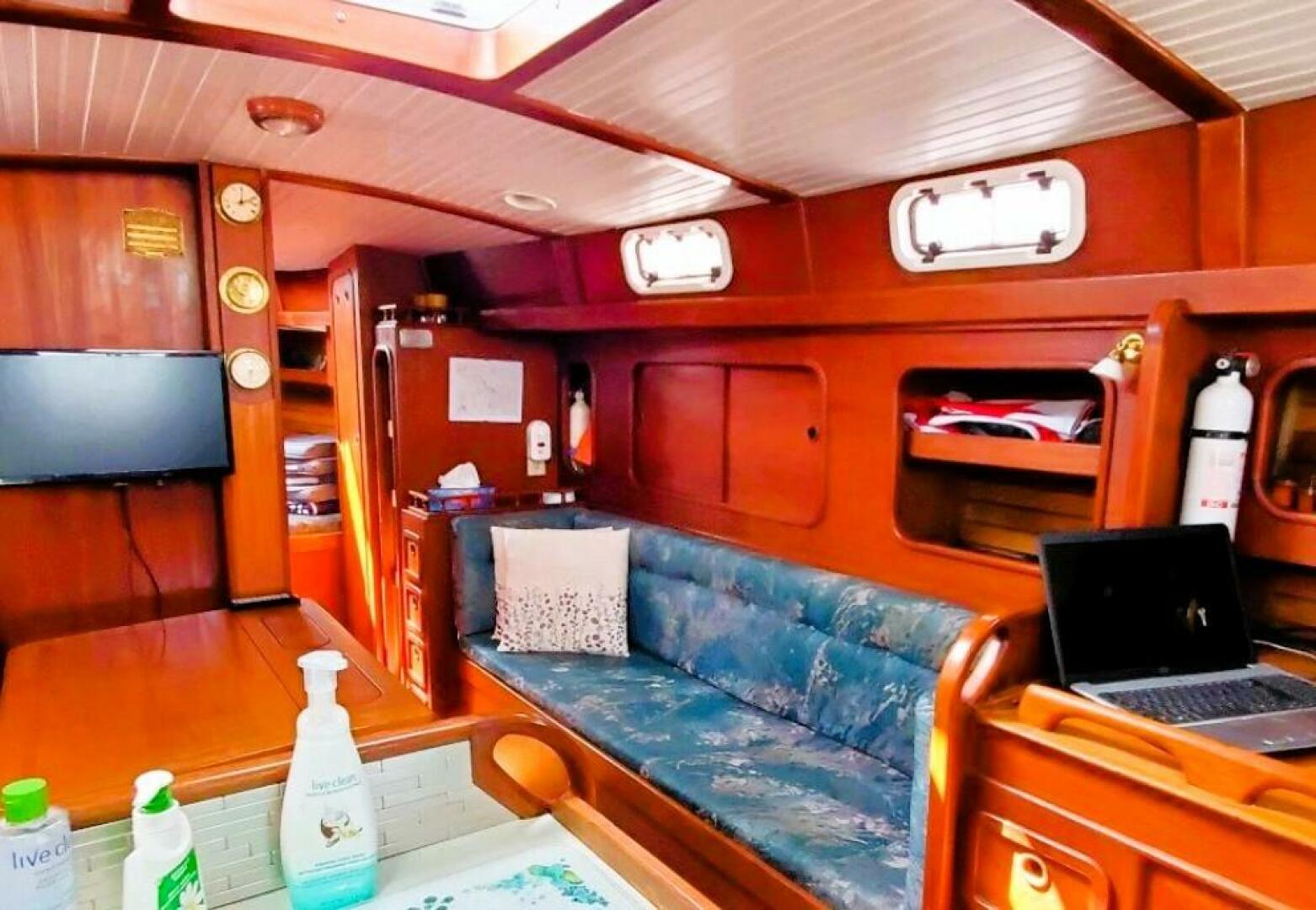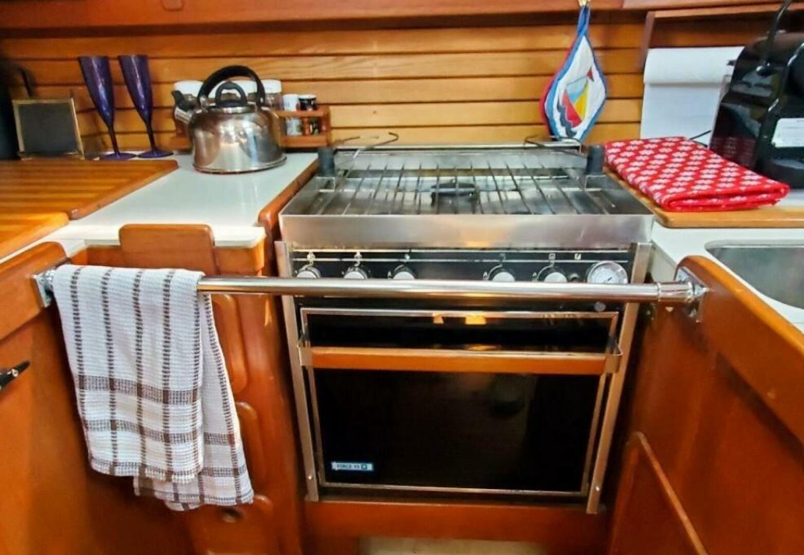 Interior accommodations are generous for a 35 ft vessel: a U-shaped galley with double sink and large ice box or fridge, roomy head and wet locker, fixed drop-leaf cabin table that doubles for storage and serving—crafted for the cruising couple, their guests, or extended itinerant voyages. The broad beam (11′3″) gives more volume than many similar size vessels, and the overall build quality and layout speak to a yacht built for more than weekend hops.
