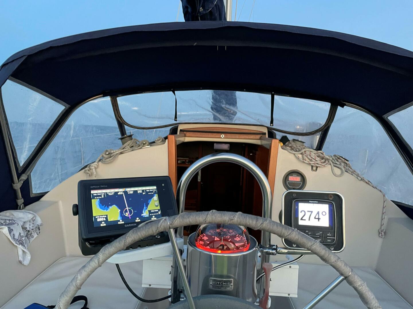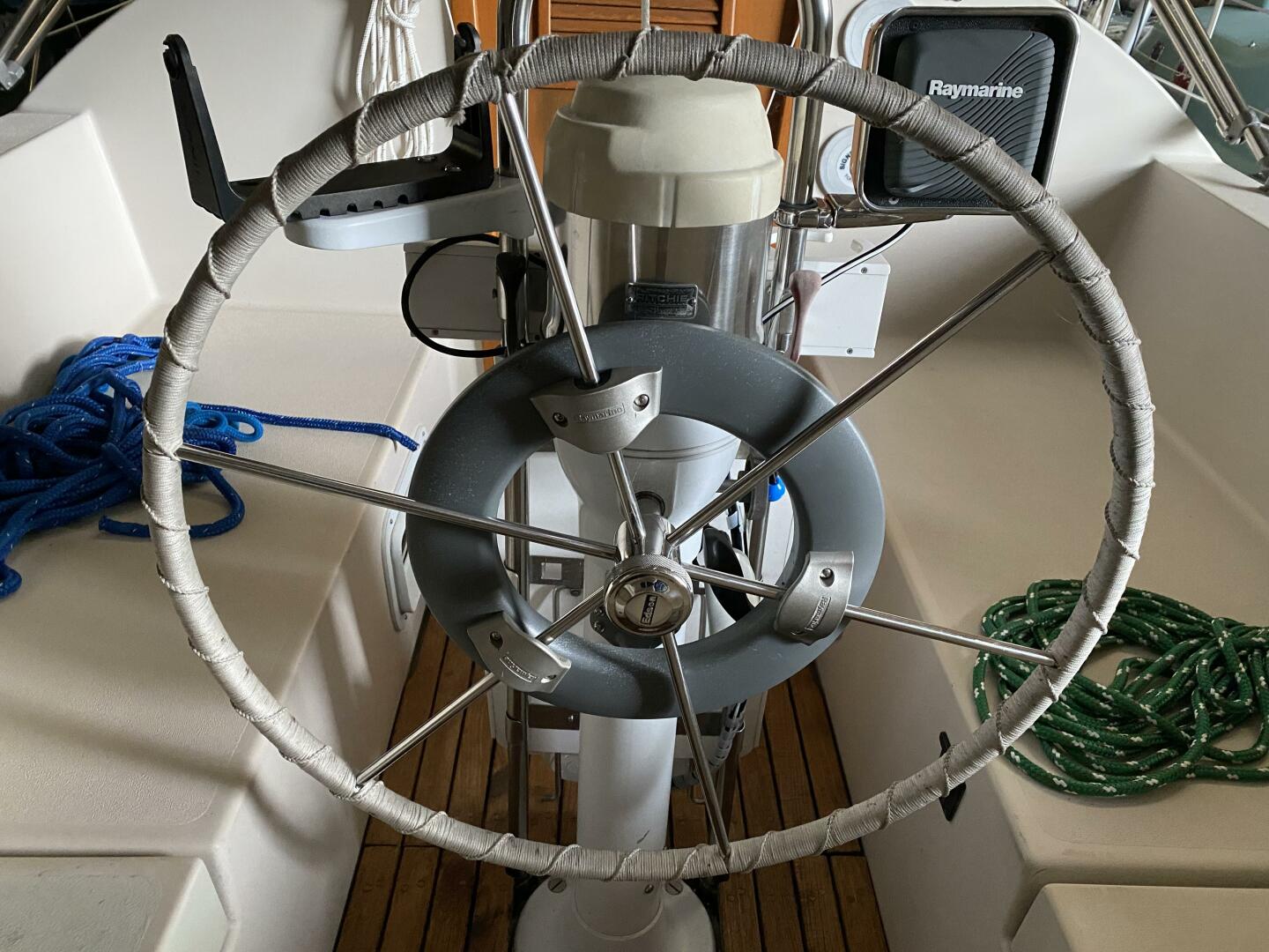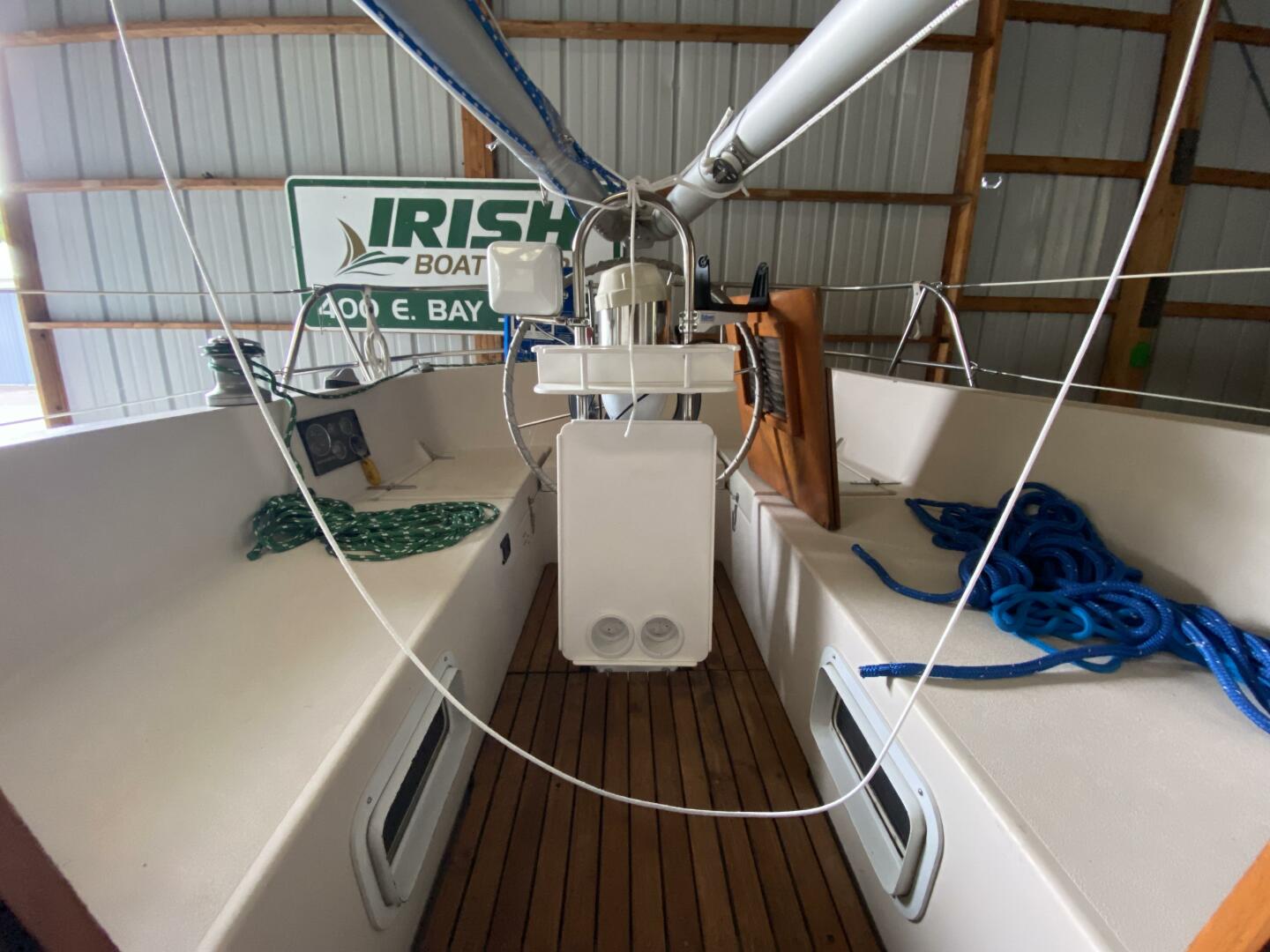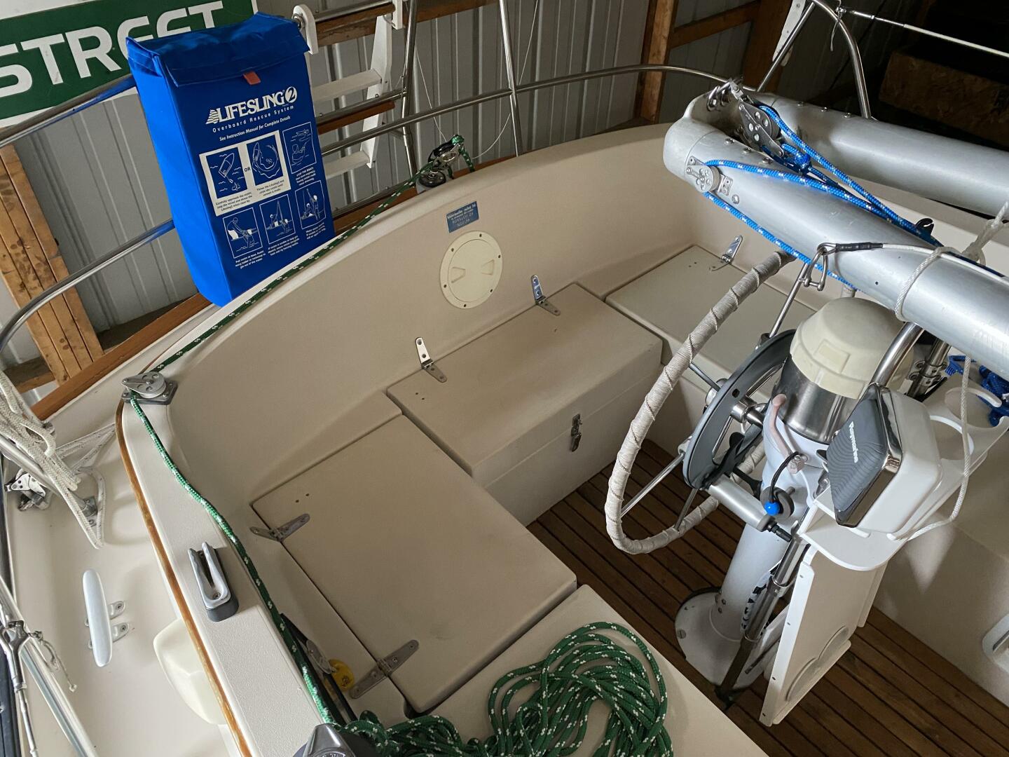 The main halyard is led aft to a Barient No. 18 winch and cleat on the port side of the cabin house. The two inboard reef lines lead aft to cleats on the port cabin top. The two outboard reef lines lead to a Barient No. 8P winch on the starboard side and the wishbone control line ("choker") and topping lift lead aft through sheet stoppers to a separate Barient No. 8P winch outboard to starboard. There are seat hatches in each side with deep divided stowage bins. A Barient No. 17 self-tailing winch for the main sheet is located on the starboard coaming.