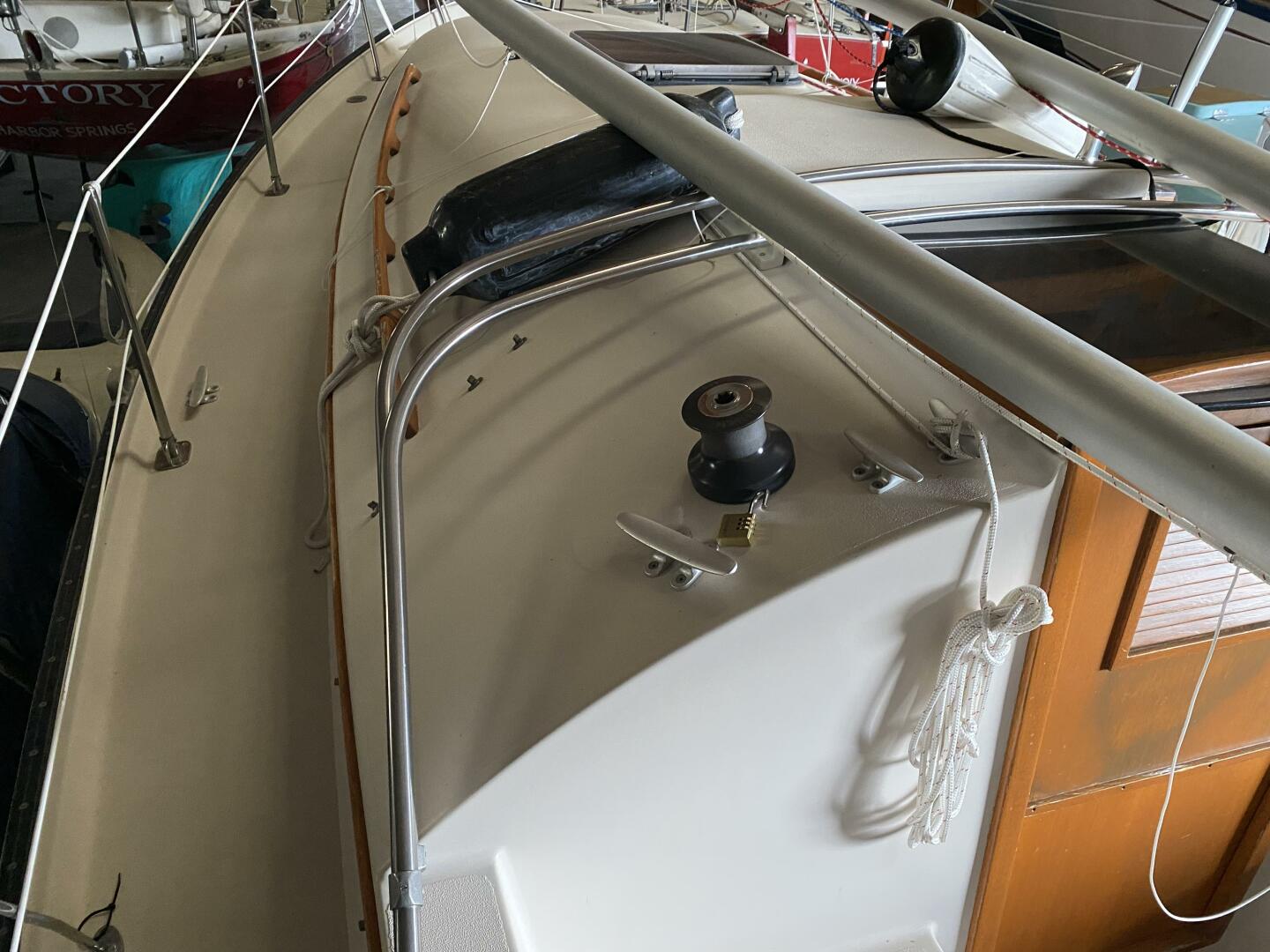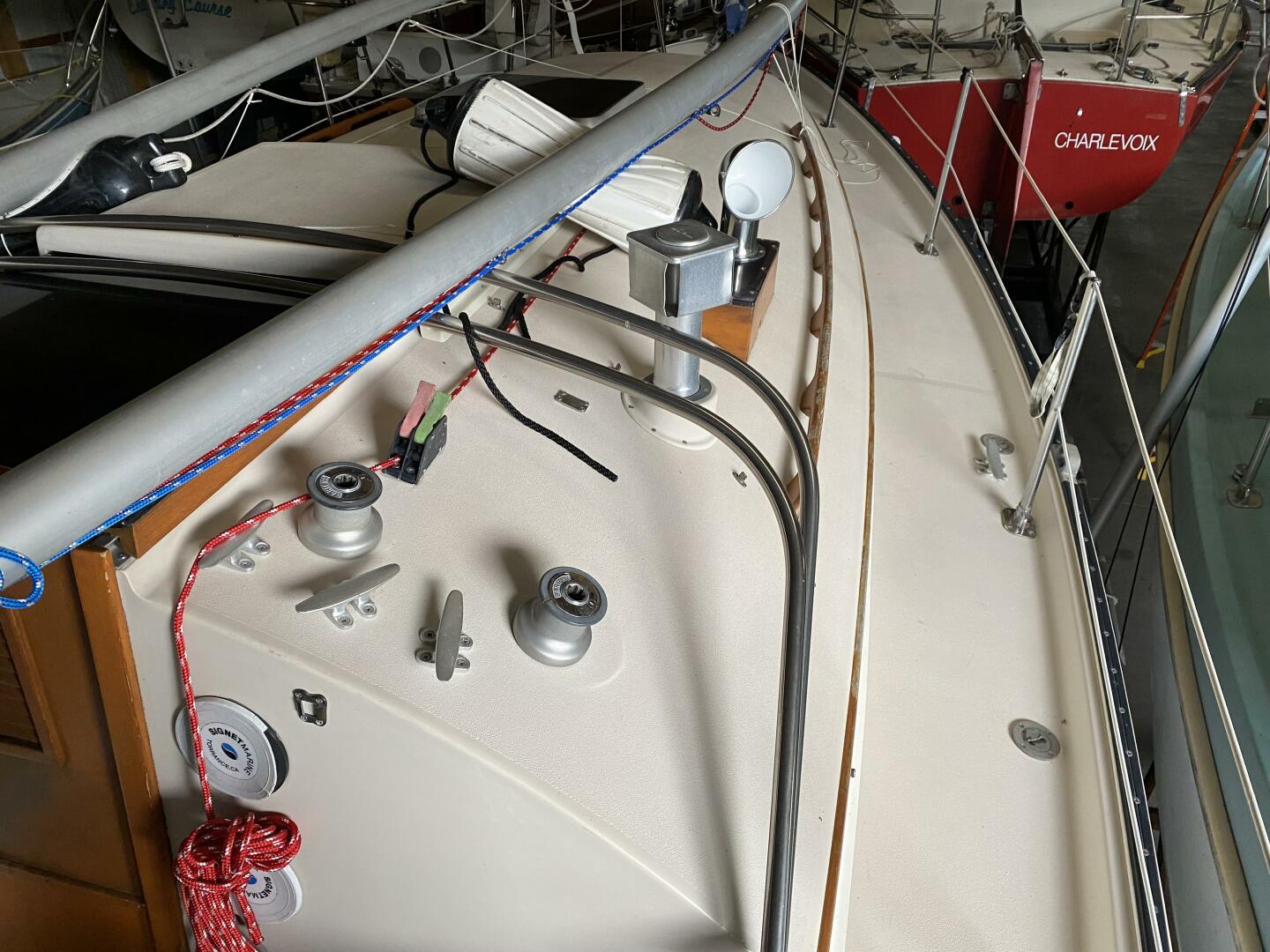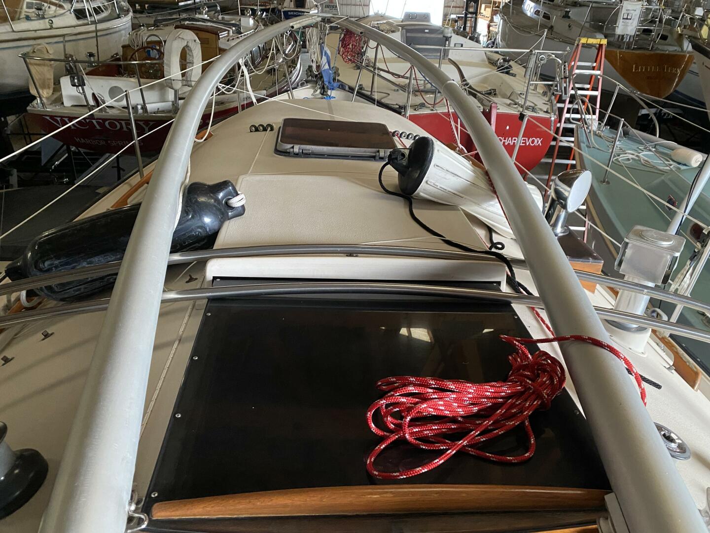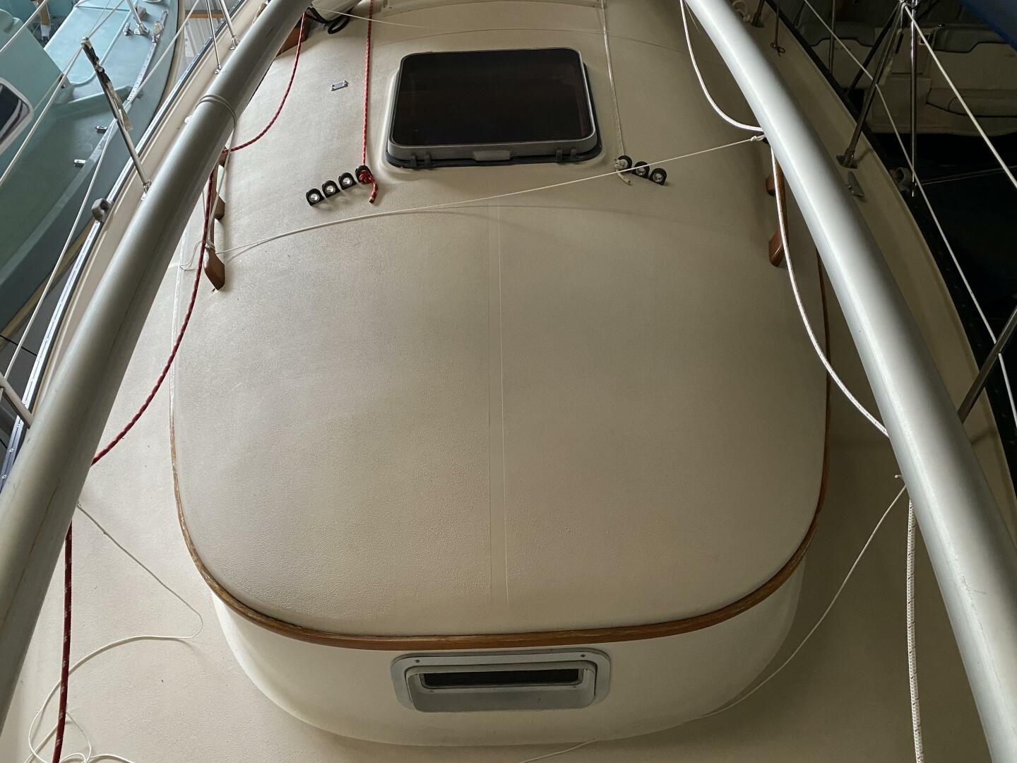 The boat has a full length vinyl rub rail with an anodized aluminum toe rail through bolted to the deck and hull for a strong and watertight construction. The cast aluminum bow fitting has an integral mooring bit. There is a double rail bow pulpit and double rail stern pulpit with integral boarding ladder with teak steps. Vinyl coated 7 x 19 stainless steel wire lifelines lead through stainless steel stanchions whose stainless steel bases are through-bolted to the deck. There are six closed chocks and cleats, including two springline cleats amid- ships. The boat has a large aluminum framed translucent skylight hatch and seven aluminum framed translucent opening ports with screens. The translucent sliding companionway hatch is fitted with a molded spray hood. Two large side deck scuppers lead to through-hulls near the waterline.
