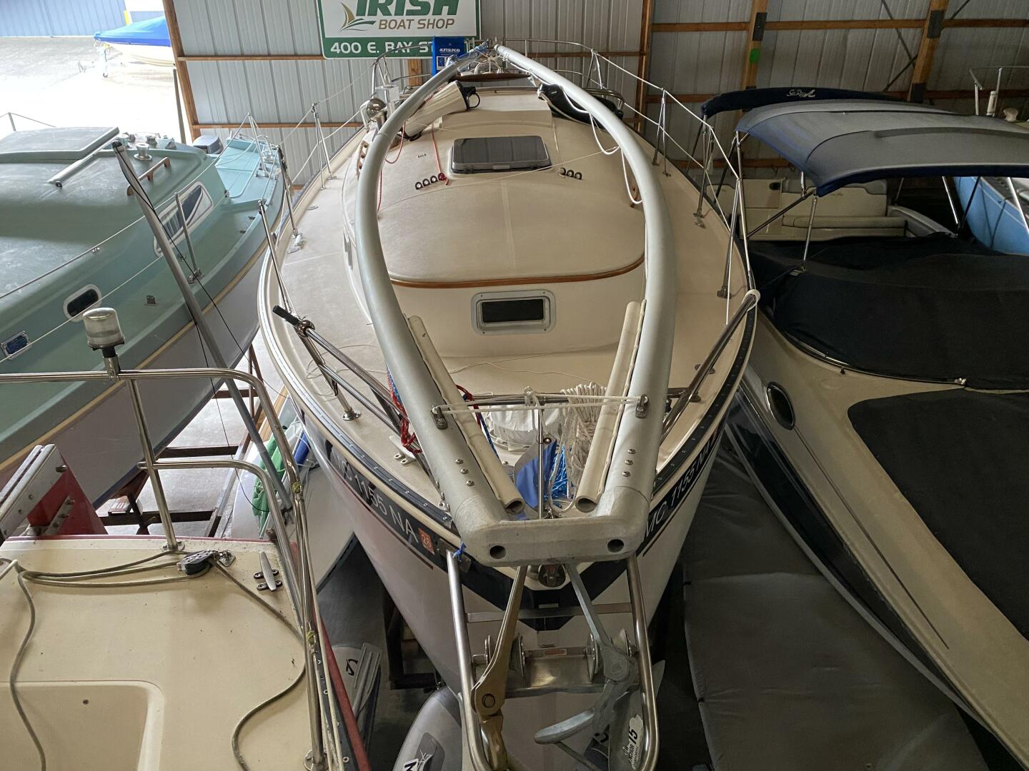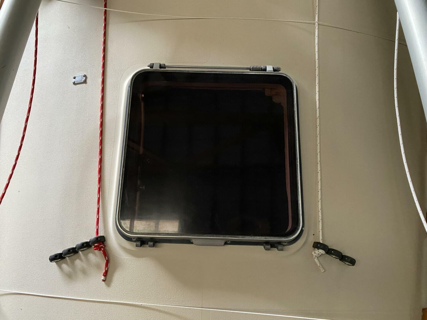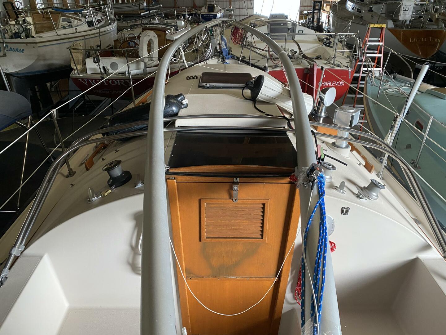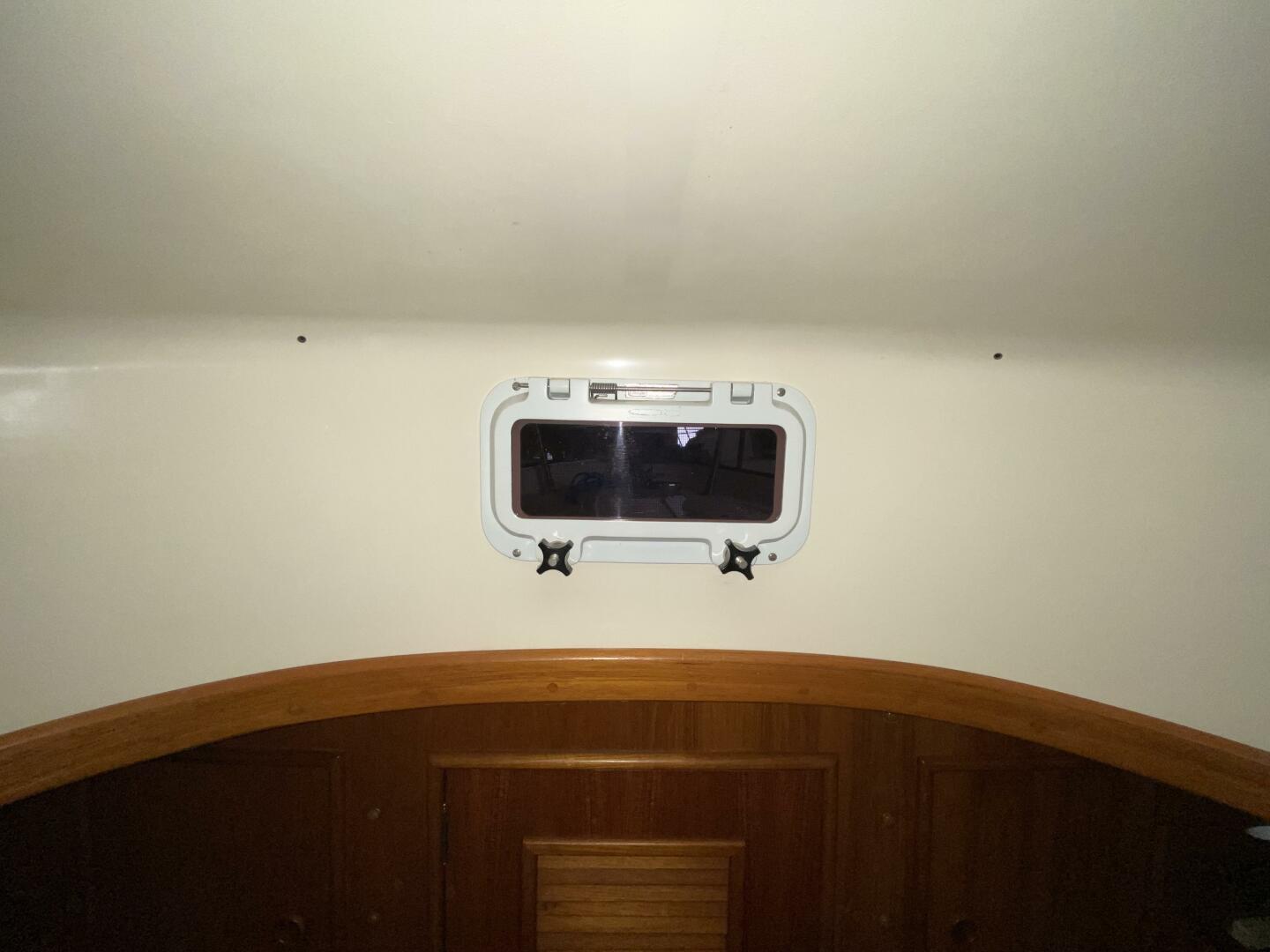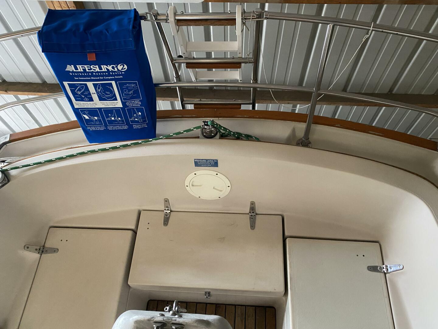 The boat has a full length vinyl rub rail with an anodized aluminum toe rail through bolted to the deck and hull for a strong and watertight construction. The cast aluminum bow fitting has an integral mooring bit. There is a double rail bow pulpit and double rail stern pulpit with integral boarding ladder with teak steps. Vinyl coated 7 x 19 stainless steel wire lifelines lead through stainless steel stanchions whose stainless steel bases are through-bolted to the deck. There are six closed chocks and cleats, including two springline cleats amid- ships. The boat has a large aluminum framed translucent skylight hatch and seven aluminum framed translucent opening ports with screens. The translucent sliding companionway hatch is fitted with a molded spray hood. Two large side deck scuppers lead to through-hulls near the waterline.