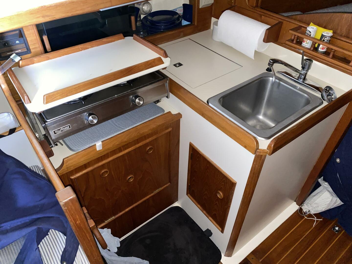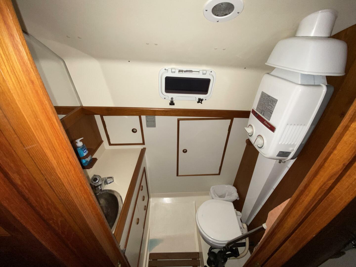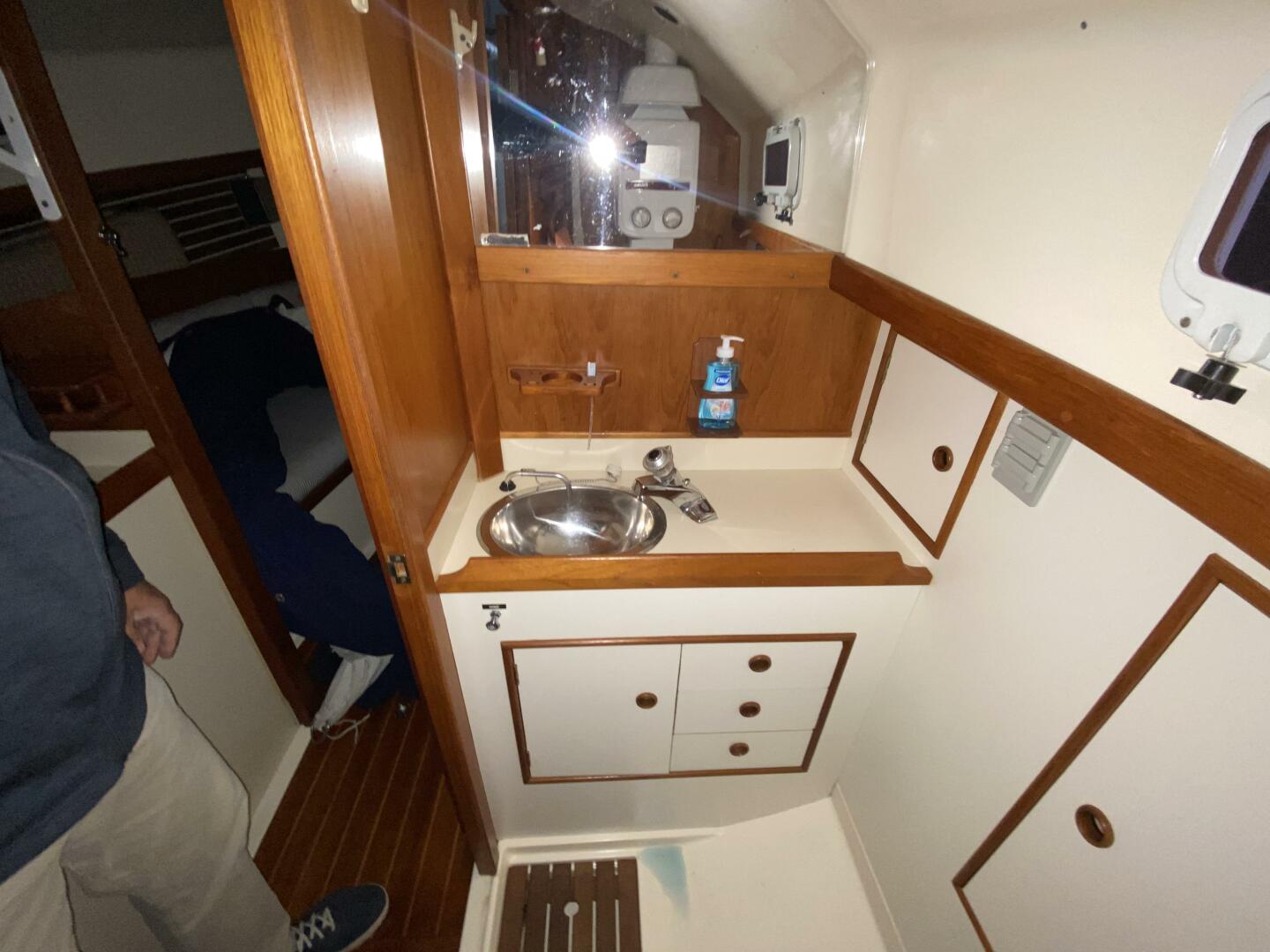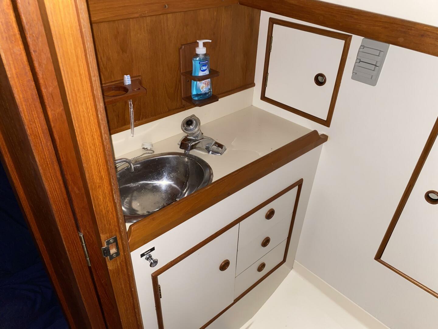 Just aft of the port settee is a large galley with gimballed two-burner stove, icebox, with refrigeration, sink, and fully fiddled arborite countertop with splash guard, two drawers, and four large lockers. Just aft of the starboard settee is a fully enclosed head with marine toilet, fully fiddled arborite vanity top with oval stainless steel sink and a large plate glass mirror. There are three drawers and a locker under the vanity and a large locker with a shelf at its outboard end. Also outboard is a large hanging locker. A molded shower sump with teak grating is fitted in the sole.