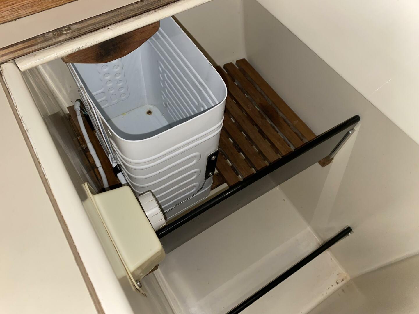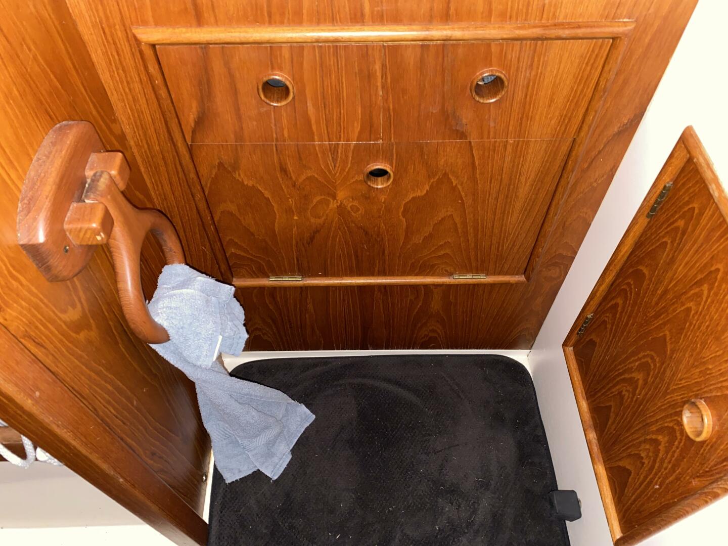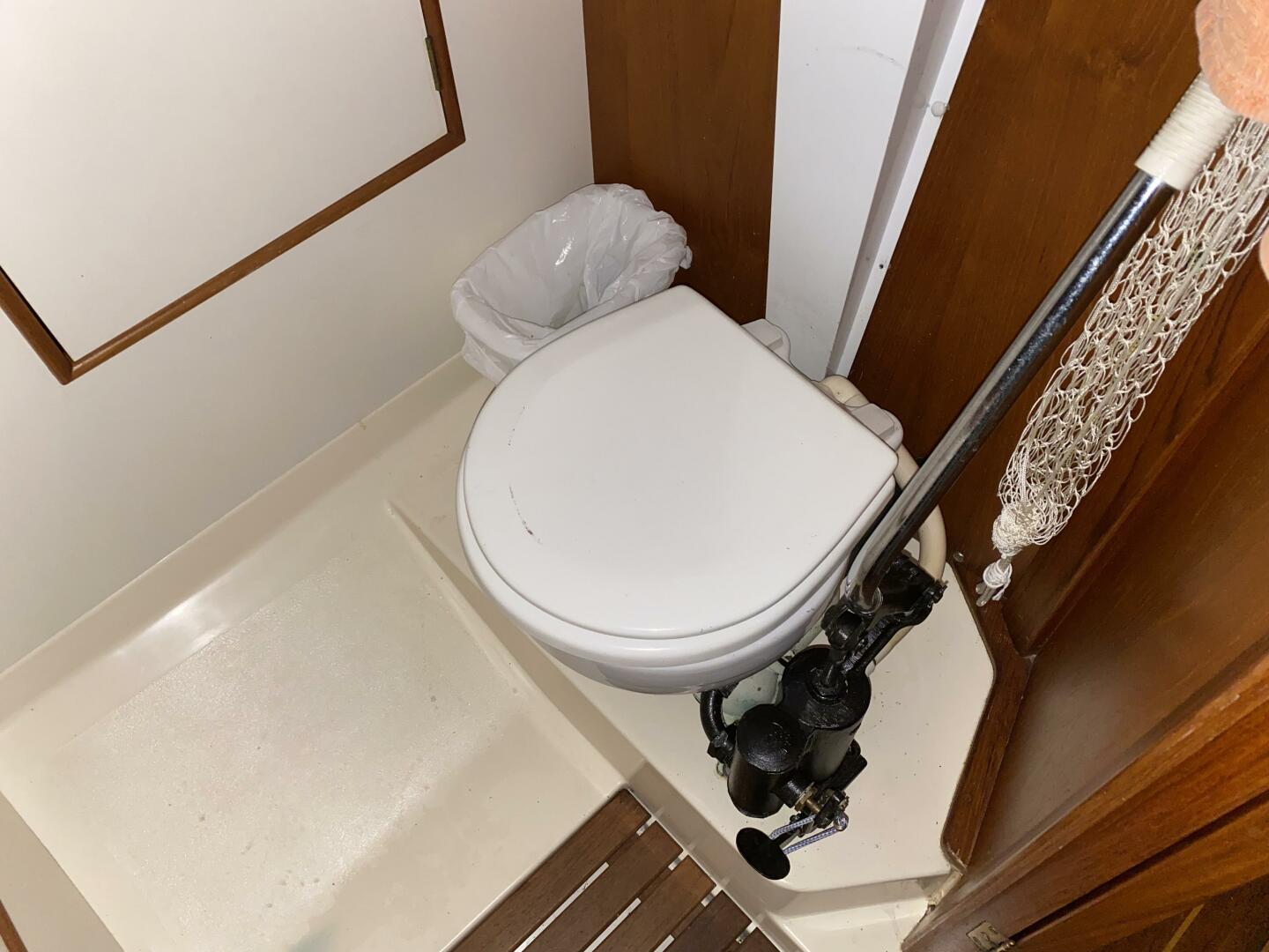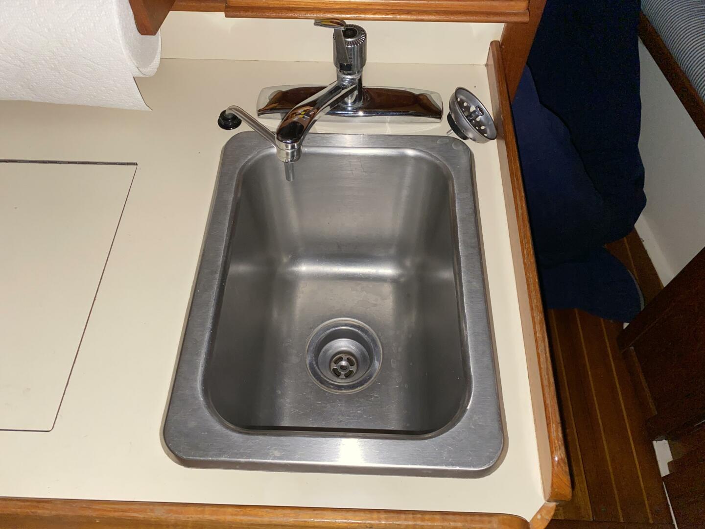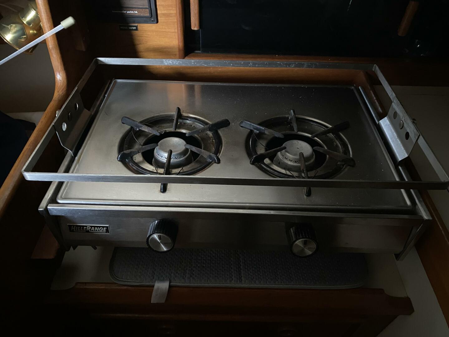 Just aft of the port settee is a large galley with gimballed two-burner stove, icebox, with refrigeration, sink, and fully fiddled arborite countertop with splash guard, two drawers, and four large lockers. Just aft of the starboard settee is a fully enclosed head with marine toilet, fully fiddled arborite vanity top with oval stainless steel sink and a large plate glass mirror. There are three drawers and a locker under the vanity and a large locker with a shelf at its outboard end. Also outboard is a large hanging locker. A molded shower sump with teak grating is fitted in the sole.