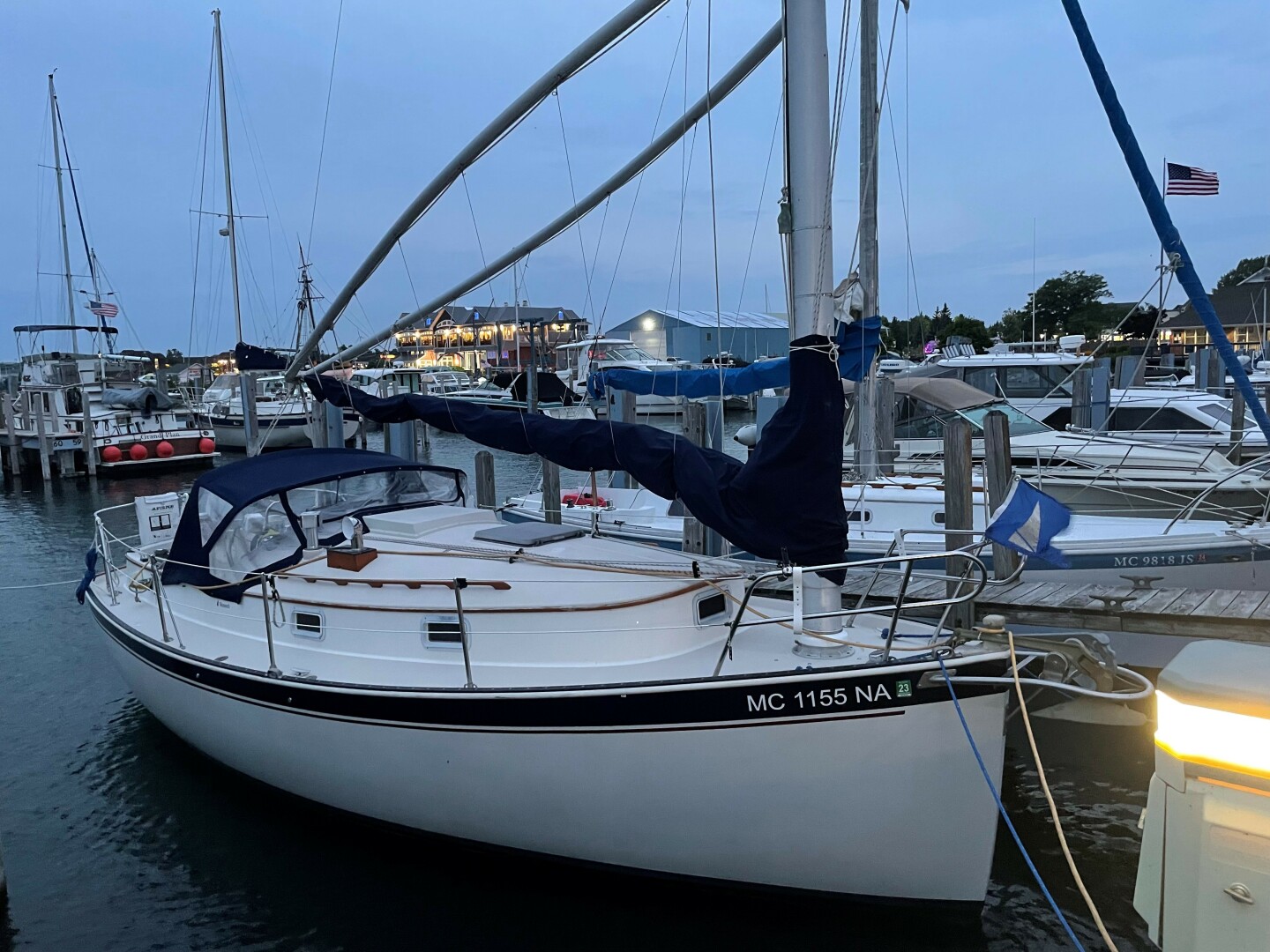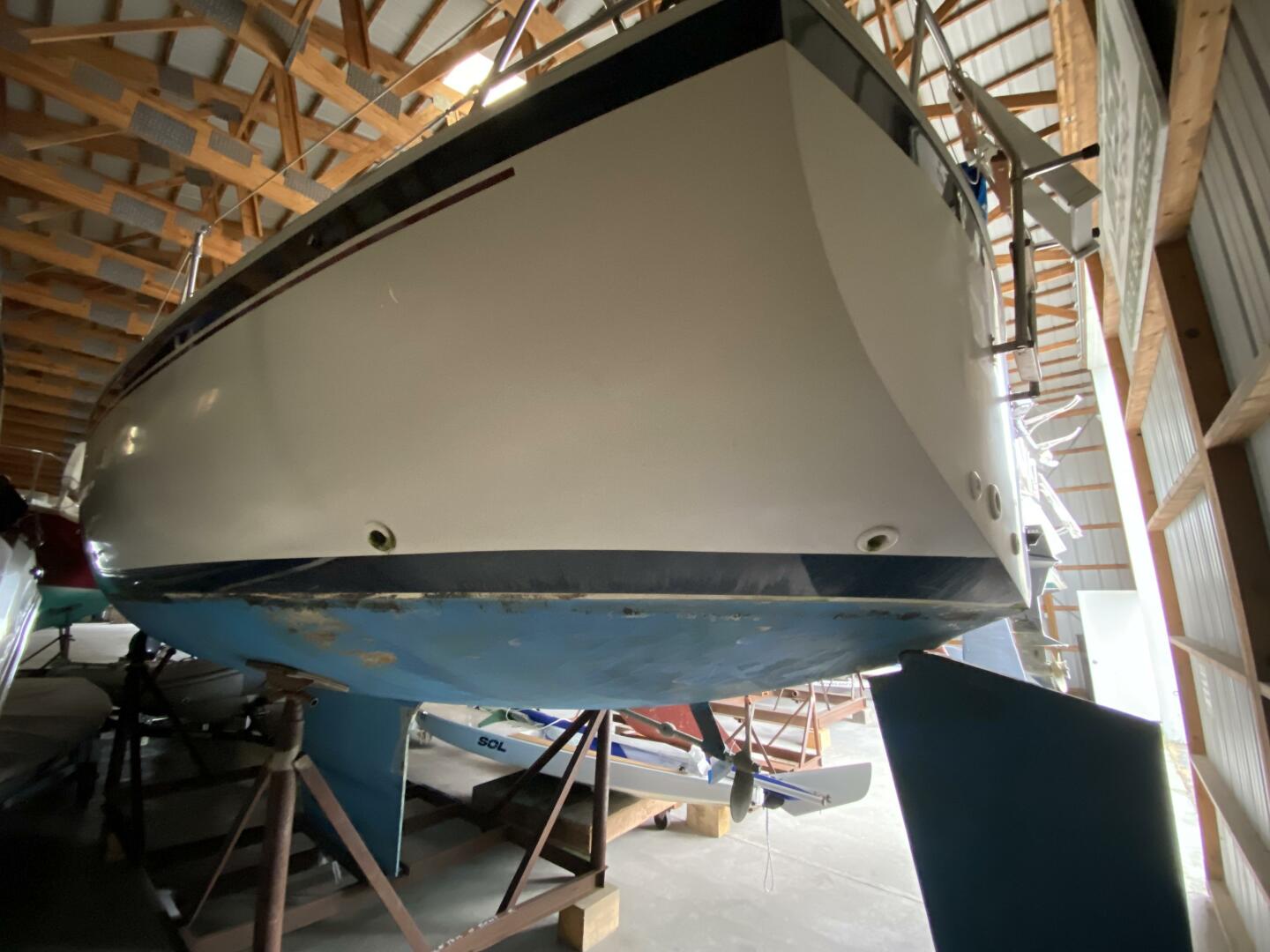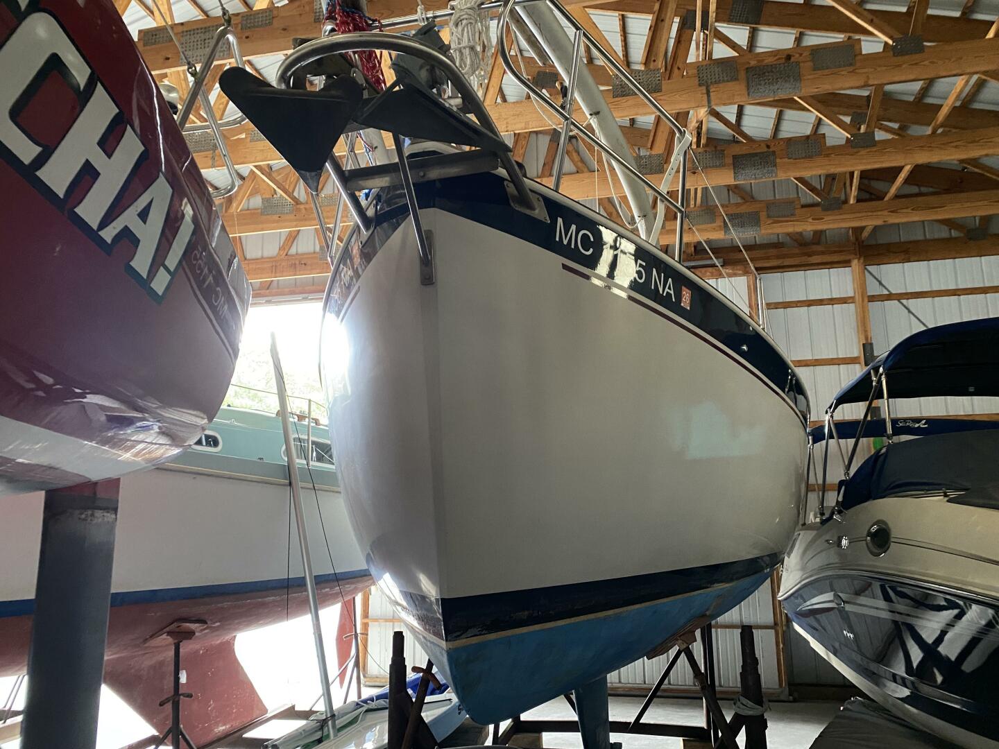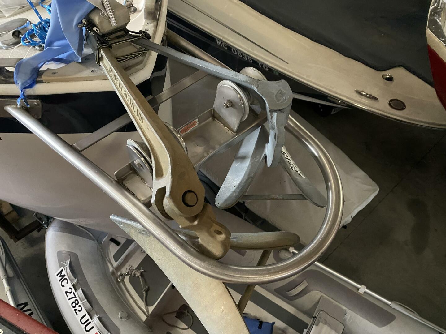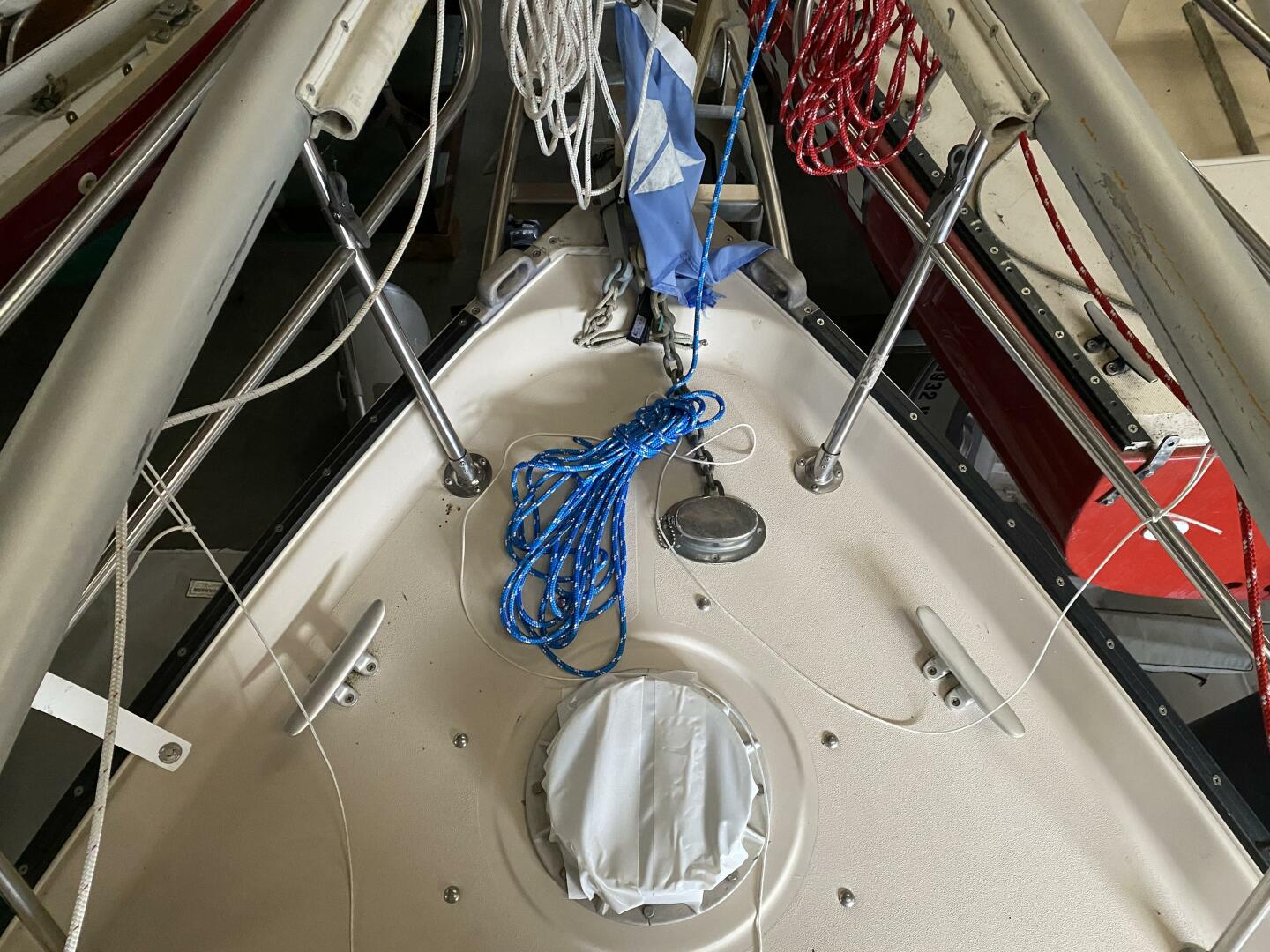 The mast is a spun tapered free-standing anodized aluminum spar with an anodized masthead casting and aluminum halyard sheave. The halyard is low-stretch Dacron. The running rigging was replaced recently. The mast has a PVC wiring duct and is grounded directly to the keel. The wishbone boom is a roll-formed anodized aluminum tubular assembly with aluminum end castings hung from the mast with vinyl coated 7 x 19 stainless steel cables.