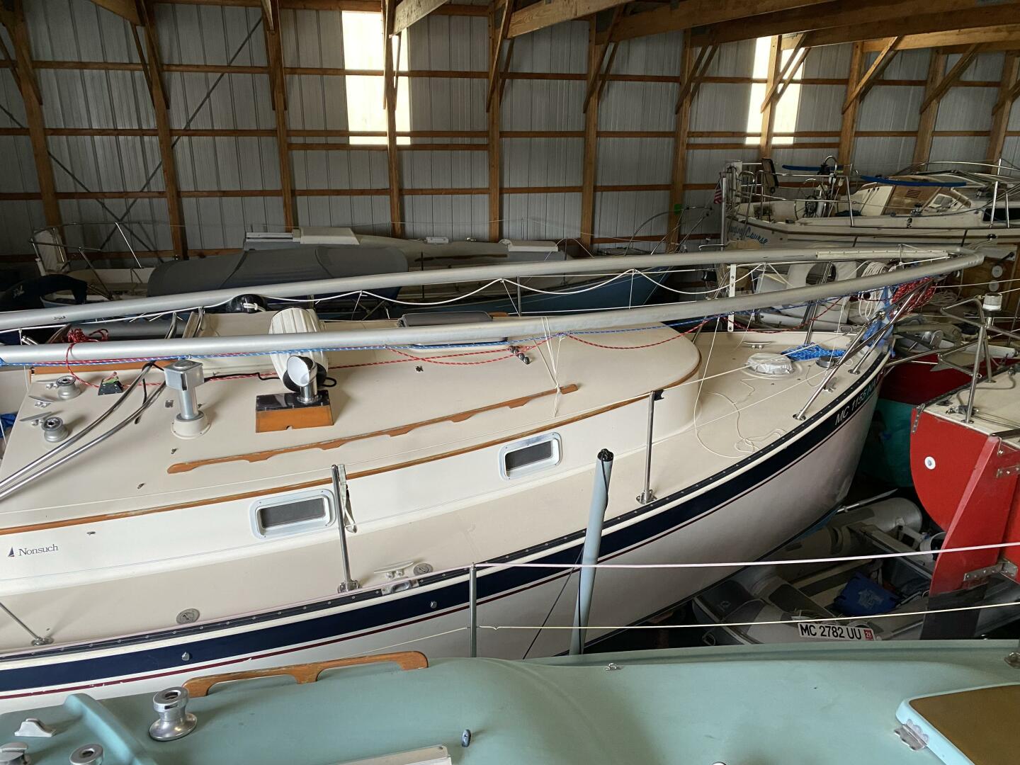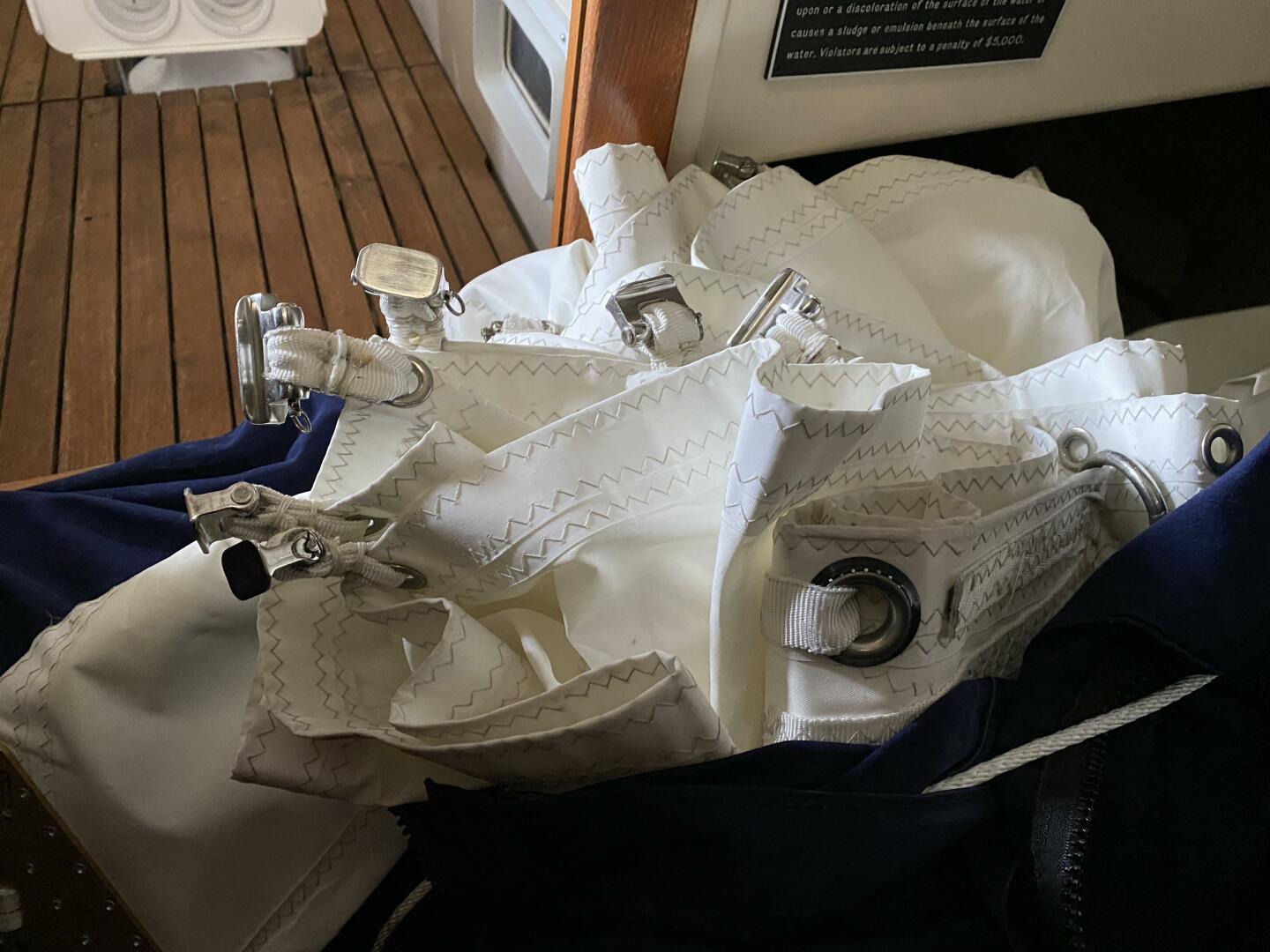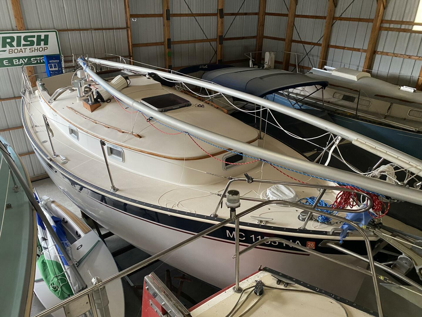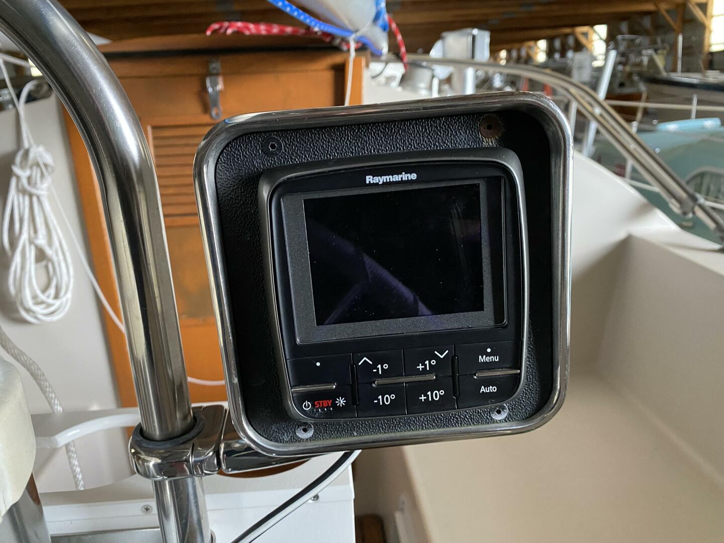 The mast is a spun tapered free-standing anodized aluminum spar with an anodized masthead casting and aluminum halyard sheave. The halyard is low-stretch Dacron. The running rigging was replaced recently. The mast has a PVC wiring duct and is grounded directly to the keel. The wishbone boom is a roll-formed anodized aluminum tubular assembly with aluminum end castings hung from the mast with vinyl coated 7 x 19 stainless steel cables.