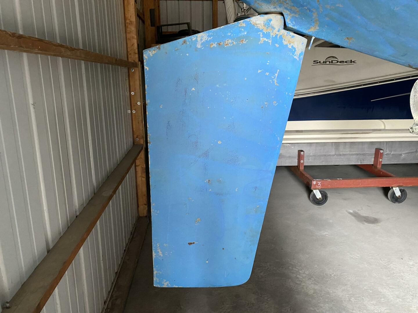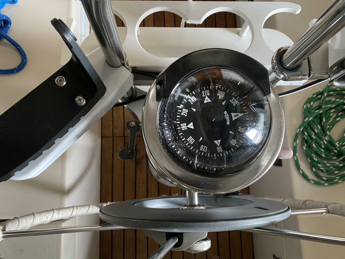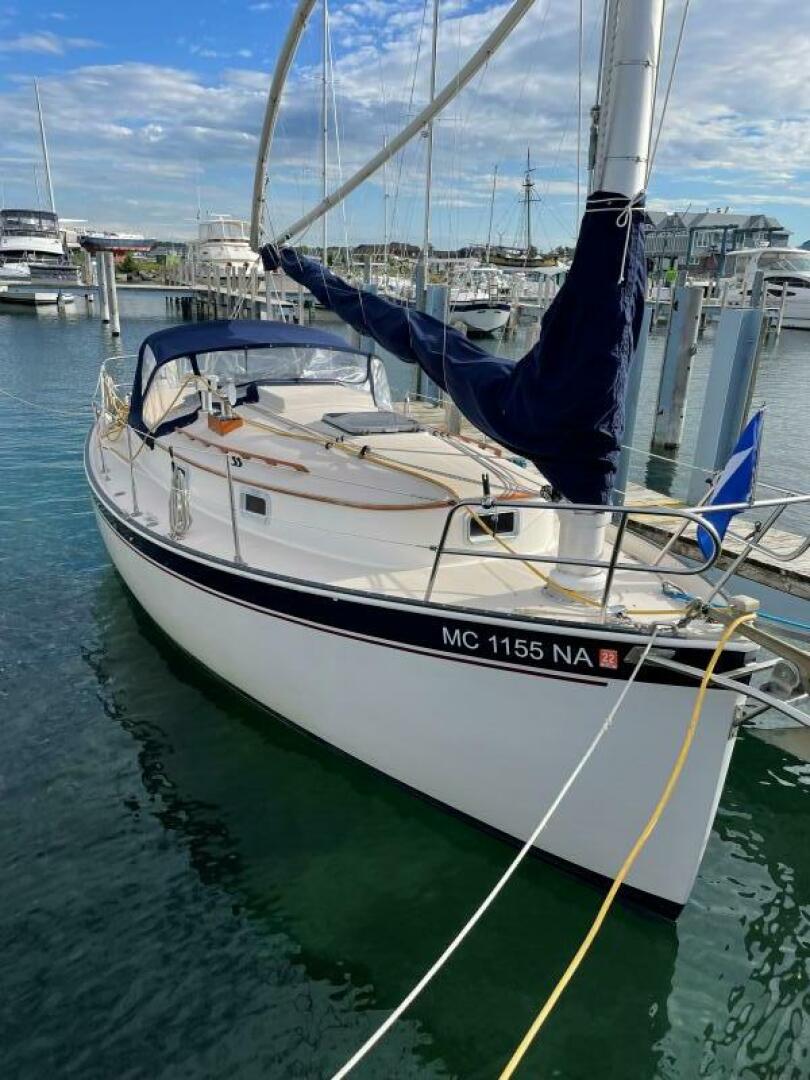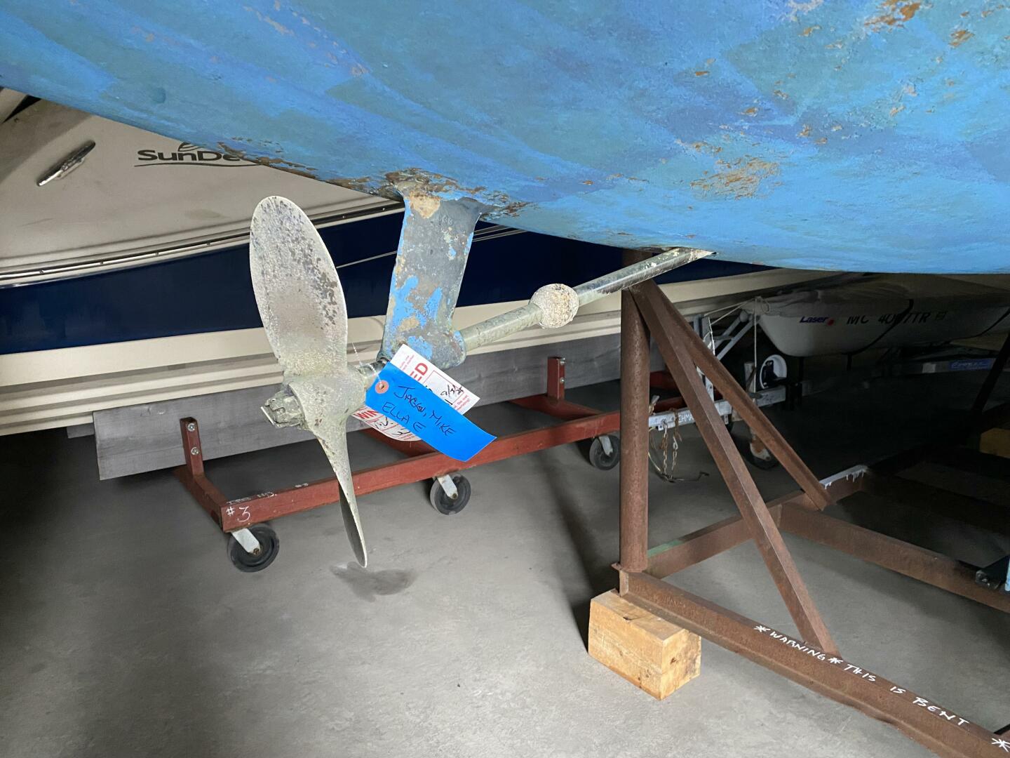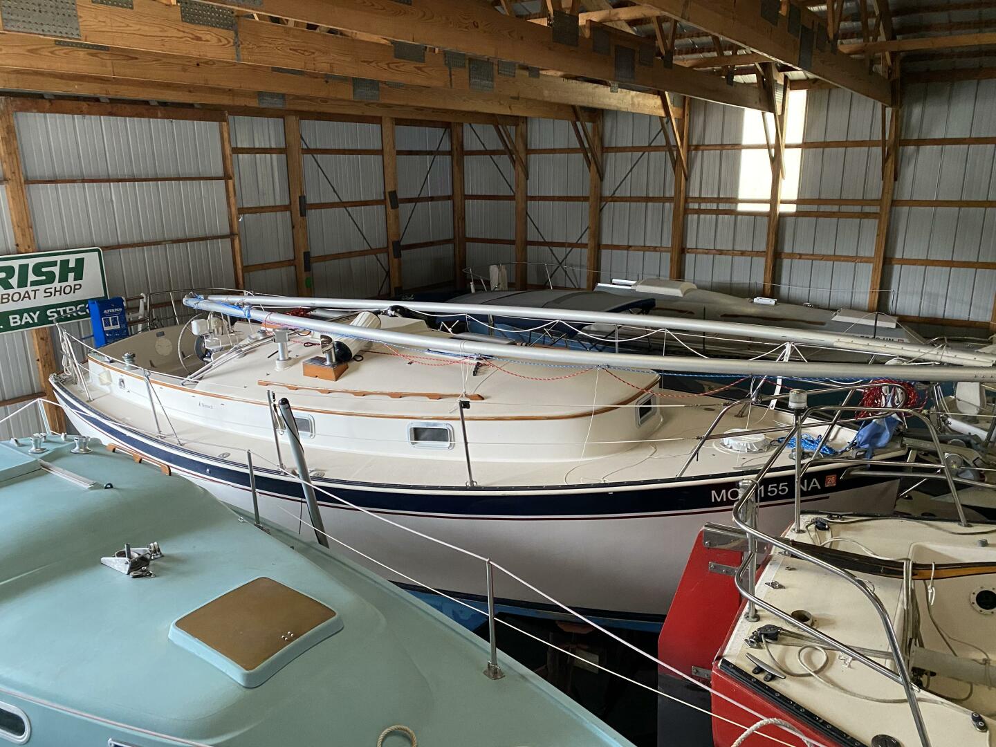 The mast is a spun tapered free-standing anodized aluminum spar with an anodized masthead casting and aluminum halyard sheave. The halyard is low-stretch Dacron. The running rigging was replaced recently. The mast has a PVC wiring duct and is grounded directly to the keel. The wishbone boom is a roll-formed anodized aluminum tubular assembly with aluminum end castings hung from the mast with vinyl coated 7 x 19 stainless steel cables.