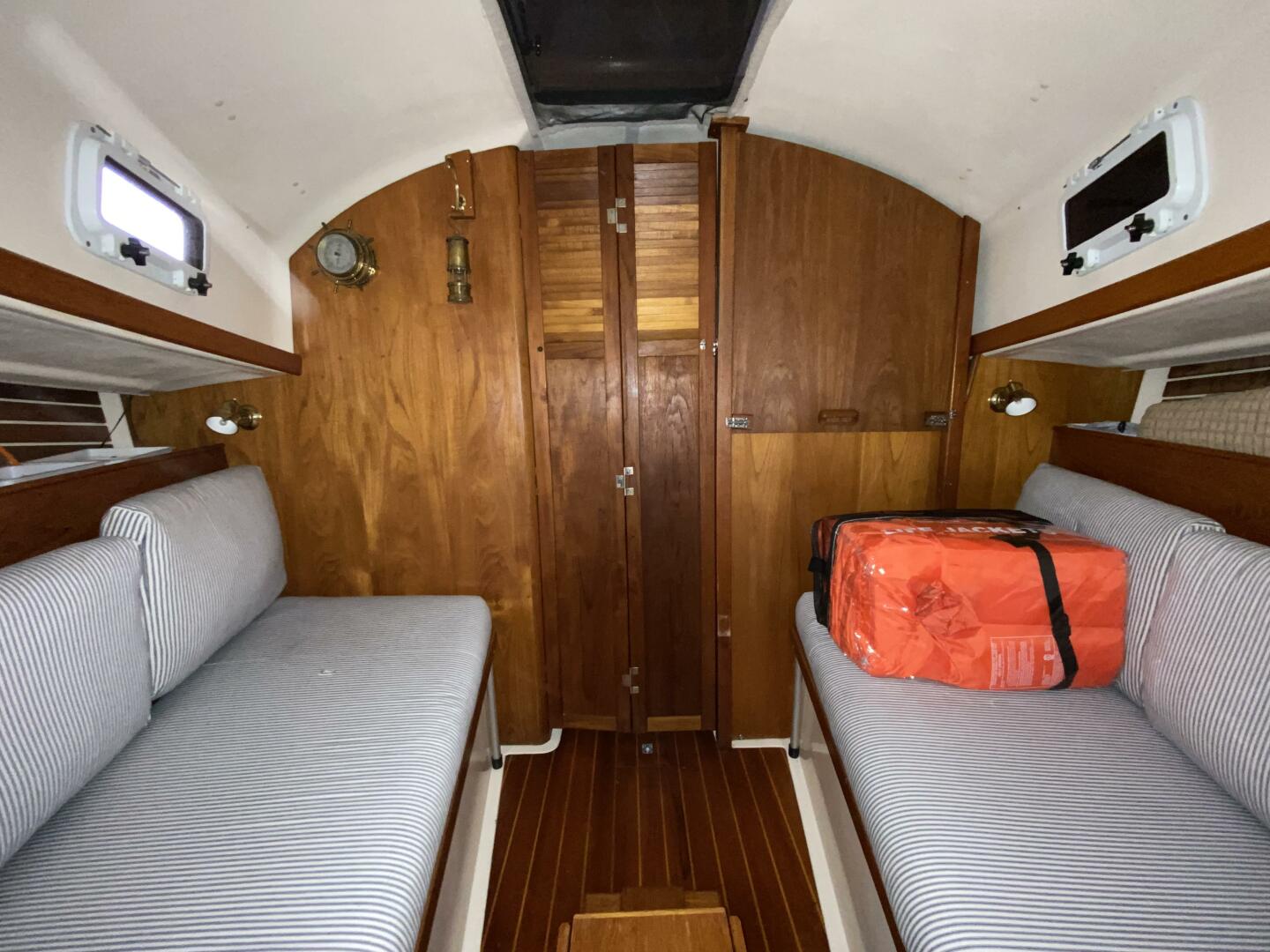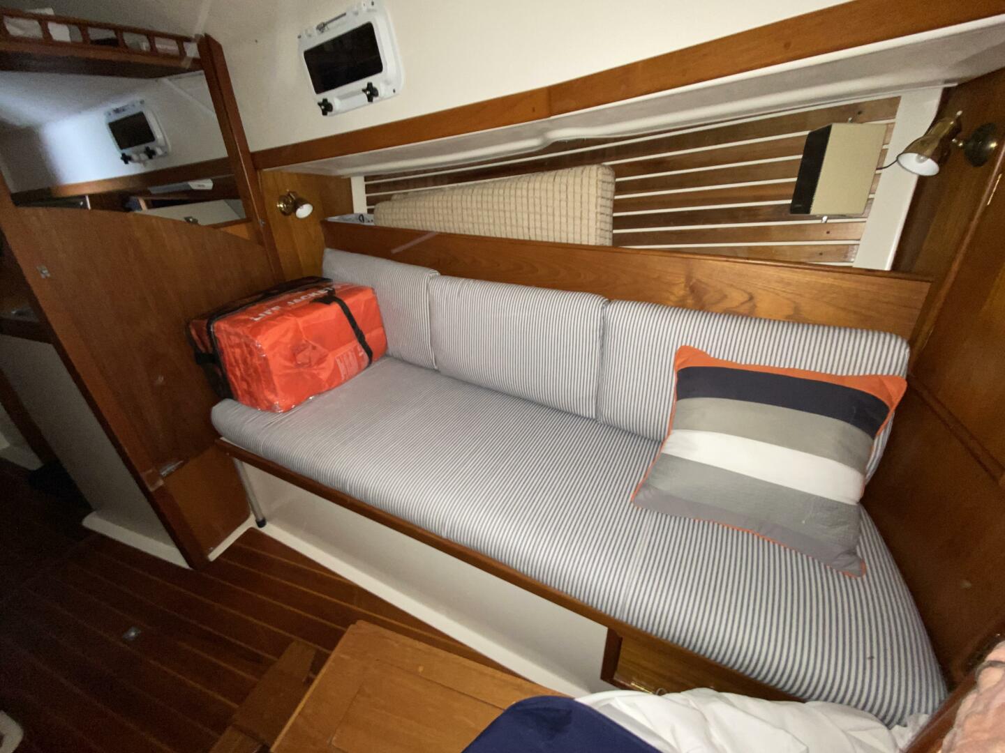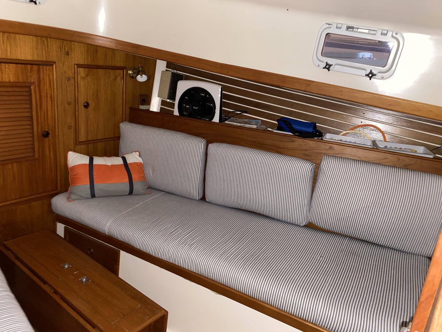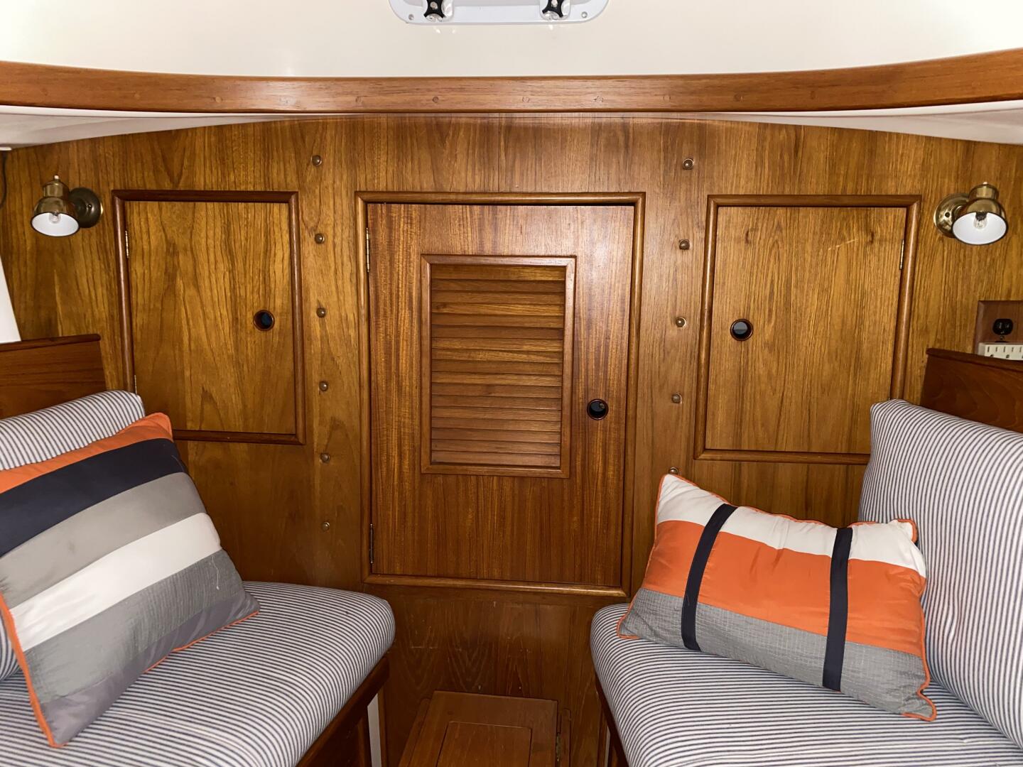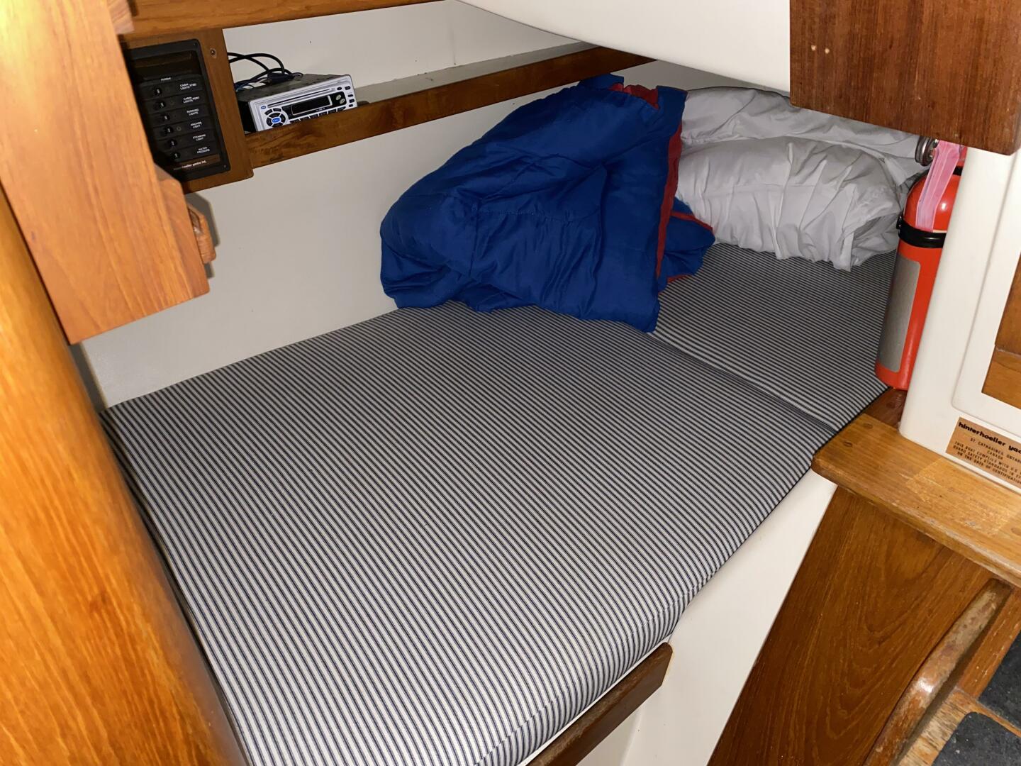 On the port side aft of the galley is a 6' 3" single quarter berth with a full length stowage bin and shelf outboard. On the starboard side aft of the head is a wide 3'" quart er berth with full length fiddled shelf above and outboard. The teak companionway steps are mounted on a large removable panel for access to the engine. Smaller engine access panels are inboard of each quarter berth.