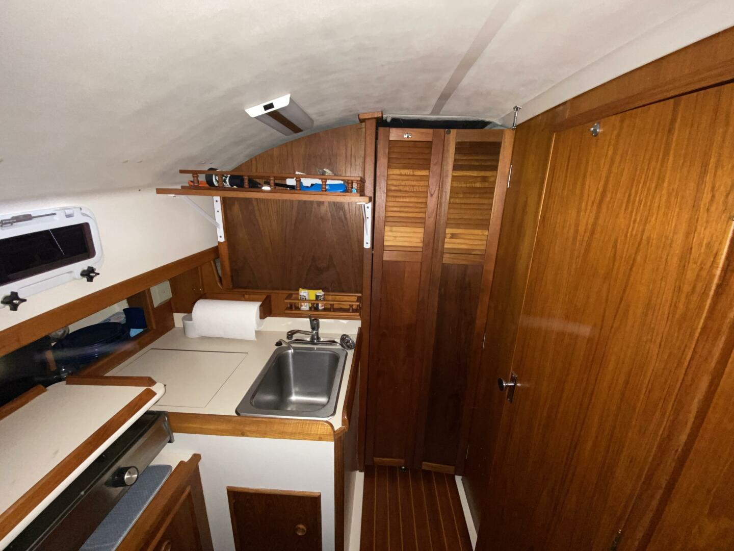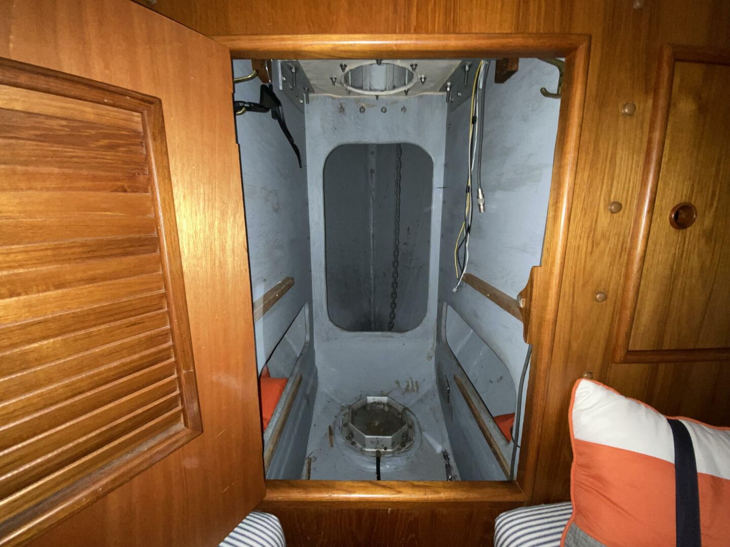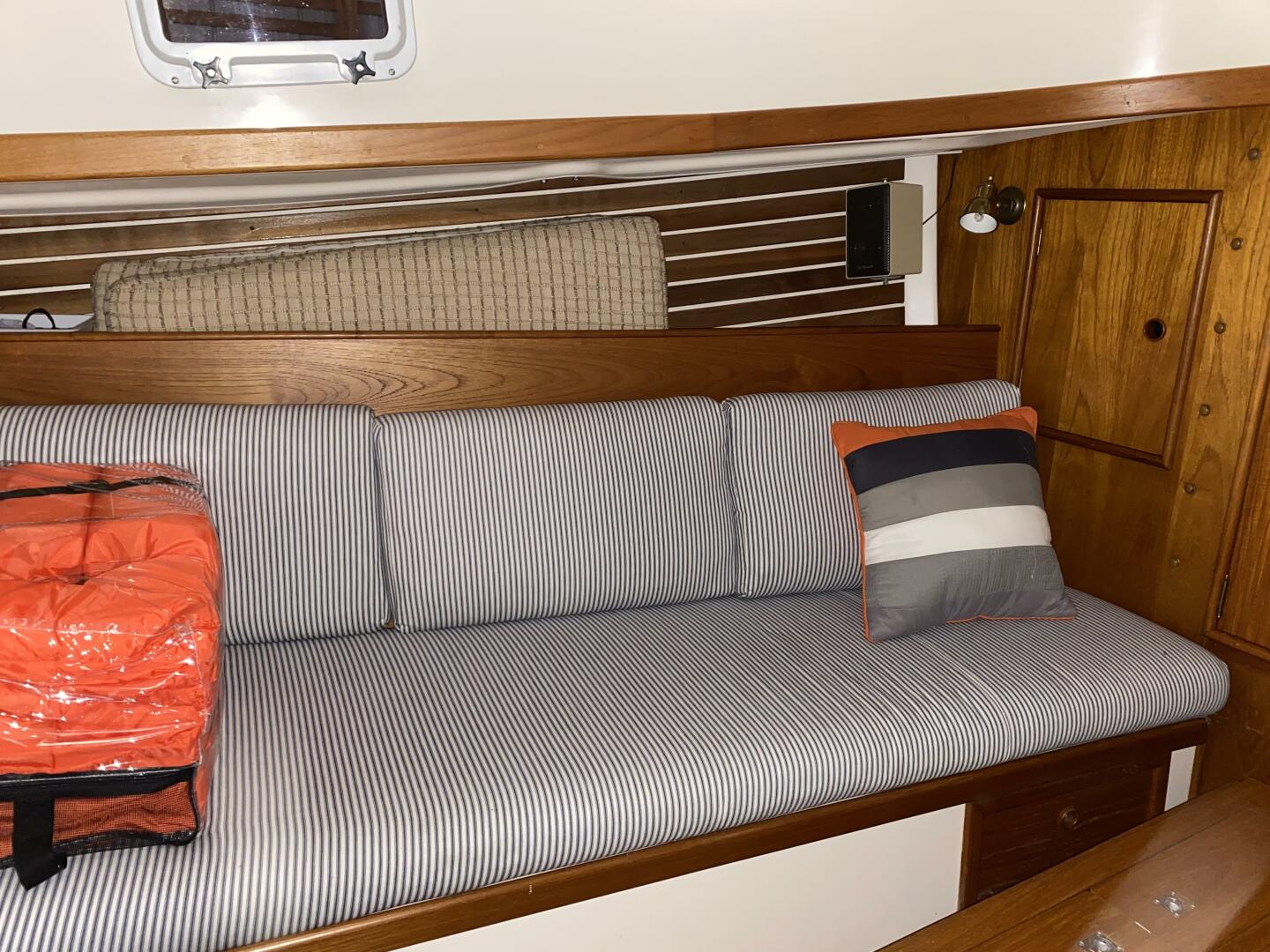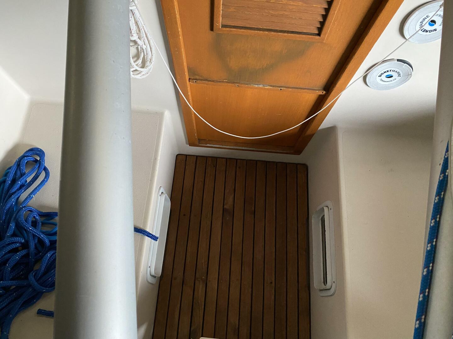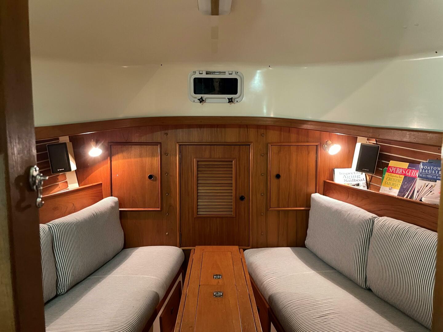 On the port side aft of the galley is a 6' 3" single quarter berth with a full length stowage bin and shelf outboard. On the starboard side aft of the head is a wide 3'" quart er berth with full length fiddled shelf above and outboard. The teak companionway steps are mounted on a large removable panel for access to the engine. Smaller engine access panels are inboard of each quarter berth.