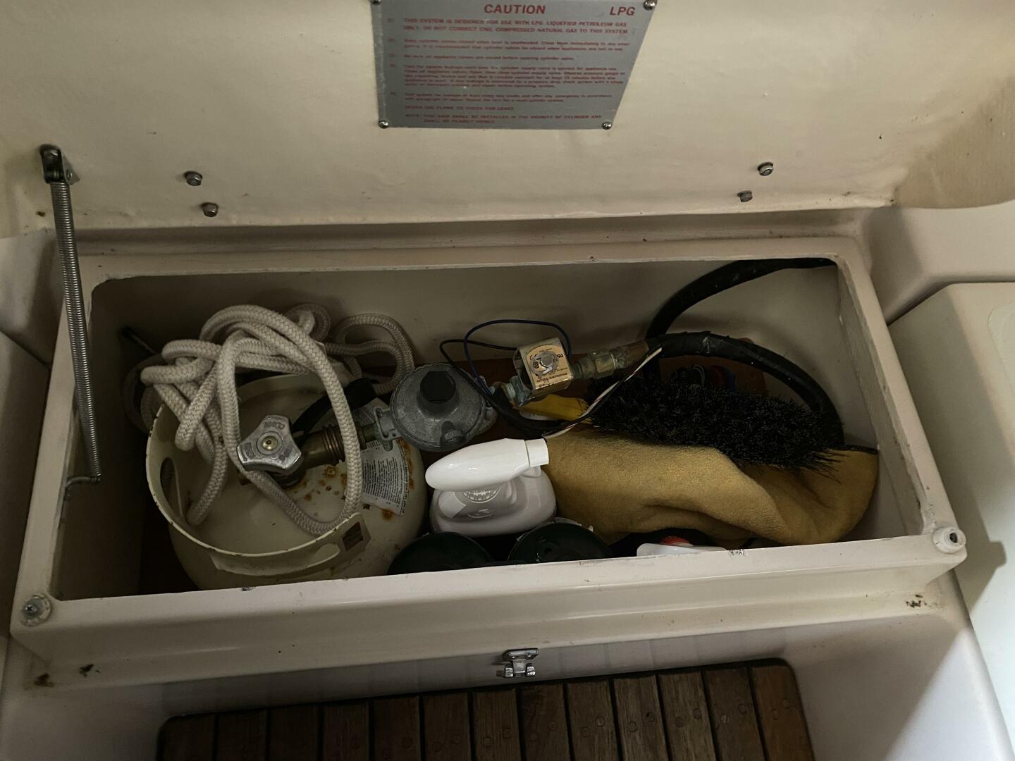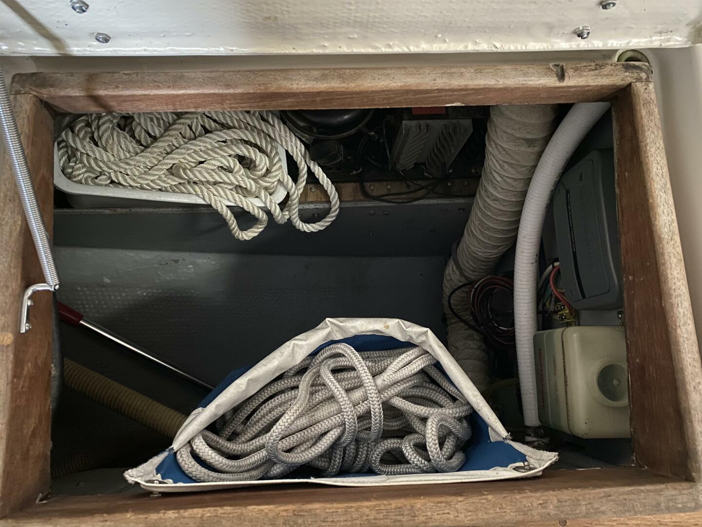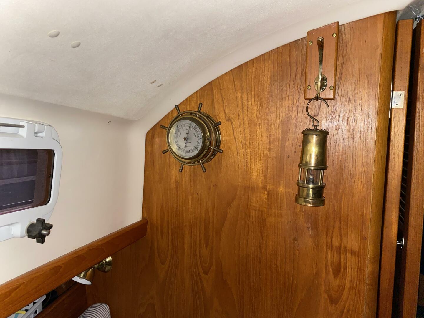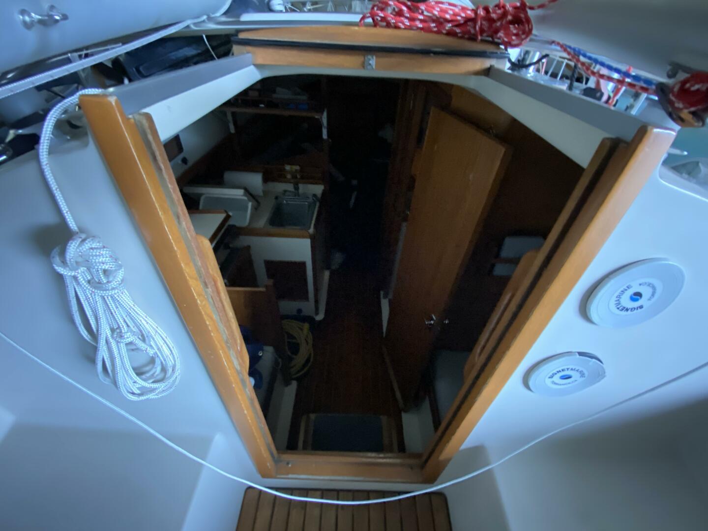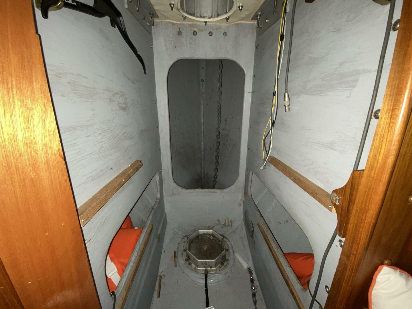 On the port side aft of the galley is a 6' 3" single quarter berth with a full length stowage bin and shelf outboard. On the starboard side aft of the head is a wide 3'" quart er berth with full length fiddled shelf above and outboard. The teak companionway steps are mounted on a large removable panel for access to the engine. Smaller engine access panels are inboard of each quarter berth.
