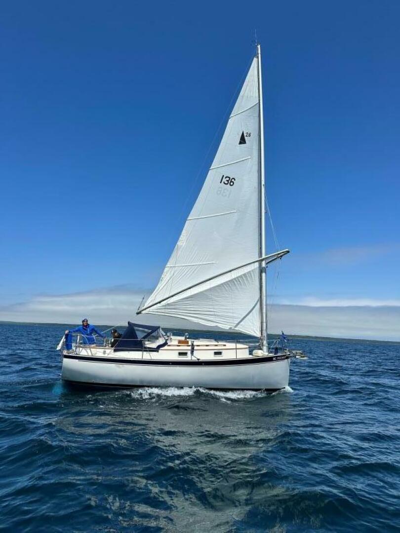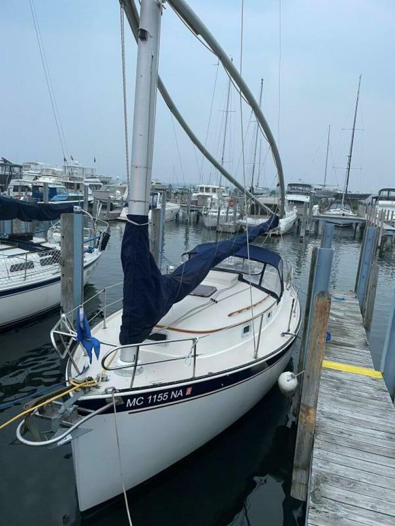 This 1984 Nonsuch 26 is a recreational keelboat, built predominantly of fiberglass with a balsa cored deck and wood trim. It has a cat rig, an unstayed mast with a wishbone boom, a plumb stem, a vertical transom, an internally-mounted spade-type rudder controlled by a wheel and a fixed fin keel. It displaces 8,500 pounds and carries 2,750 pounds of ballast. The boat has a draft of 4' 6" with the standard keel fitted. The boat is fitted with a Westerbeke 13 diesel engine of 13 hp. The fuel tank holds 24 U.S. gallons and the fresh water tank has a capacity of 60 U.S. gallons. The design has sleeping accommodation for four people, with two straight settee berths in the main cabin and two aft cabins, each with a single berth. The galley is located on the port side just forward of the companionway ladder. The galley is L-shaped and is equipped with a two-burner stove, an ice box with refrigeration and a sink. The enclosed head is located opposite the galley on the starboard side. She has been well maintained, all running rigging was replaced recently and she received a full tune-up in the spring. The design has a PHRF racing average handicap of 225 with a high of 238 and low of 213. It has a reported hull speed of 6.62 knots.