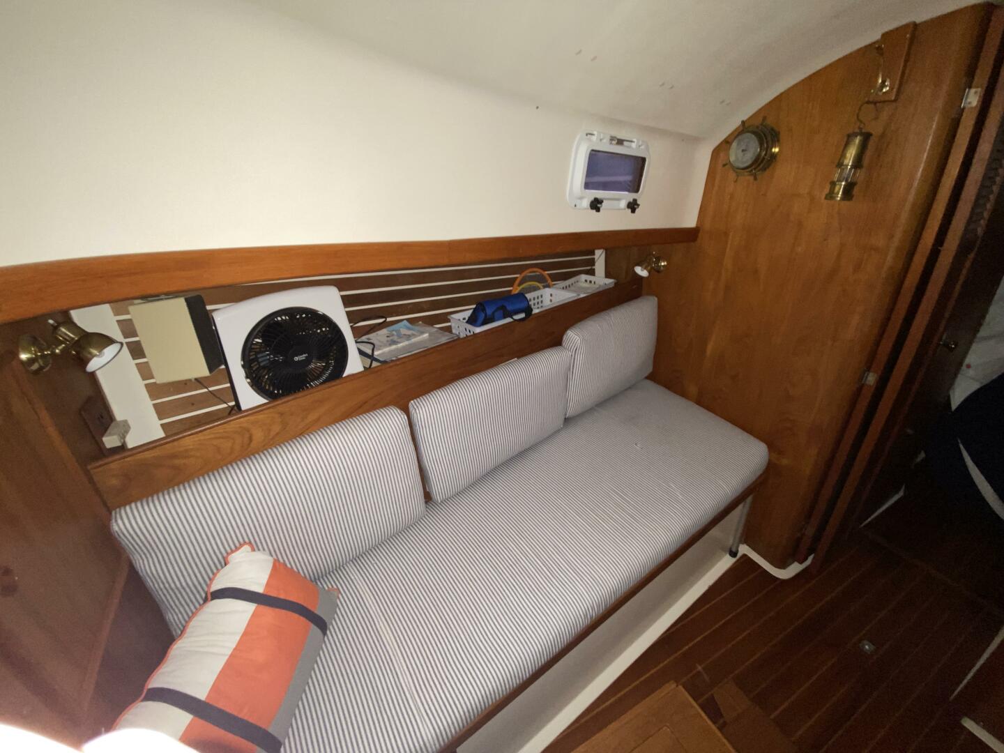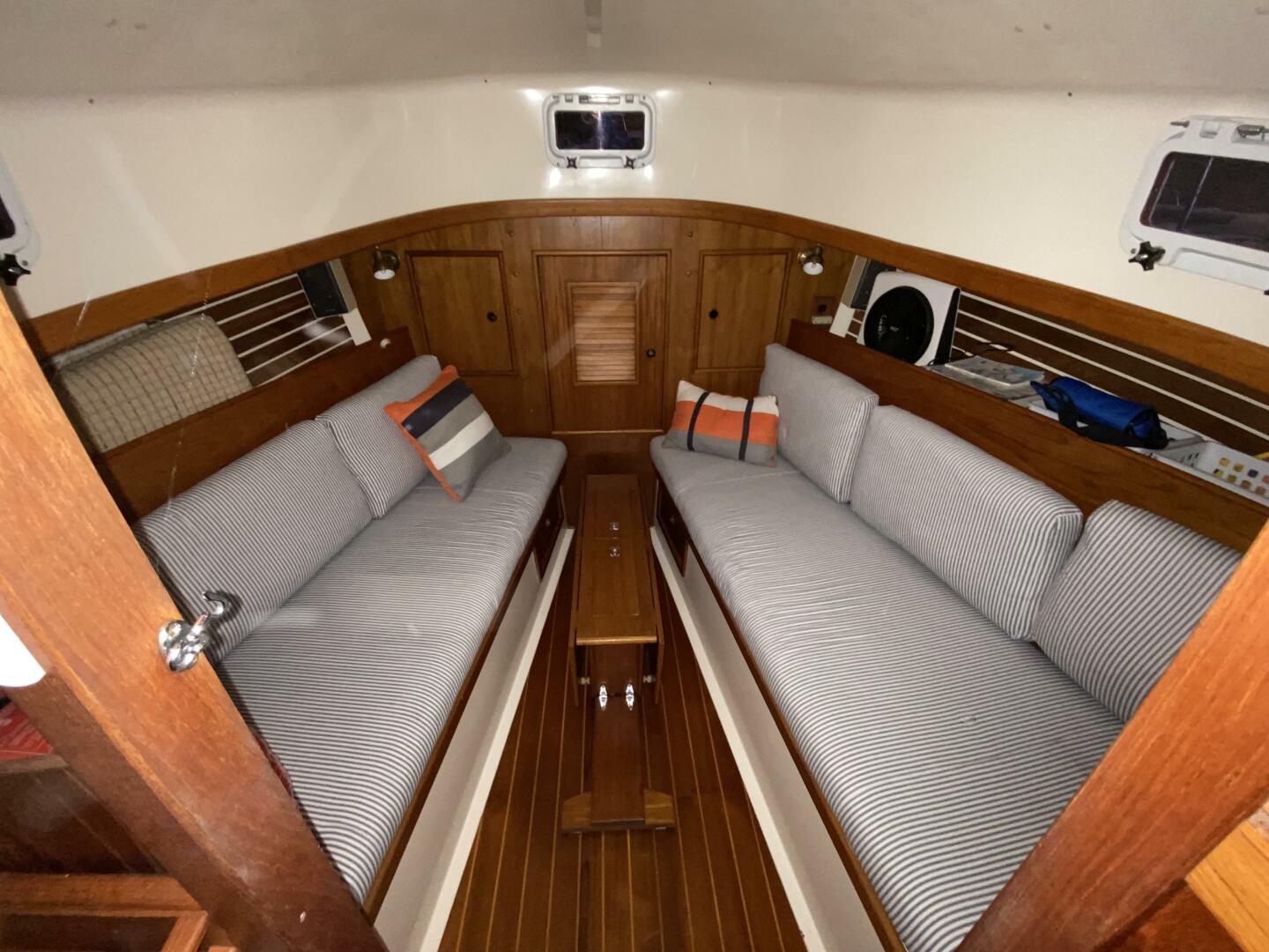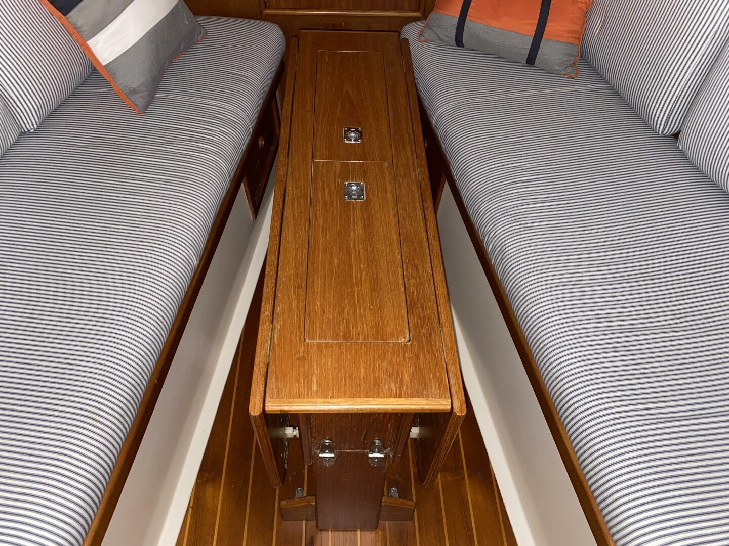 The Nonsuch 26 has 6'1" standing headroom. There is a varnished teak and holly sole, full molded textured head-liner with removable panels for access to the deck hardware fastenings aft, and satin varnished teak bulkheads and joiner work. A wrap-around teak grab rail surrounds the interior. The forward cabin has two 6'4" settee berths with 5-inch tufted fabric cushions and removable backrest cushions. The port settee has a drop-front backrest with stowage behind it and converts to a pull-out double bunk. The starboard settee has stowage behind the backrest. There is a storage locker at the forward end of each settee and a full-length shelf outboard of each settee. The cabin also has a large teak drop-leaf table. Forward of the settees is a teak bulkhead with a door to a large hanging locker in the center and a large shelved storage locker on each side.