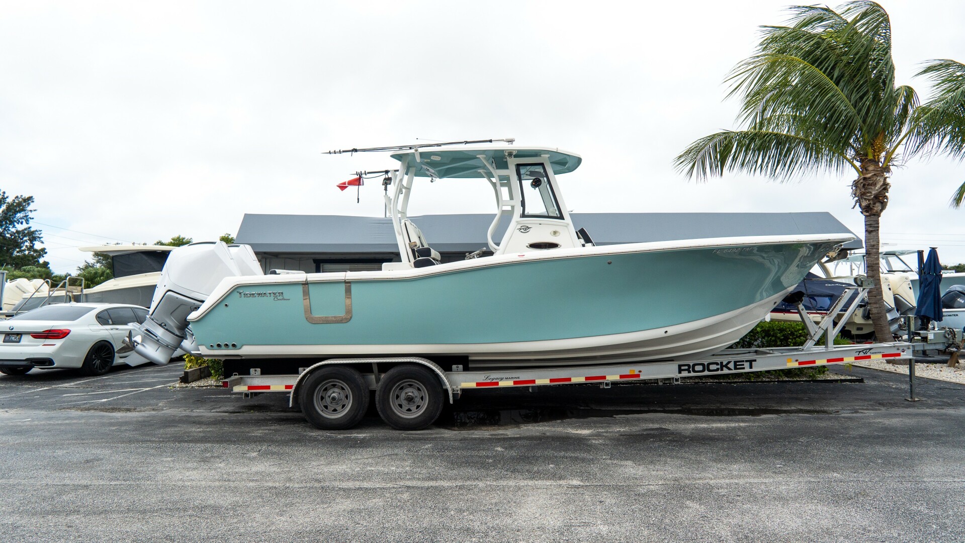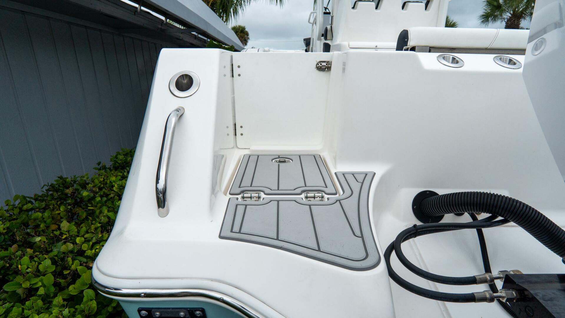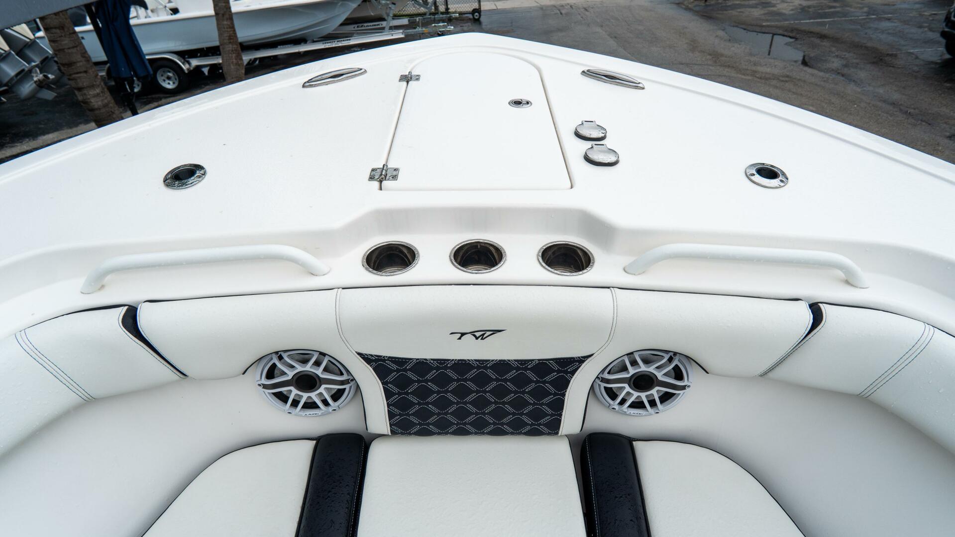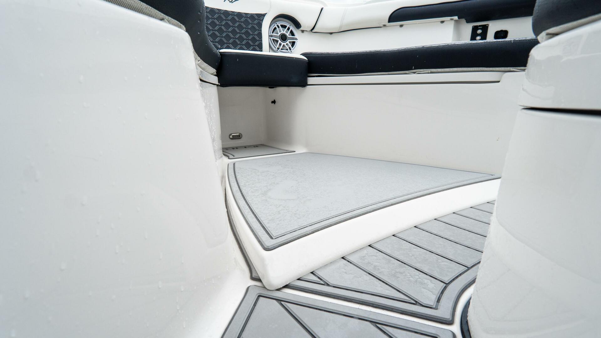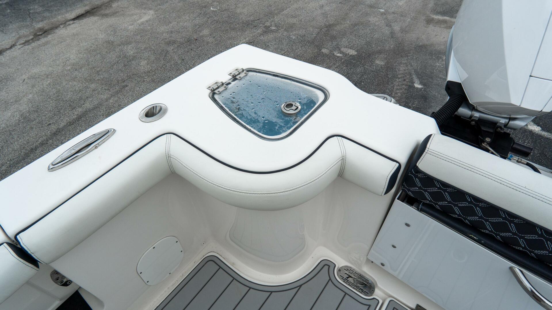 Outfitted with a dual Simrad NSS16 EVO3S electronics package, JL Audio system with 10” subwoofer and amp, Gemlux outriggers, and Lumitec RGBW underwater lights, this 292CC is turnkey and ready to fish or cruise. The grey and black teak Dekit flooring, painted white Mercury engines, and two-tone hull complete the boat’s high-end aesthetic.