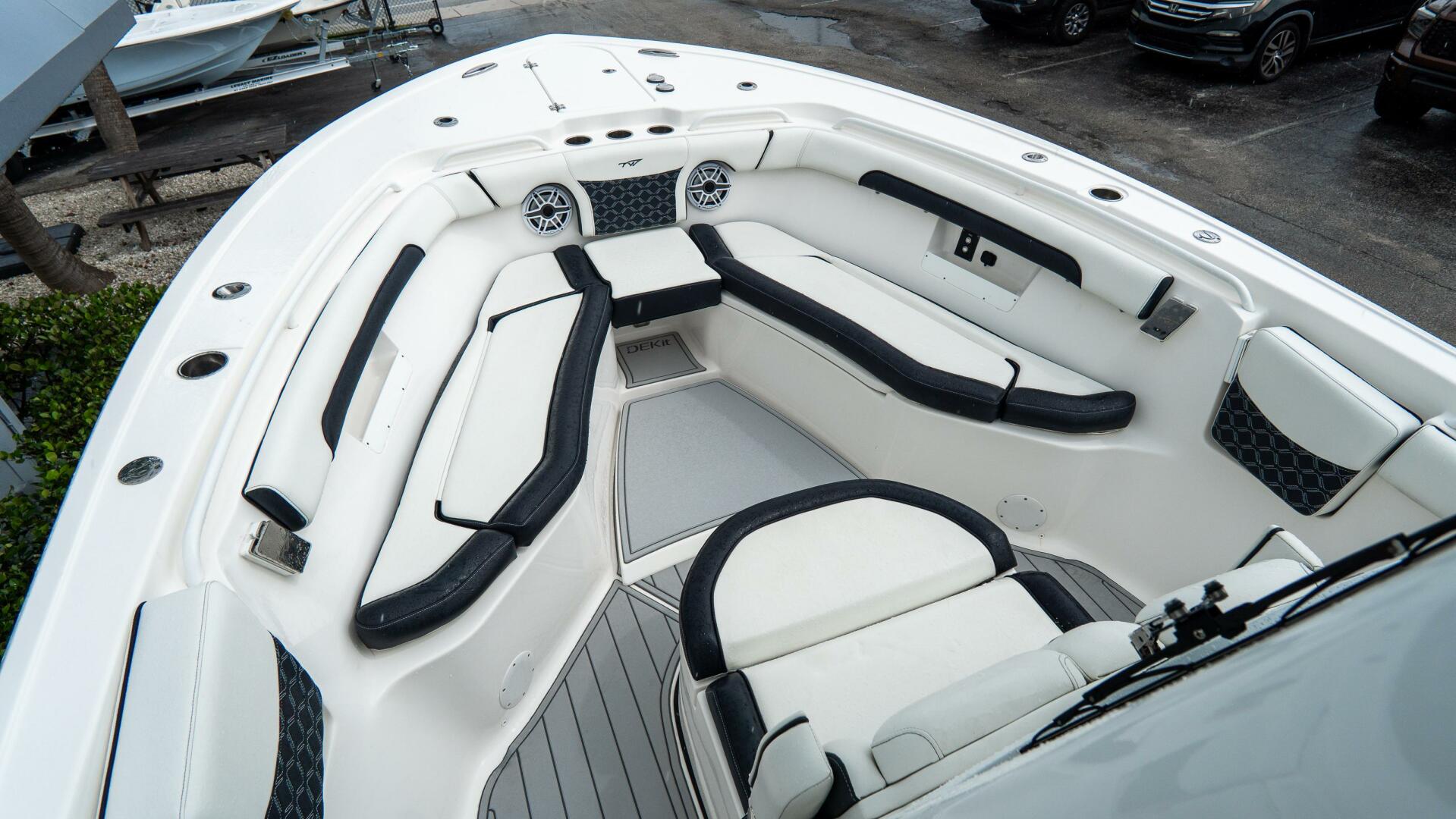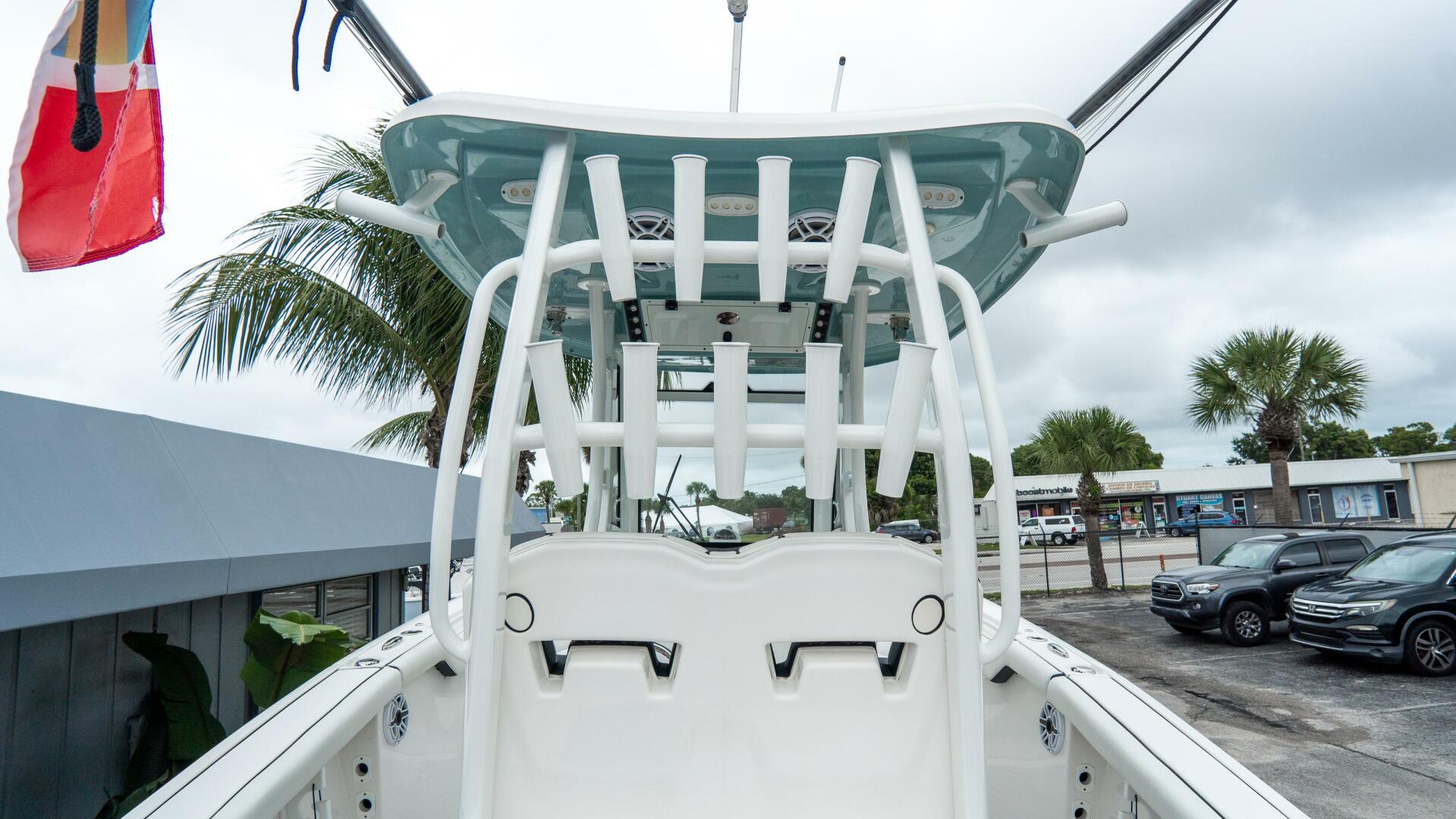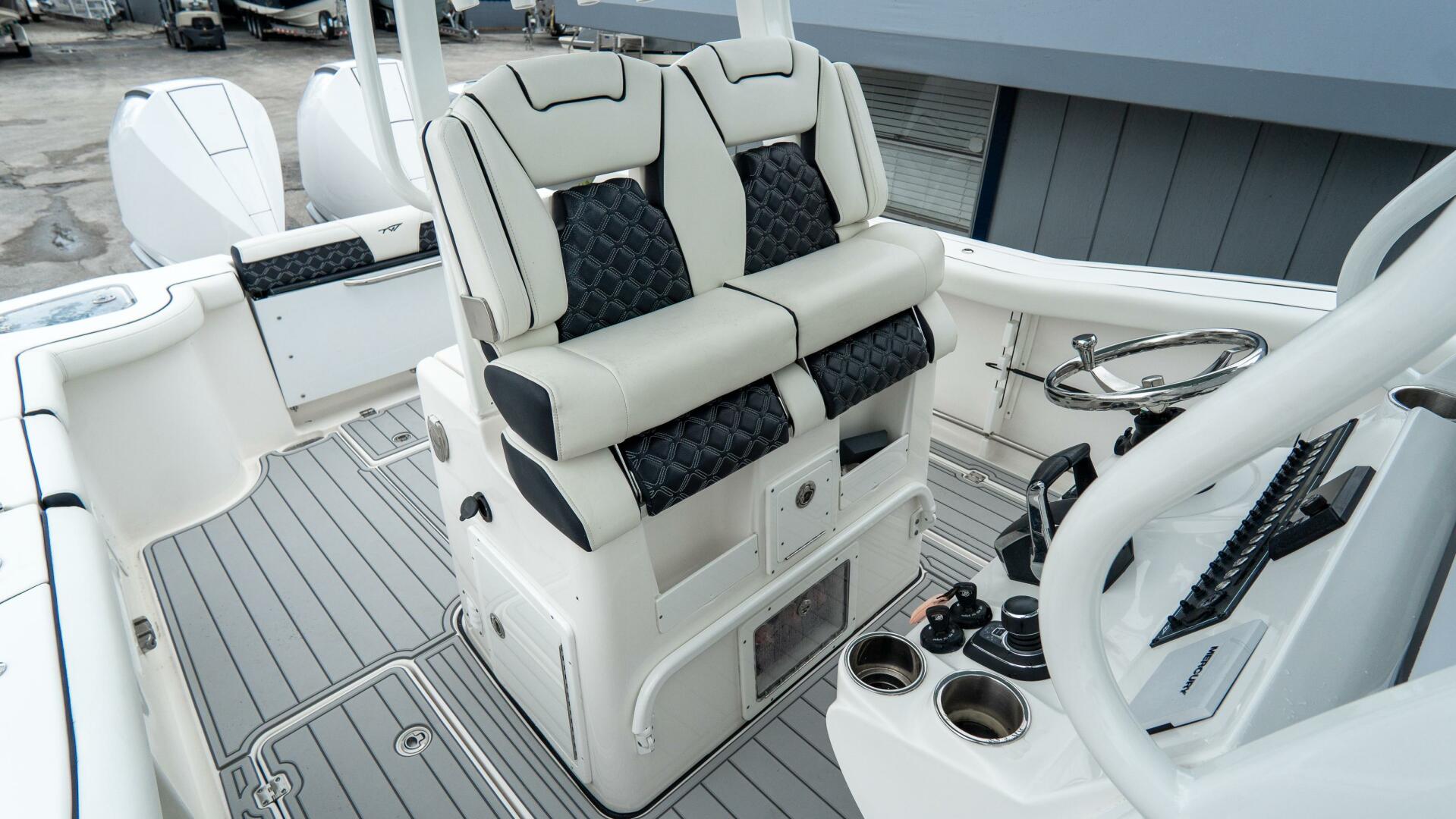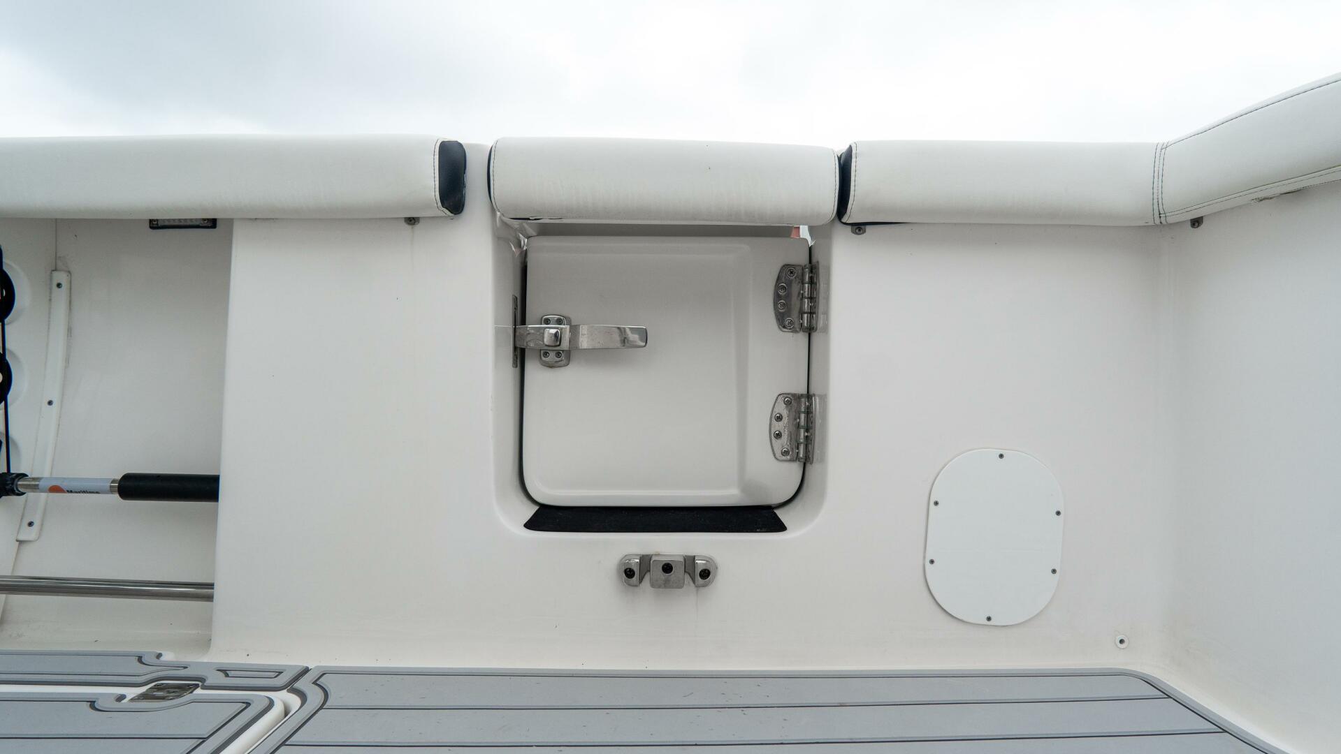 Outfitted with a dual Simrad NSS16 EVO3S electronics package, JL Audio system with 10” subwoofer and amp, Gemlux outriggers, and Lumitec RGBW underwater lights, this 292CC is turnkey and ready to fish or cruise. The grey and black teak Dekit flooring, painted white Mercury engines, and two-tone hull complete the boat’s high-end aesthetic.