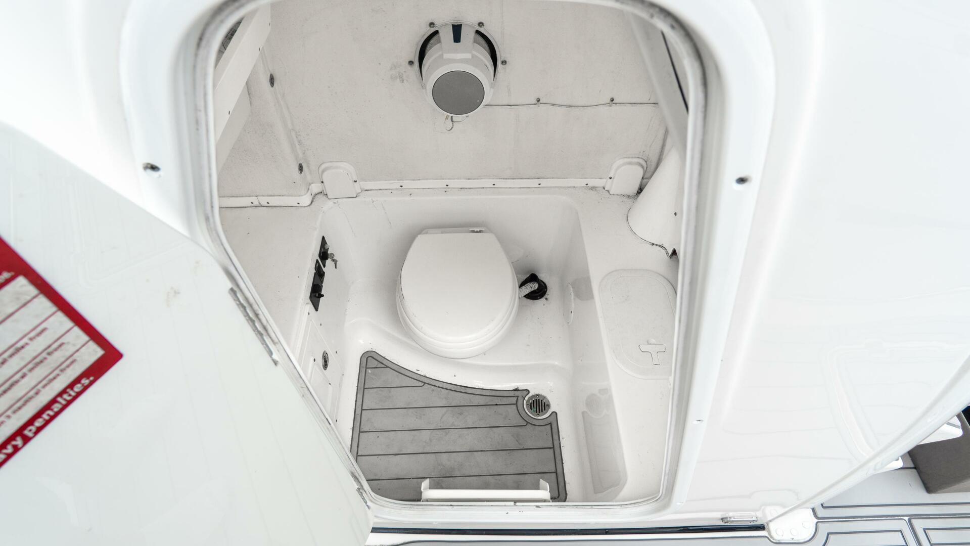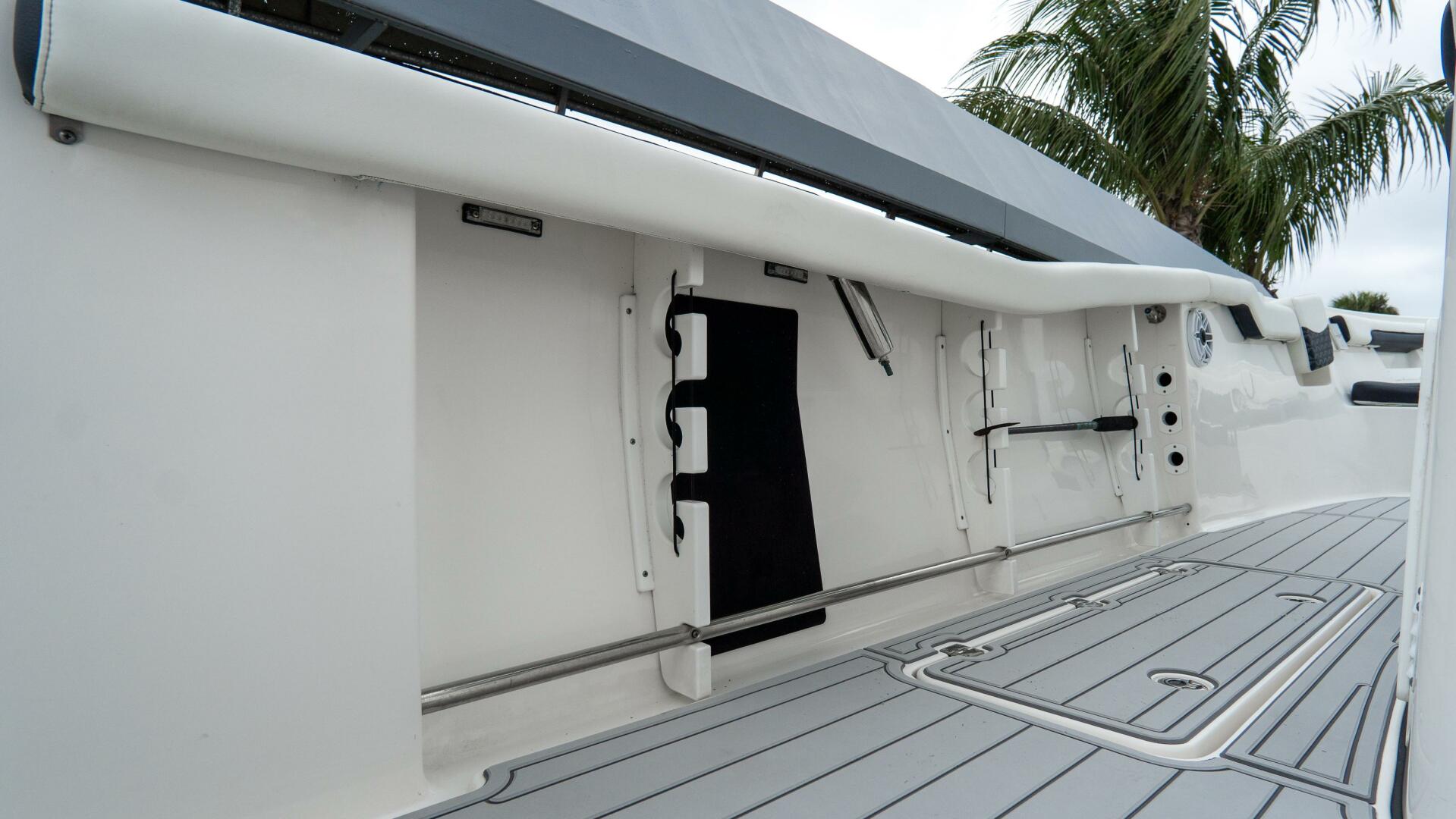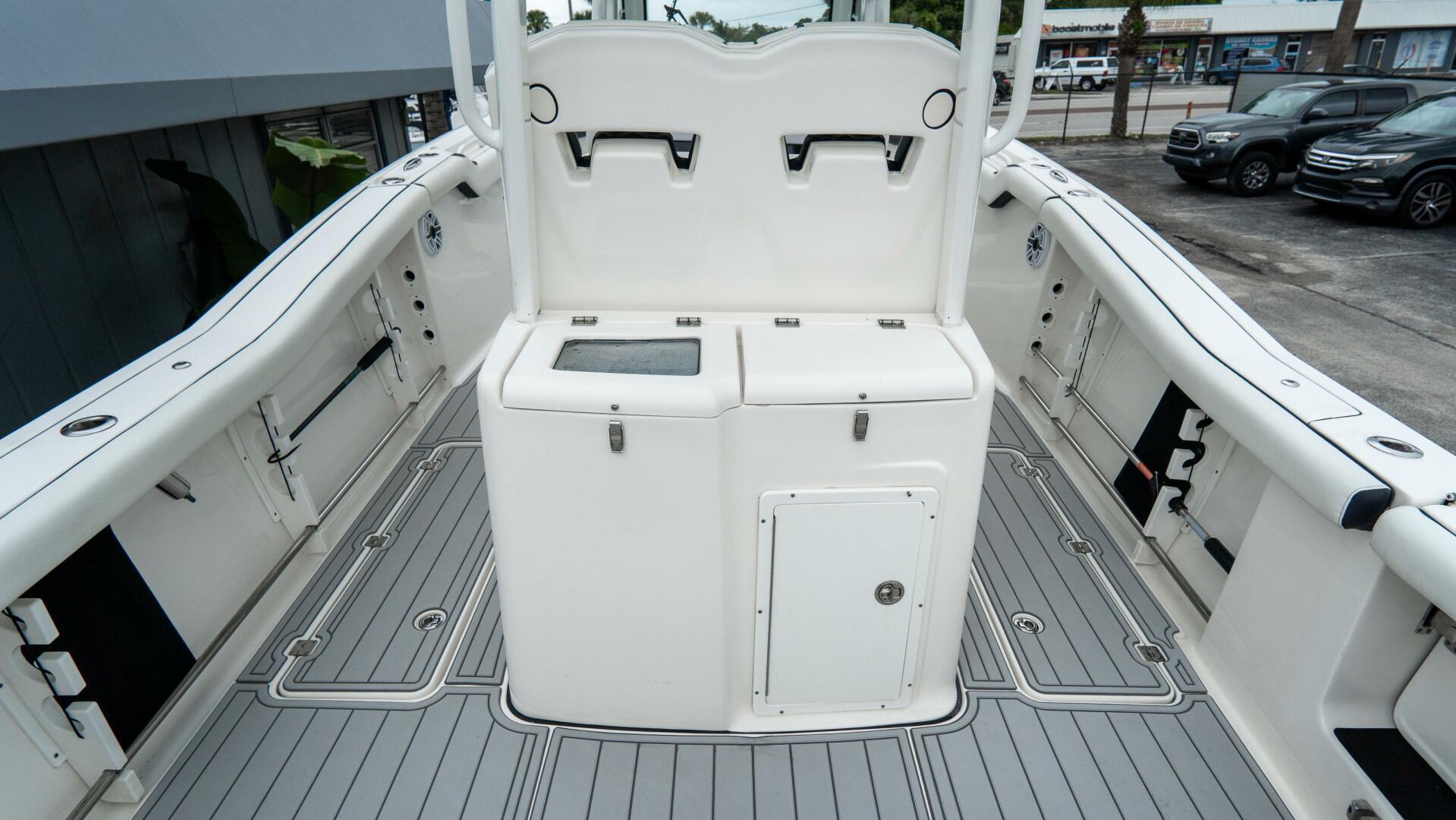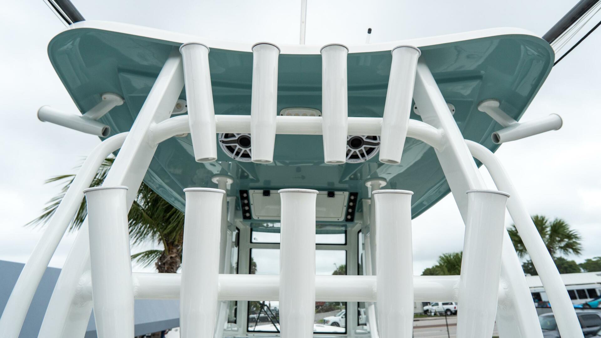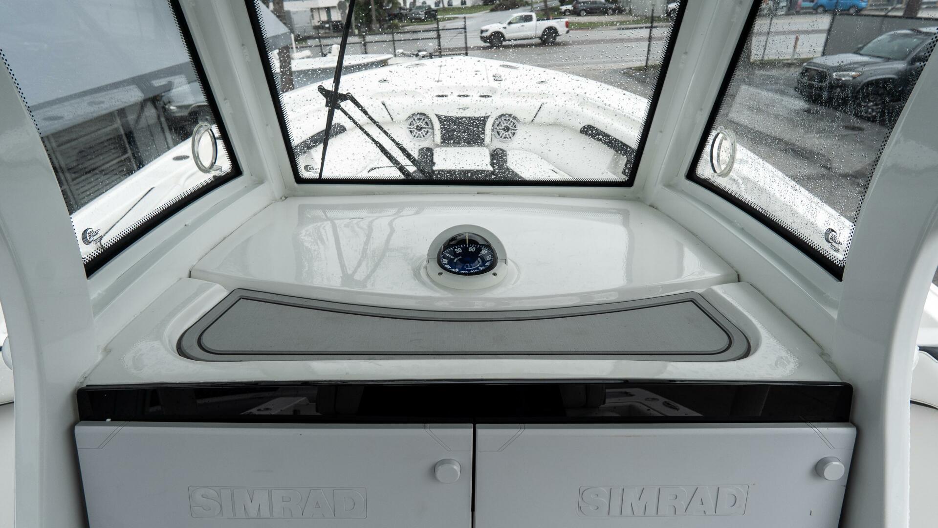 Outfitted with a dual Simrad NSS16 EVO3S electronics package, JL Audio system with 10” subwoofer and amp, Gemlux outriggers, and Lumitec RGBW underwater lights, this 292CC is turnkey and ready to fish or cruise. The grey and black teak Dekit flooring, painted white Mercury engines, and two-tone hull complete the boat’s high-end aesthetic.