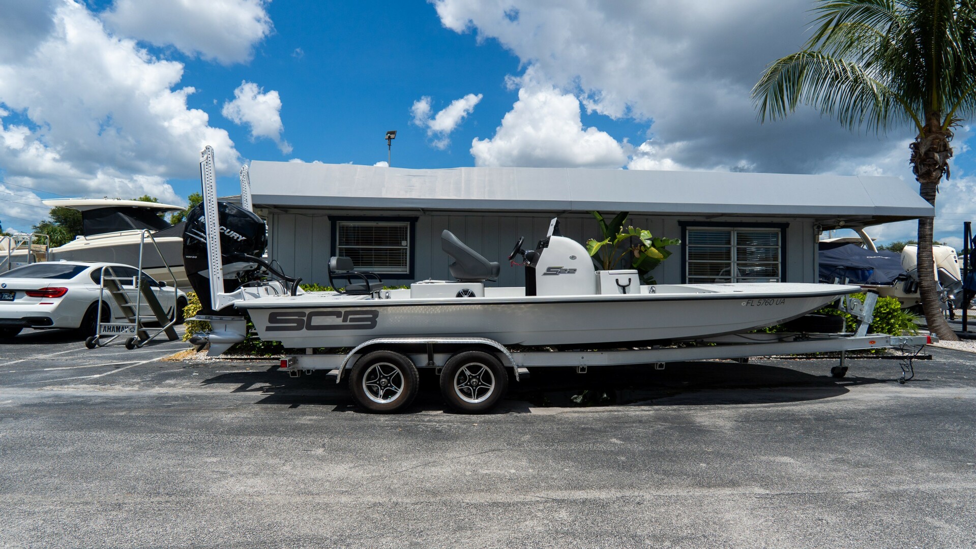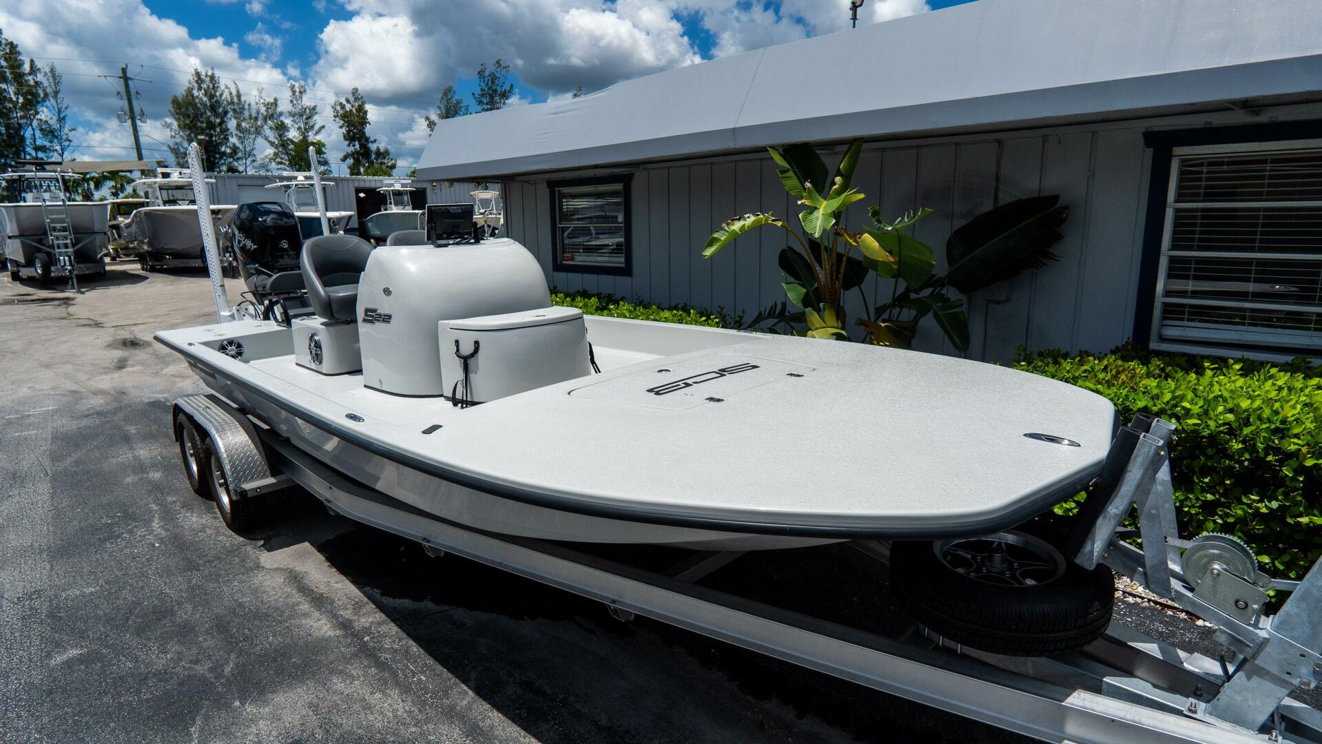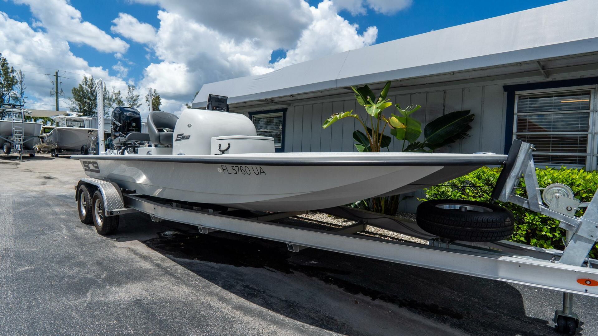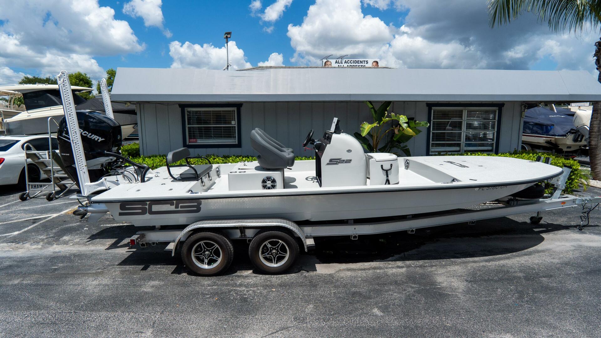 2021 SCB S22 powered by a Mercury 400L Verado with less than 15 hours. Like new and stored indoors since day one. Features bubble console, raised console with livewell, removable rear bench, and tandem McClain trailer. Factory engine warranty through July 2032—turnkey and ready.