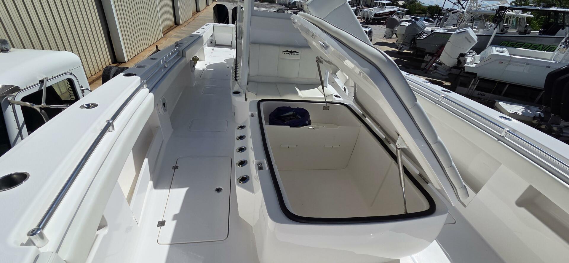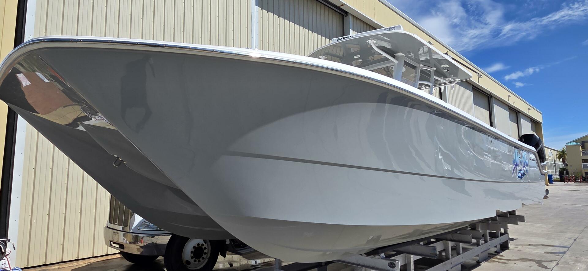 Its advanced multihull design provides a stable, dry ride in rough conditions and confidently leans into turns for smooth, responsive performance. Designed with fishability in mind, it features a single-level deck for 360° walk-around access, expansive storage, large insulated fish boxes and livewells, plus abundant rod storage throughout the gunwales, hardtop, and console.
