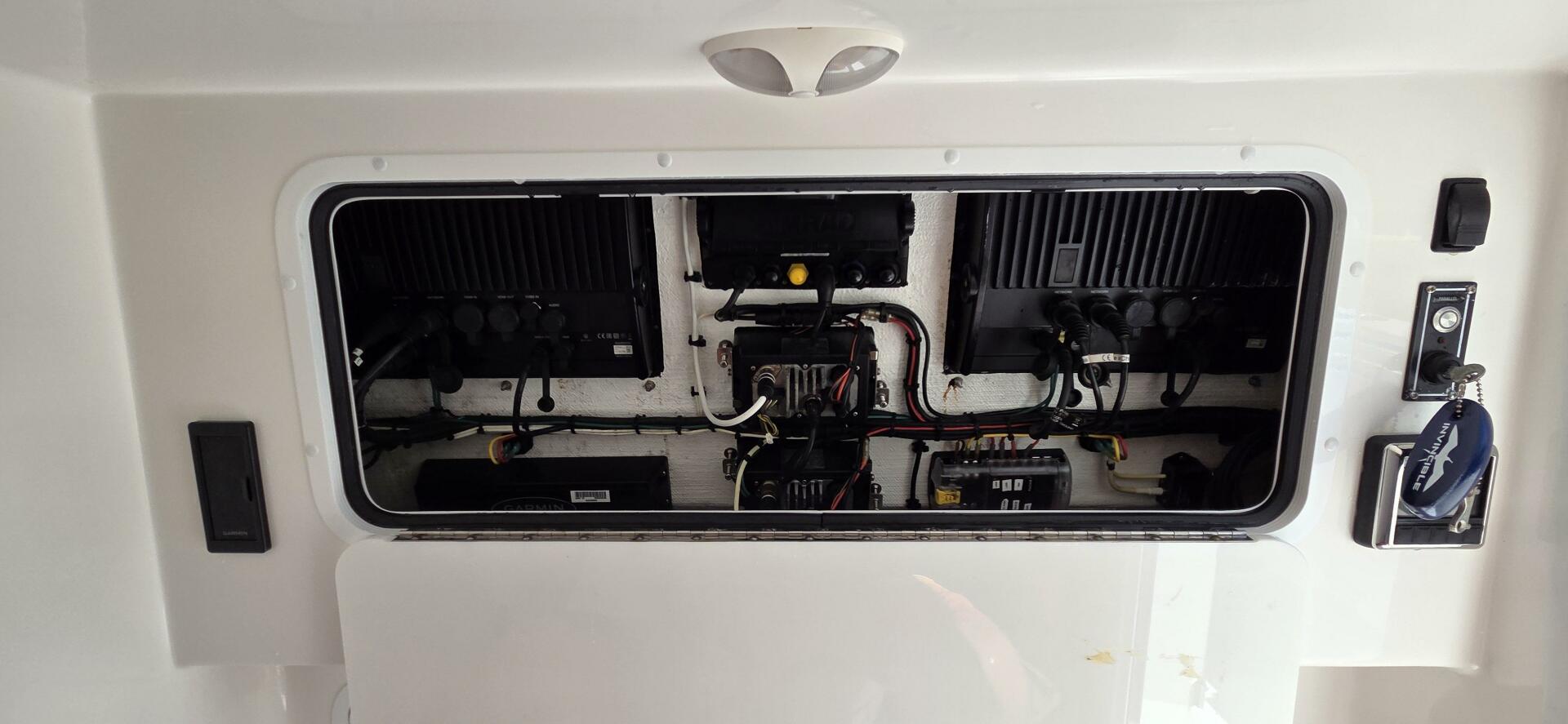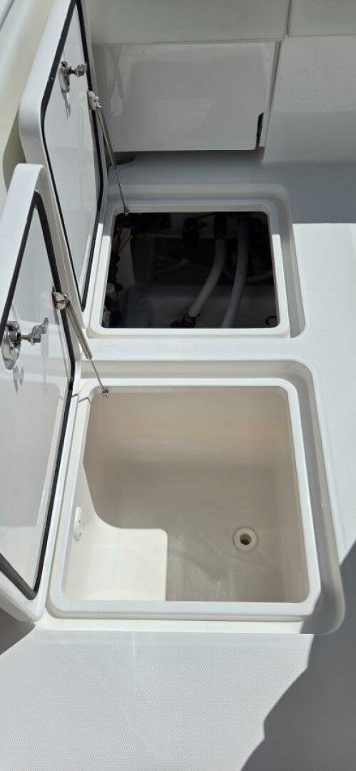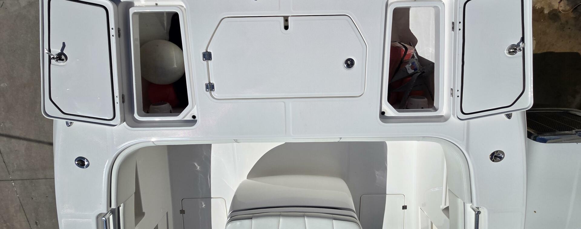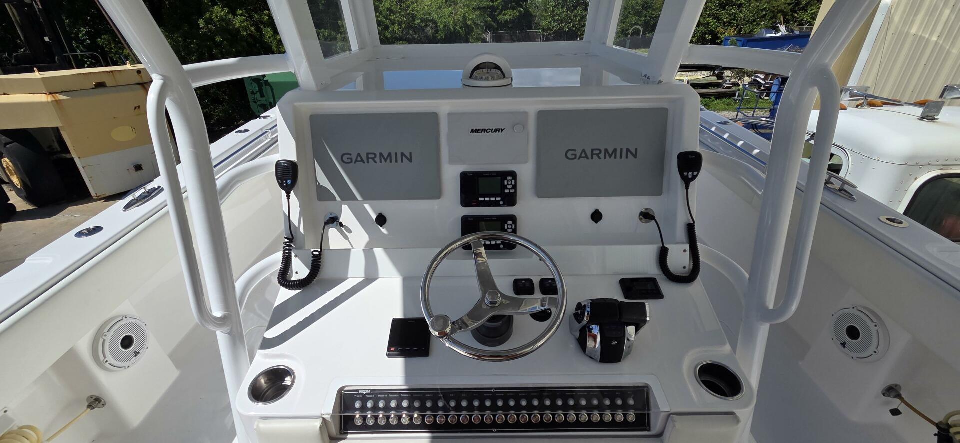 Inside the console, there’s comfortable headroom with an electric head compartment and easy access to systems. The helm features Duel Garmin Chart Plotters, HD Radar, bottom sounder, and Mercury instrumentation.