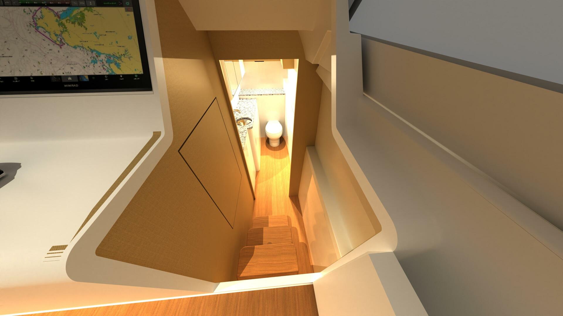 This is a true revolution in the big Cat market. The Front Runner 55 Catamaran Walk Around features a 360-degree walkable deck, enclosed helm deck area, and cabin and head down below, making use of space like few (if any) catamarans have before.
