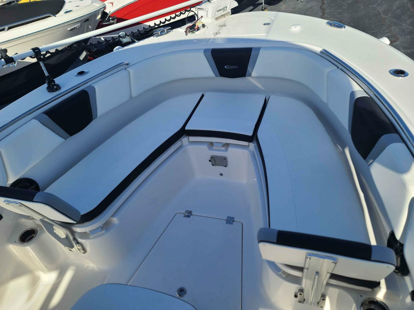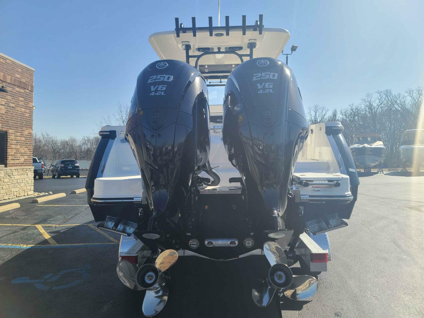 The available options for this vessel include: Twin Yamaha Four Stroke F250XCB 250HP with 25" Shaft and Digital Electric Steering, a solid hull with Deepwater Black Gel Coat, and custom-painted Black Yamaha Engines (twin). The cockpit interior is Harbor Black, with matching Black Canvas Color and Accessories (if equipped). It also comes with a Full Coverage Hardtop (Black Powder Coated), Leaning Post and Console Covers, a Simrad Single NSS12 EVO3S, a Simrad NMEA 2000 Starter Package with Audio Interface, and a Simrad B175 1KW Transducer. Additional features include a Minn Kota Riptide Terrova Trolling Motor with Triple Bank Charger (36V, 112lb Thrust, 87-inch Shaft), two Blue LED Underwater Lights, Yamaha Helm Master EX for enhanced maneuverability, a Seadek Helm Mat, and two Stainless Steel Drink/Rod Holders. Also included are a Stainless Steel 20lbs Anchor, a Windlass Package, a 5-year Premier Level Limited Component Warranty, a Prep Fee, and an Aluminum Triple Axle Trailer with Aluminum Wheels and a Spare Tire Kit (Aluminum Wheel).