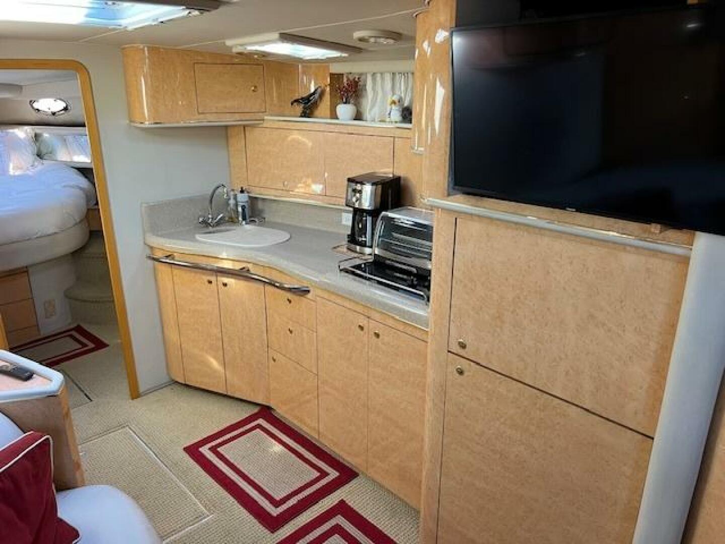 - Fully equipped galley: refrigerator/freezer, 3-burner cooktop, microwave