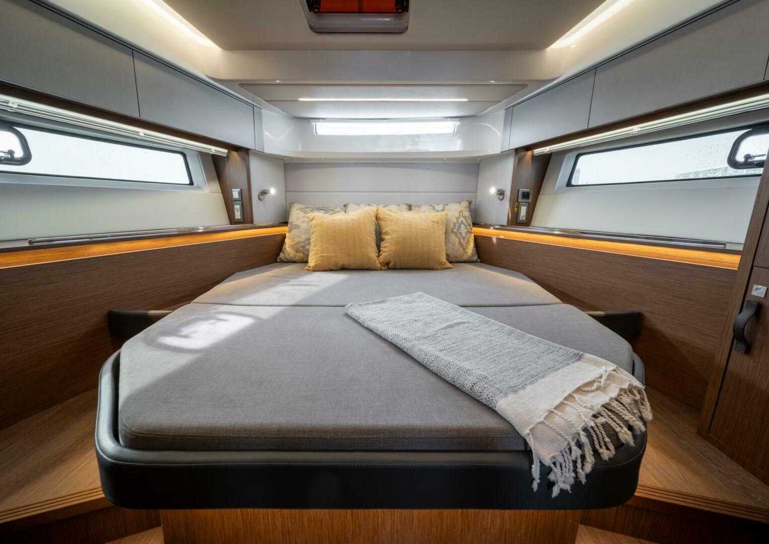 The owner's cabin is spacious and bright, and has its own ensuite bathroom, as does the VIP guest cabin. A third cabin can be used as a single or double berth, or easily become the extra storage space any owner needs. With the wheelhouse's convertible salon, the boat can accommodate up to eight people for a pleasant night on board. Whether you're embarking on a weekend getaway or a longer voyage, the Antares 12 coupe is equipped to meet your needs. Experience the perfect blend of luxury and functionality with this remarkable cruiser, ready to make waves in your boating adventures.