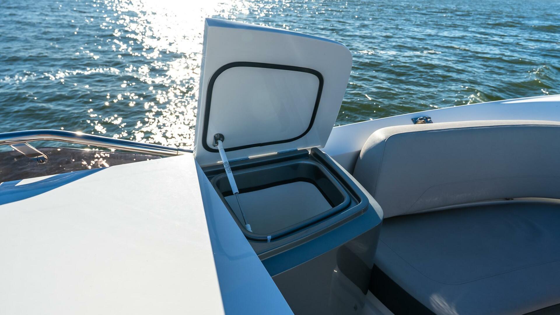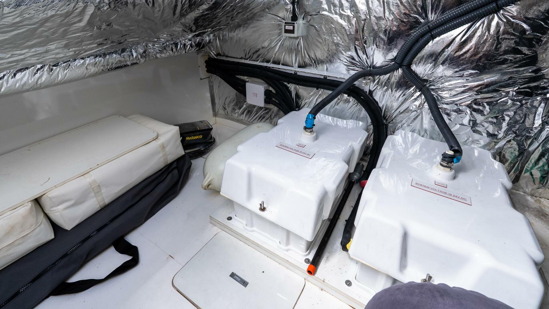 - Charcoal Grey Sunbrella bimini top, electro-hydraulically powered and LED overhead lighting