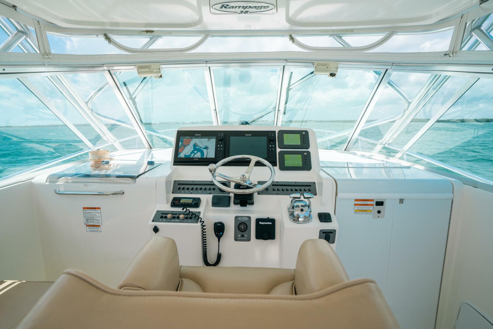 A classic design, the Rampage 38 Express cabin can accommodate up to four with a double berth forward and a convertible U-shaped dinette to port. Additional features include excellent cabin headroom, a separate stall shower in the head, power windshield center vent, hinged helm (for access to the wiring), tilt steering and cherry wood interior trim.