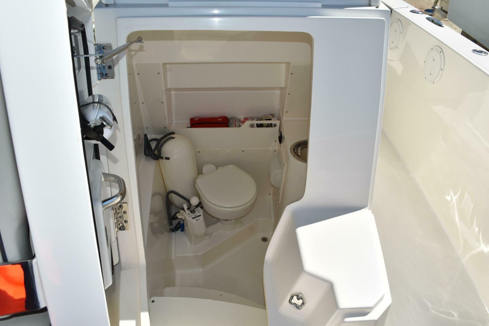 Below deck, you’ll find a spacious enclosed head compartment with tanked marine toilet, sink, and room to change comfortably.