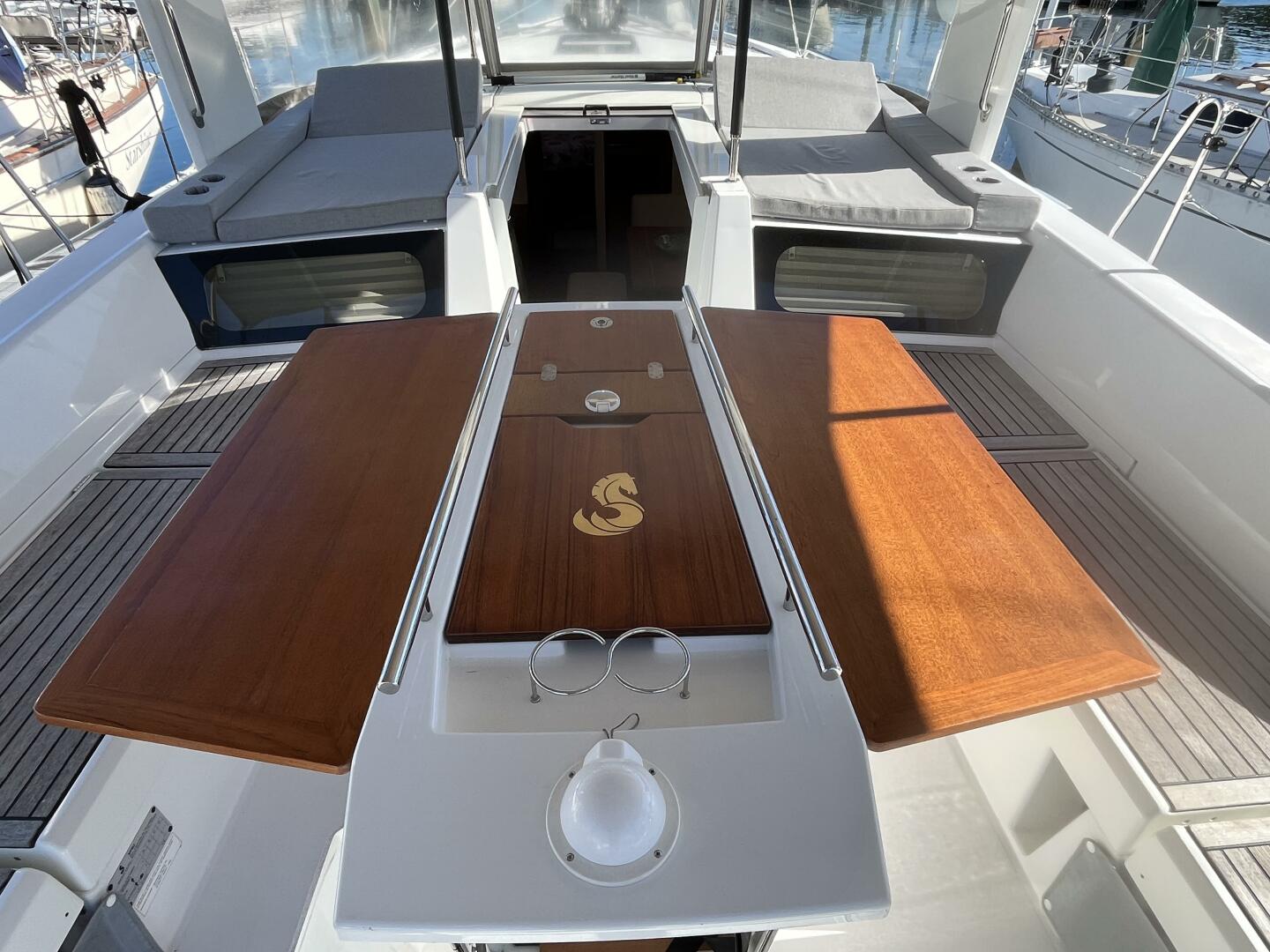 - Deluxe cockpit table w/ wooden leaves and top, Beneteau Seahorse gold leaf inlay, cooler