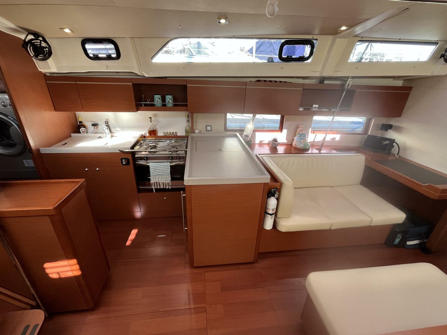 - Galley to port – L shaped, with island alongside companionway