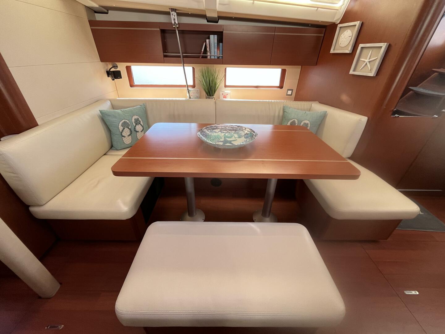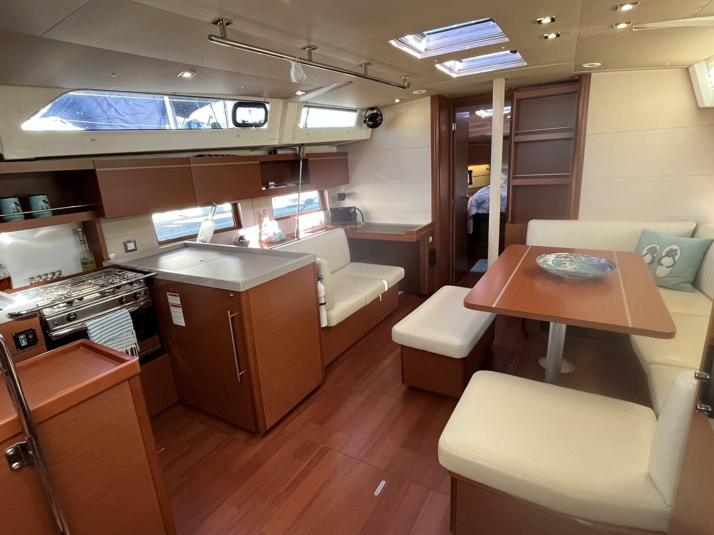 - Dinette w/ large inlayed table and midships bench, starboard