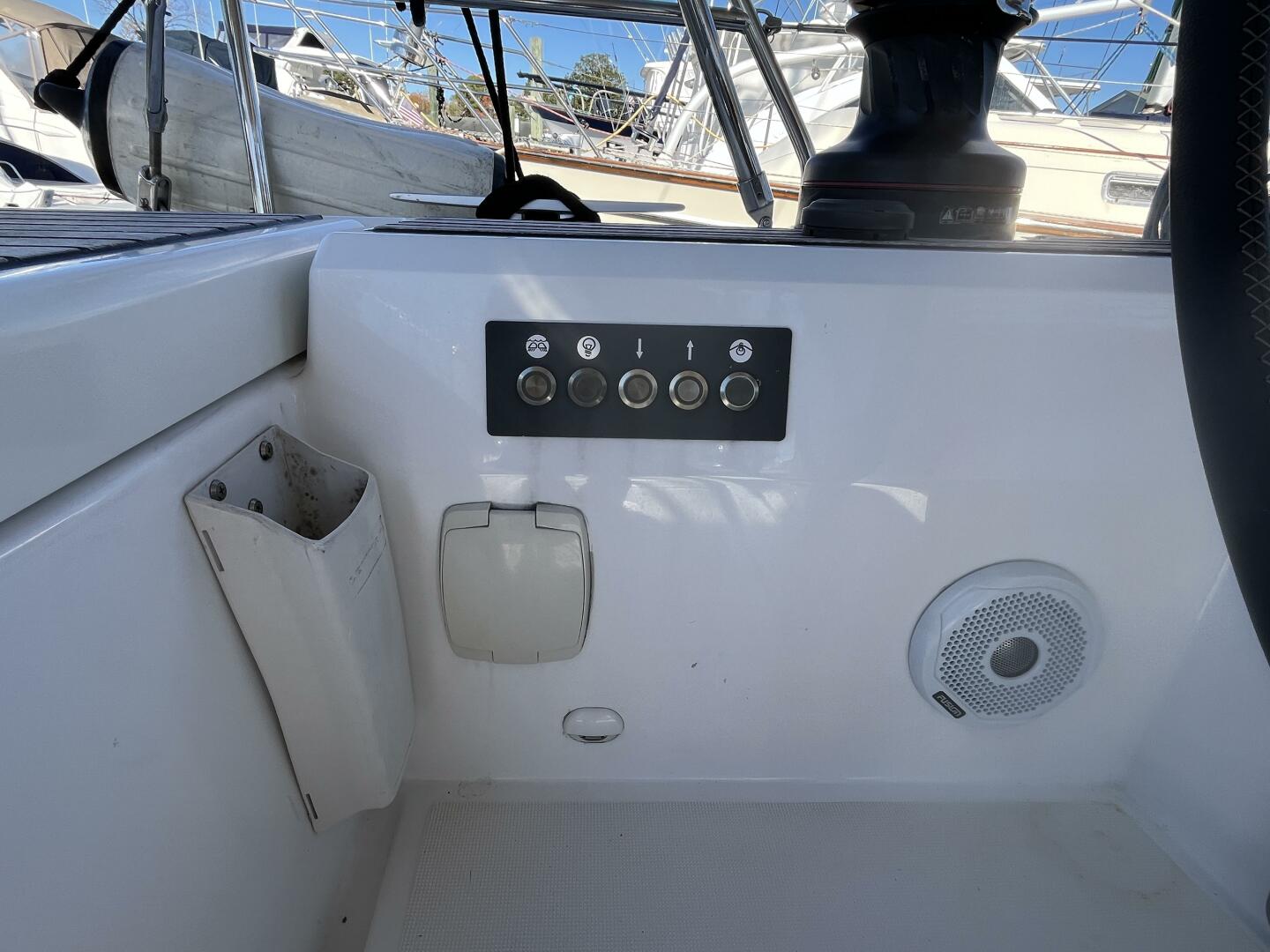 Fat Bottom Girl stands out from the rest of the 46.1’s in that the standard pedestals were removed and custom pedestals installed to accommodate larger (Zeus 9) chartplotters and fly by wire throttle controls at each helm – this is a huge advantage to the skipper who can be at either helm when docking the boat.