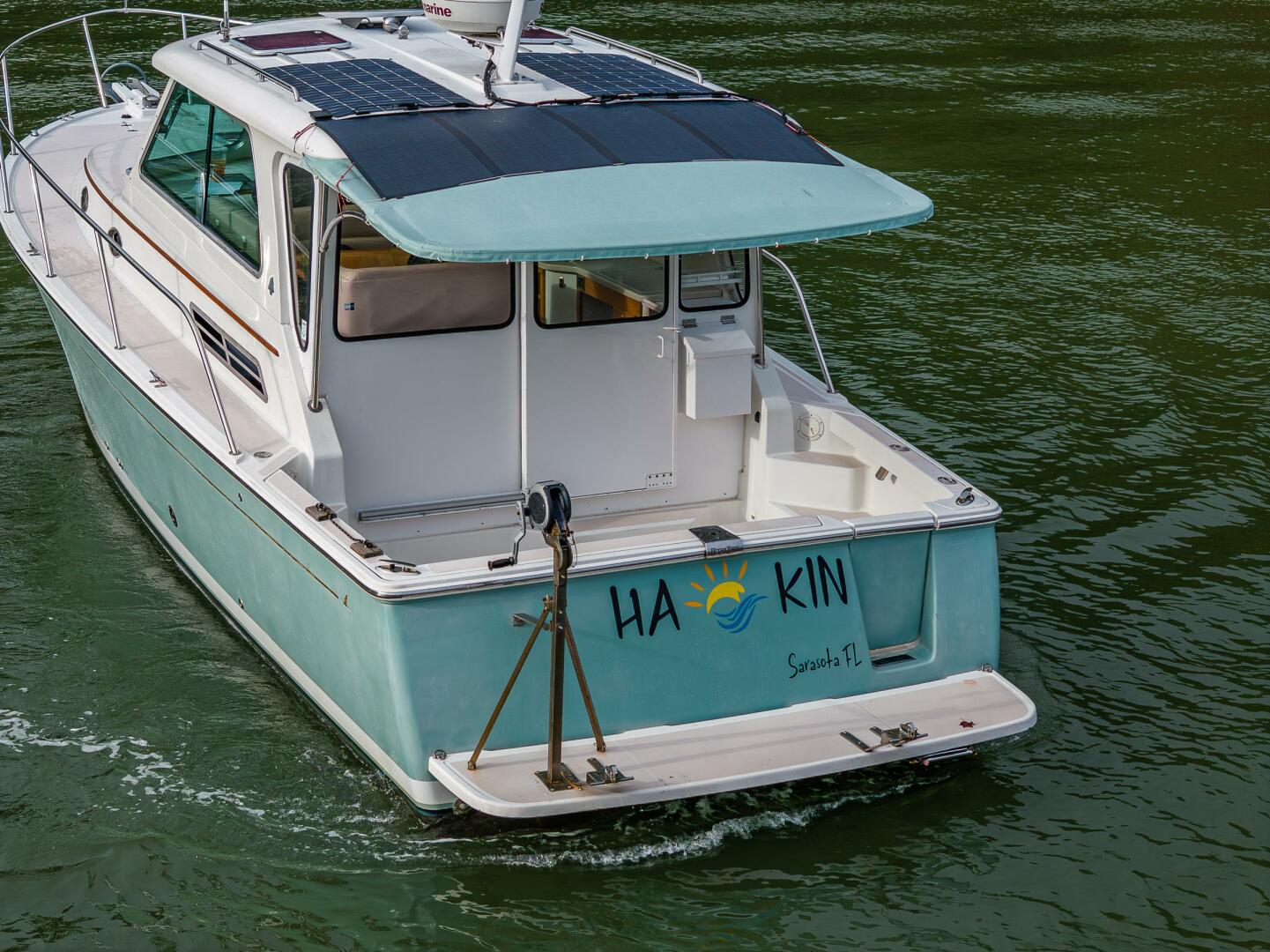 The Back Cove 33 is a yacht with the same simple features, usability, and maintenance that have built the popularity of the Back Cove brand. Below the deck is a large and comfortable vee-berth, convertible L-settee with a beautifully inlaid salon table. To starboard, we created a large head with a separate stall shower. On the helm deck, a full galley stretches out aft of the helm seat and to port is a dinette where four adults can sit to enjoy a meal. The inlaid table is a fine example of the Maine boat builder's craftsmanship and tradition, which is evident throughout the Back Cove 33. Forward of the dinette, a double mate's seat is a comfortable perch for the navigator. The helm deck is airy and bright with overhead hatches, opening side windows, and a center-opening windshield. A leather covered Stidd helm chair provides comfort for the helmsman underway. In her cockpit, a large bench seat allows comfortable lounging while underway or when anchored in a peaceful cove. Engine access is extraordinary, as the helm deck, including the port side dinette, raises to expose the yacht's mechanical systems.