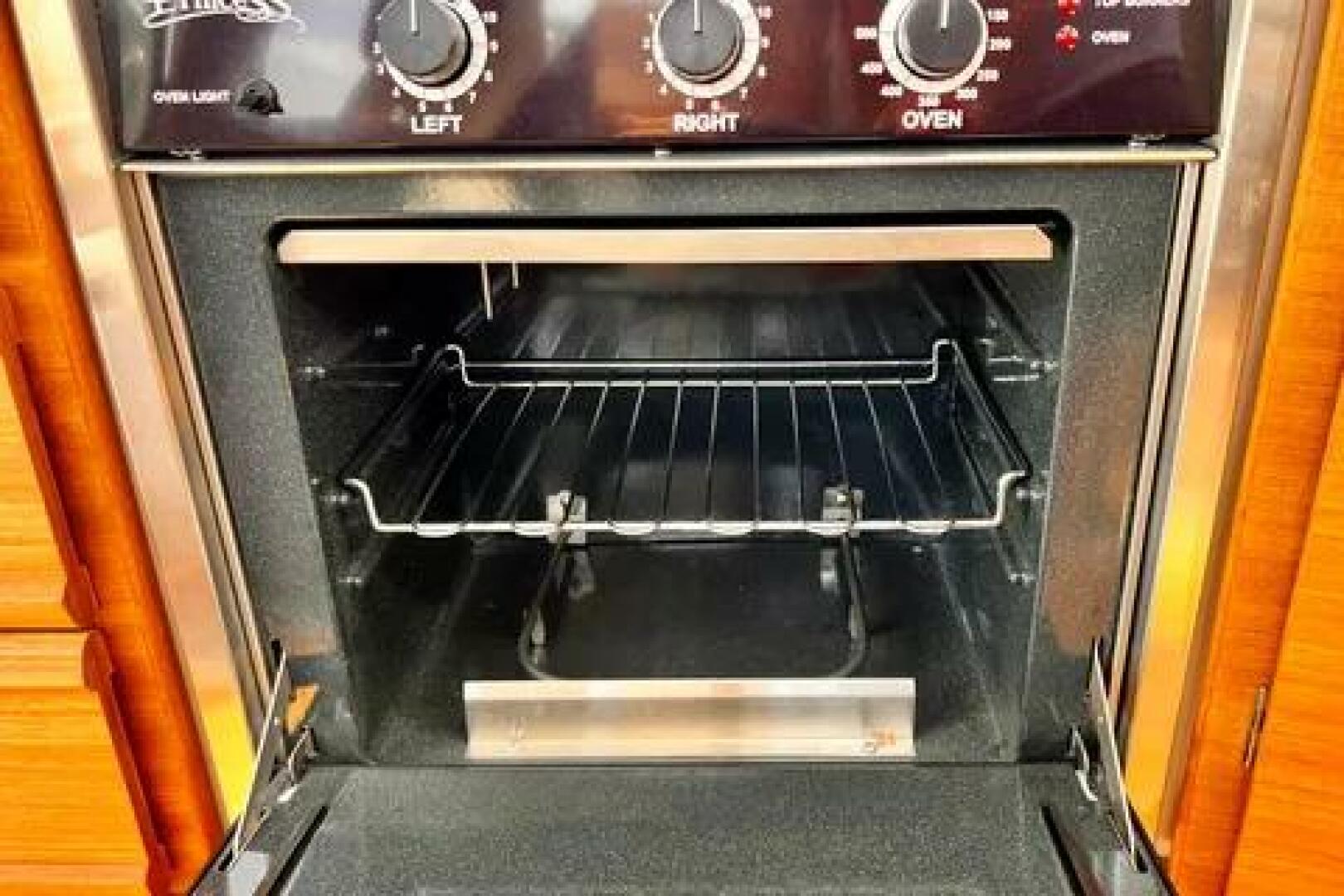 A fully appointed galley with two burner electric stovetop and oven, microwave, deep SS sink w/pull-out faucet, more than ample countertop and storage, refrigerator/freezer and wine cooler.