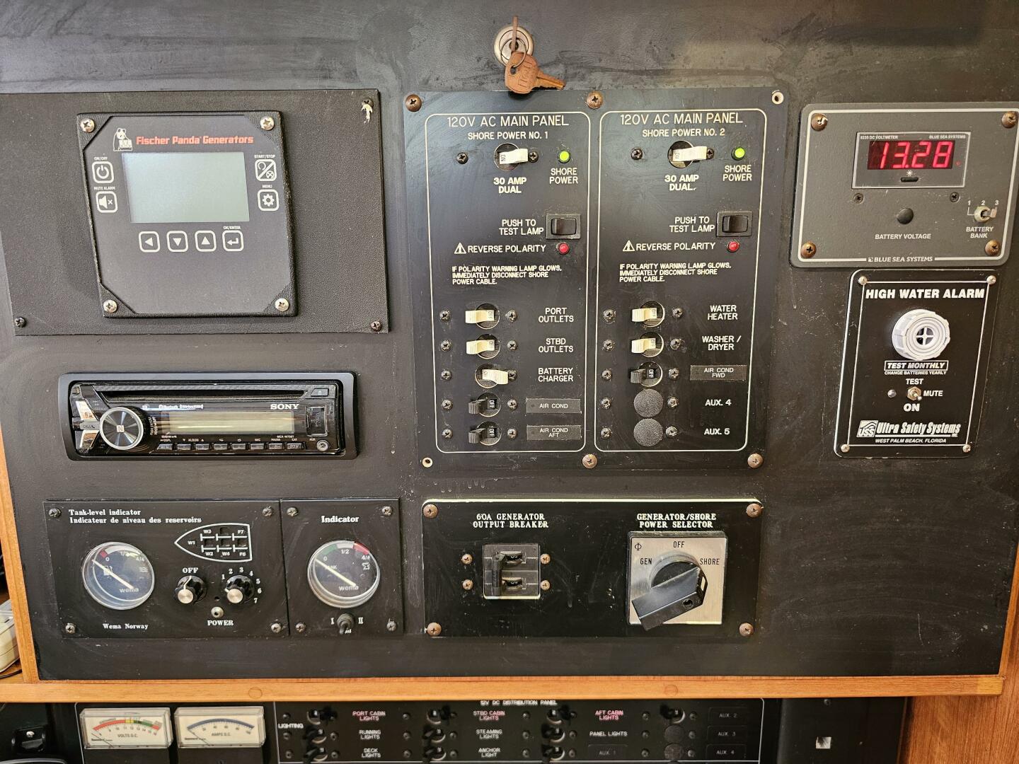 Recent upgrades include a new Fisher Panda 8 kW generator (2024), dual air conditioning units (2024), and AGM batteries (2024). Her bottom was last painted in August 2023, and the hull is maintained with monthly bottom cleanings and annual hauls.