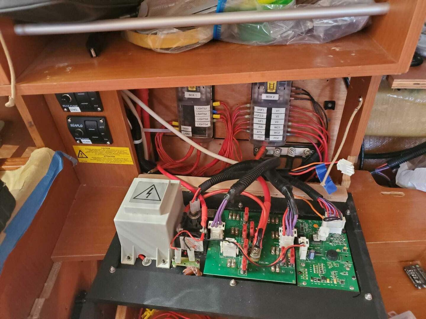 Electronics, 110 Volt replaced orig. 220 VOLT, Victron Inverter, Solar, additional 12 volt circuits, Radios, additional pumps, oversize bimini, helm cover, cockpit table cover, liferaft cover, are all upgrades beyond Industry standard.