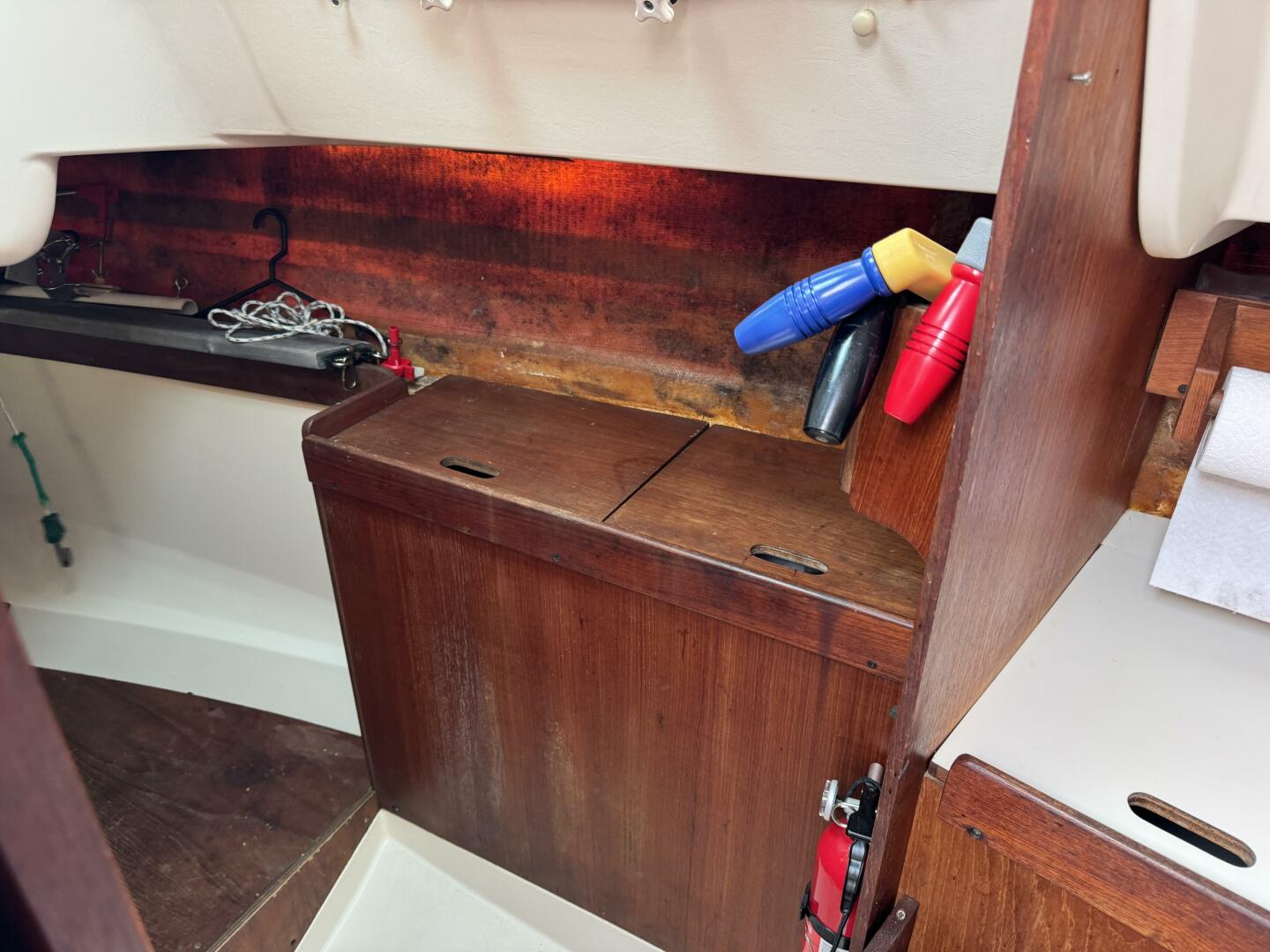 Below deck, the cabin is bright, airy, and surprisingly spacious for her size. The salon features a large dining table forward of the mast that converts to a comfortable double berth. The galley, to port, includes a two-burner alcohol stove, sink, and cutting board, with a built-in ice box opposite. Headroom exceeds six feet, giving the interior a true sense of openness. She sleeps three comfortably, with a private head and shower equipped with a 25-gallon freshwater system and hot water on shore power — ideal for weekend getaways.