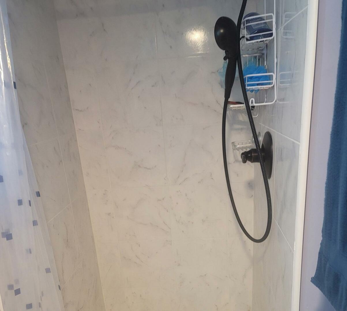 Bathroom: Electric Raritan toilet (holds constant water in bowl) and 12"x12" tiled shower.