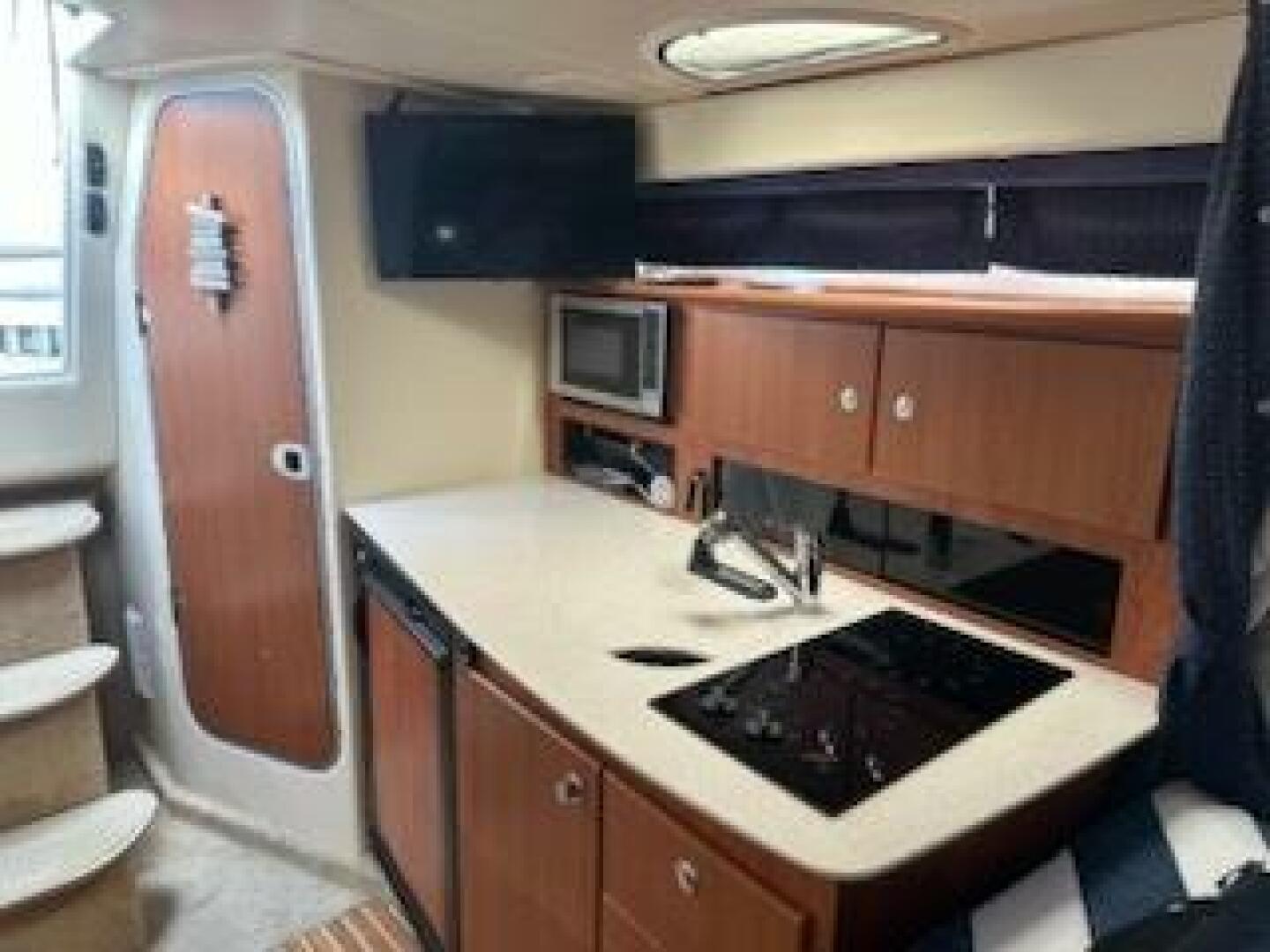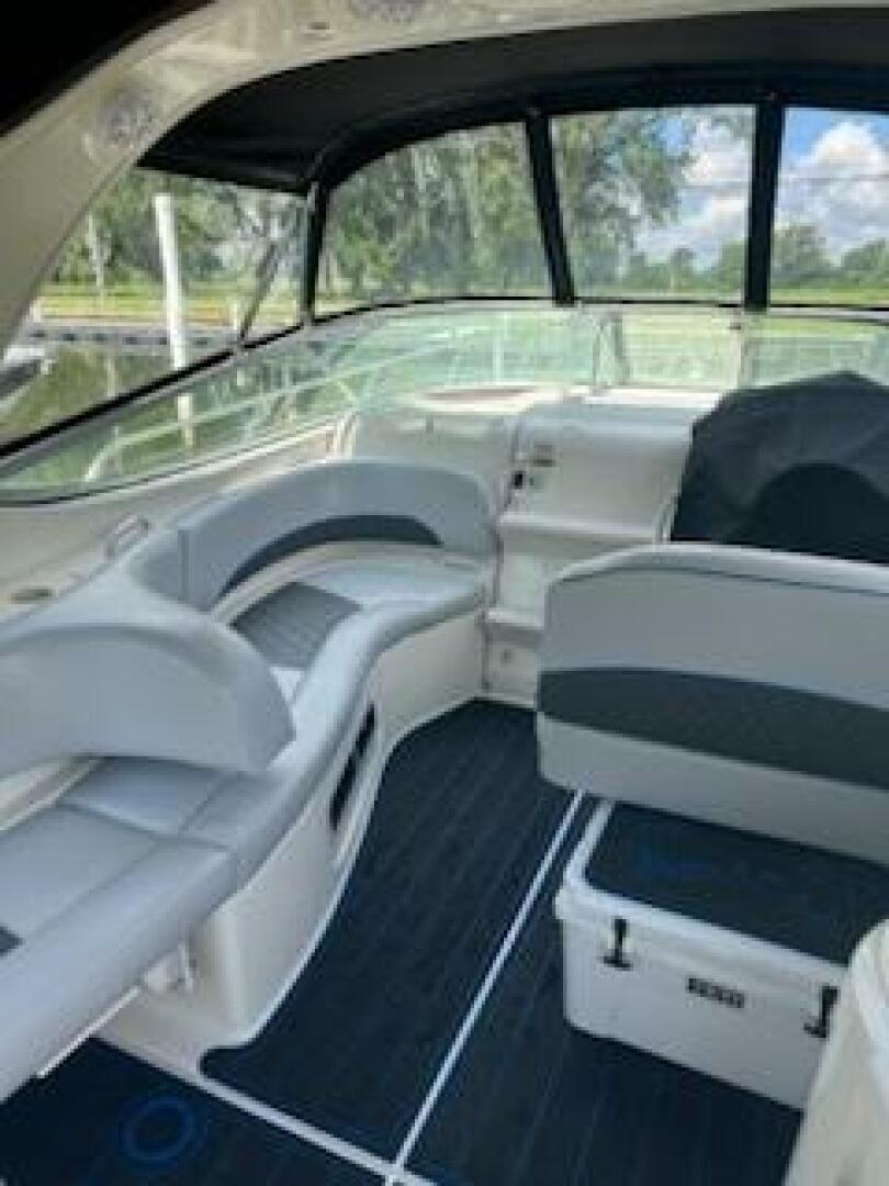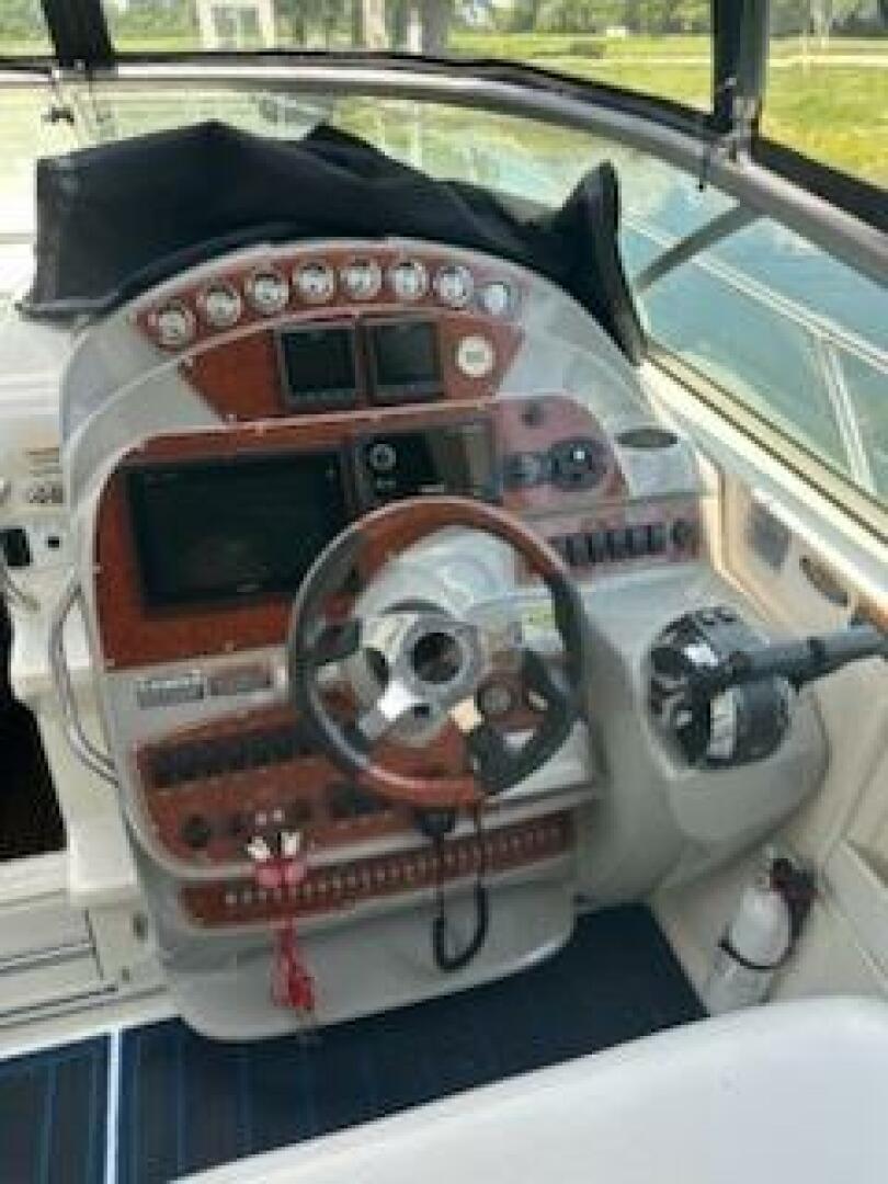 Sleek and spacious mid-size cruiser from Bayliner’s well-regarded 320 series — ideal for weekend escapes or extended stays aboard. Impressive cockpit layout featuring a well-designed helm station, comfortable companion seat, and wrap-around seating with plenty of room for friends and family.