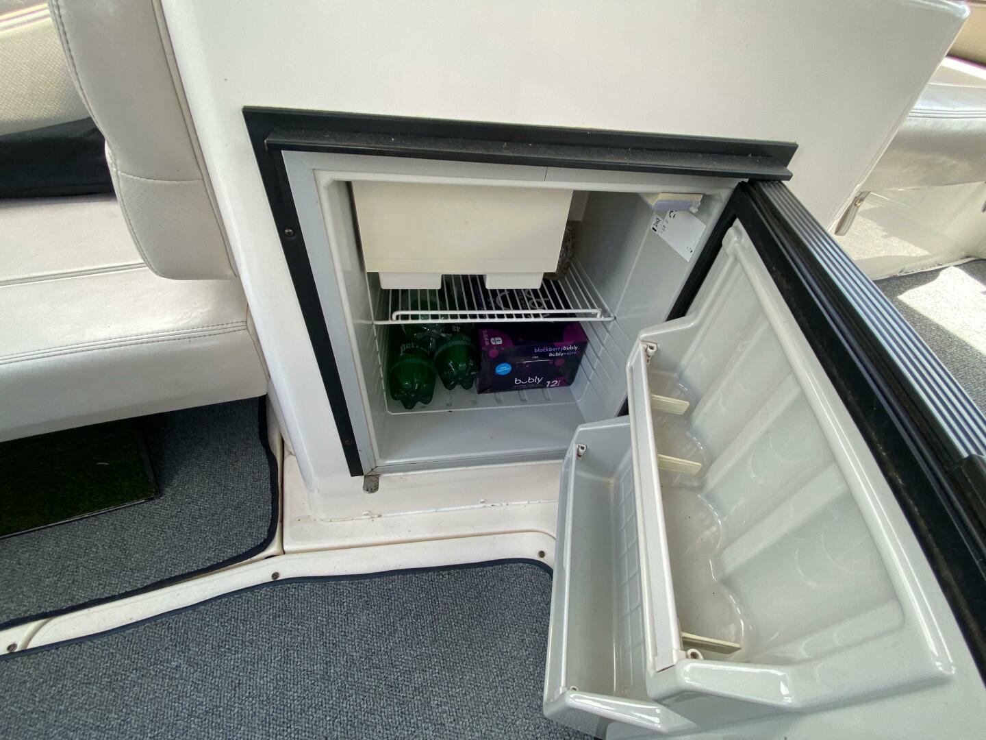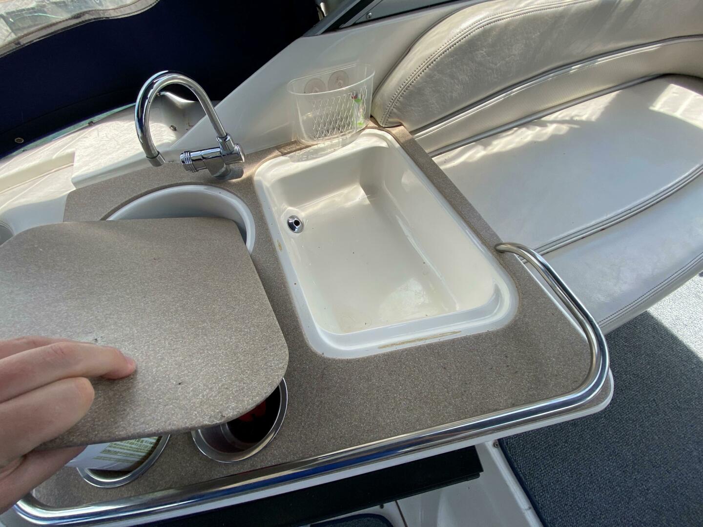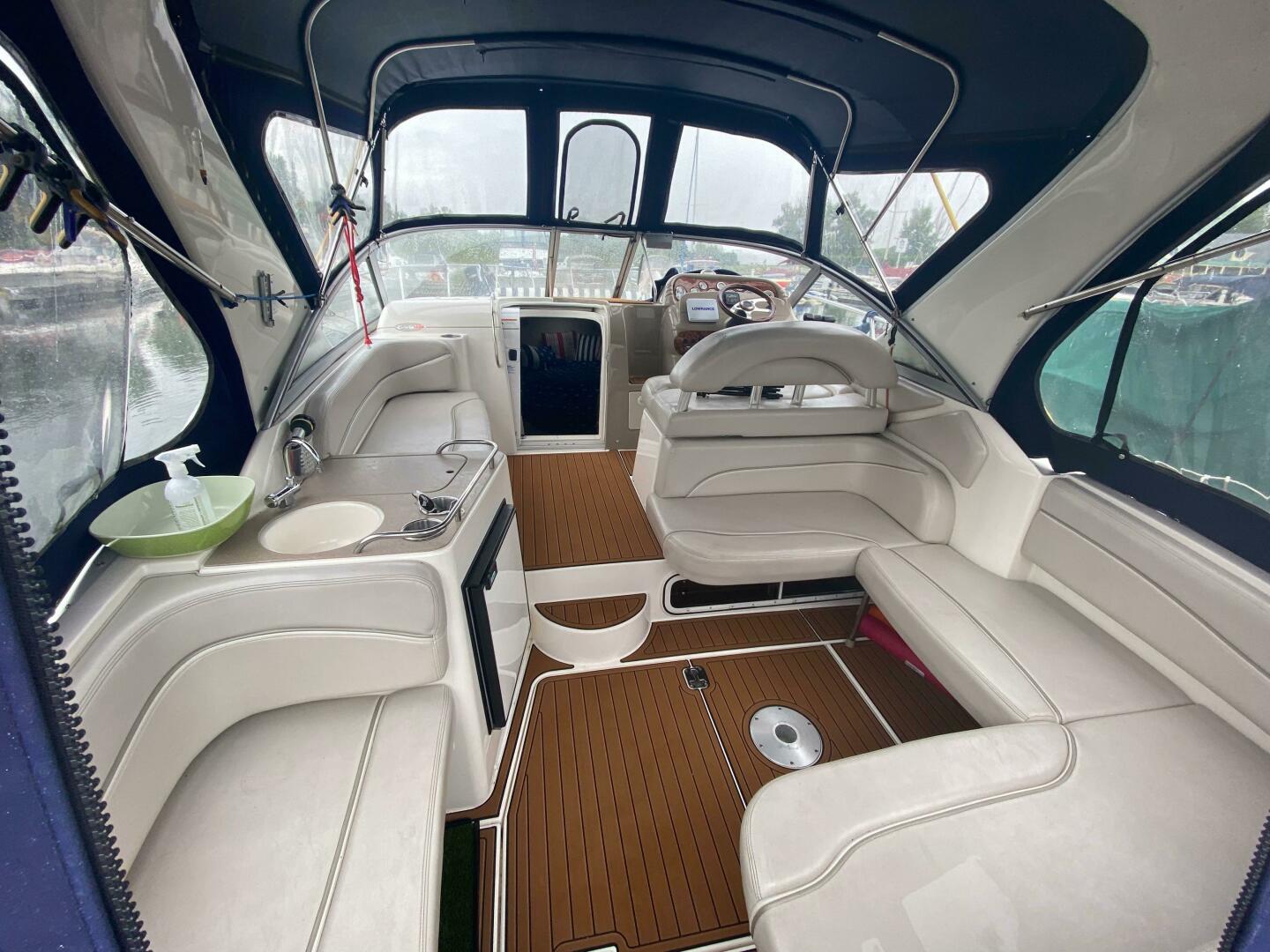 At the helm you’ll appreciate the walk-through windshield, dual-wide helm seat, easy side deck access and the extended swim platform with transom gate — ideal for boarding or water-play. The cockpit features a U-shaped lounge, wet-bar and full camper-canvas enclosure for protection in changing weather.