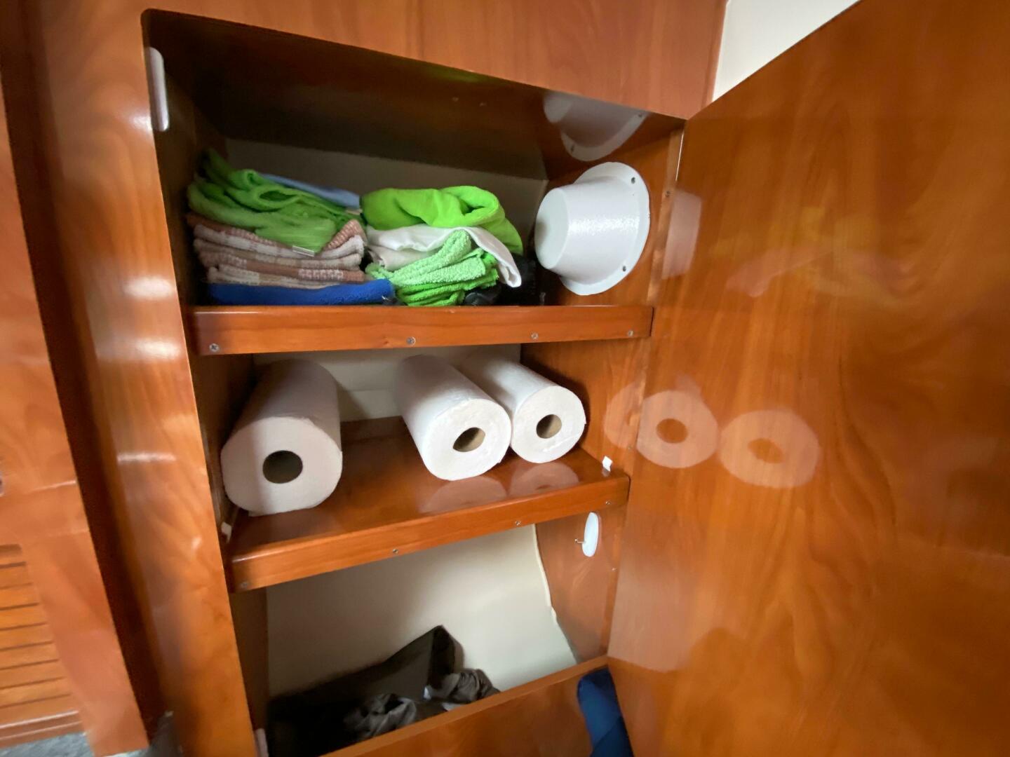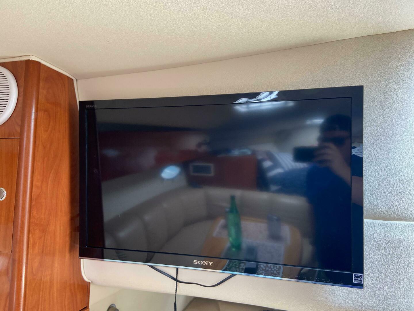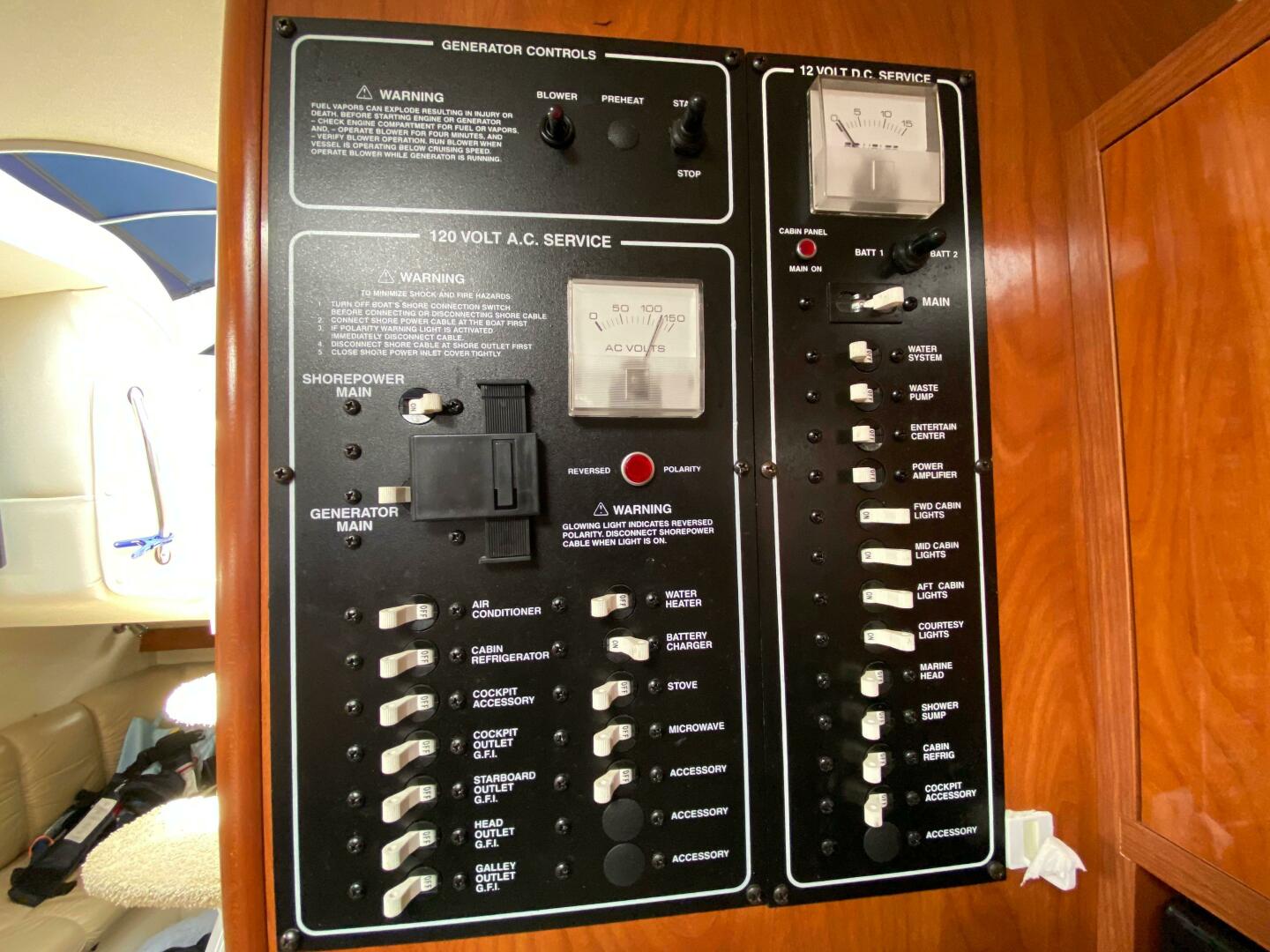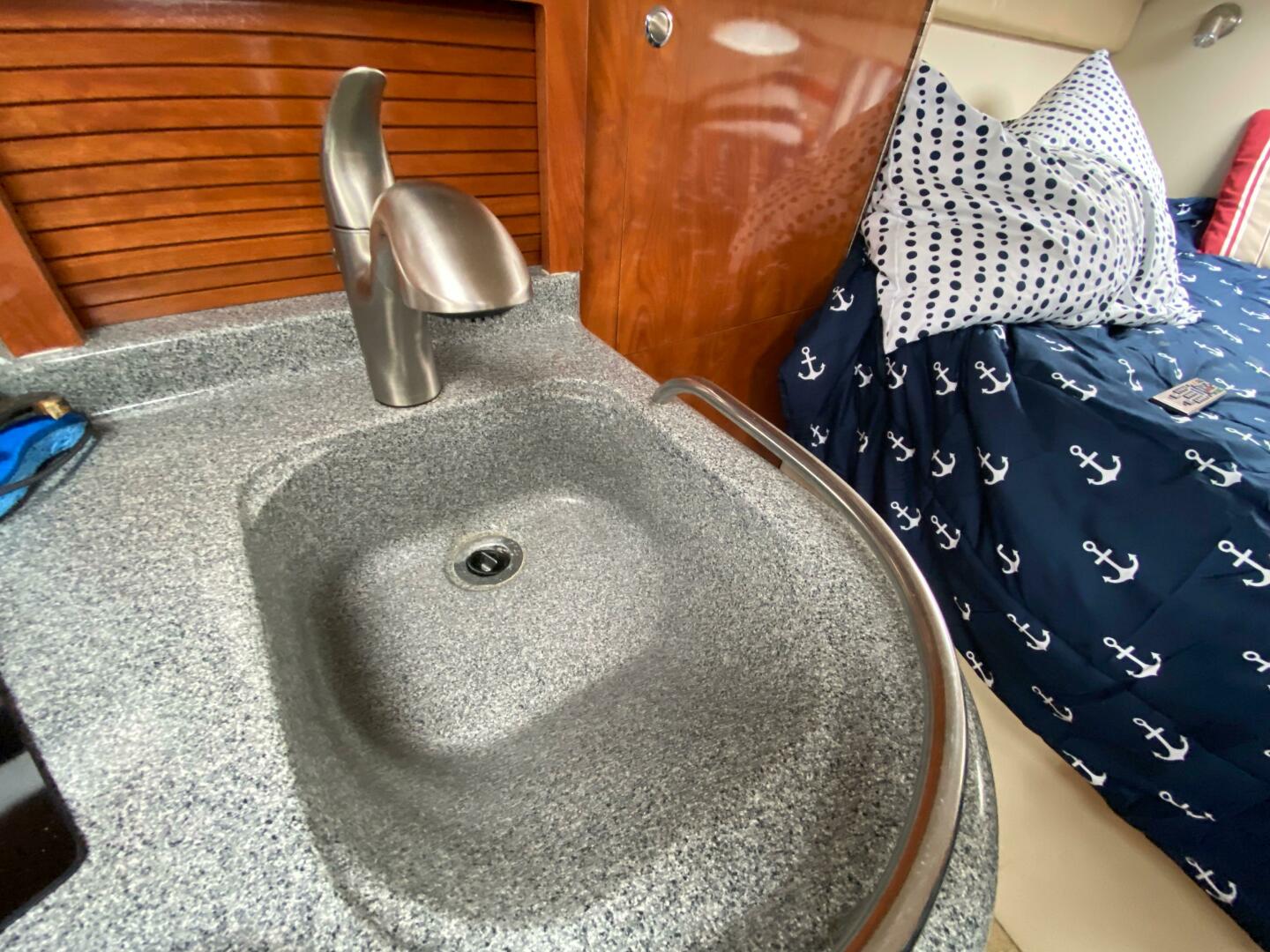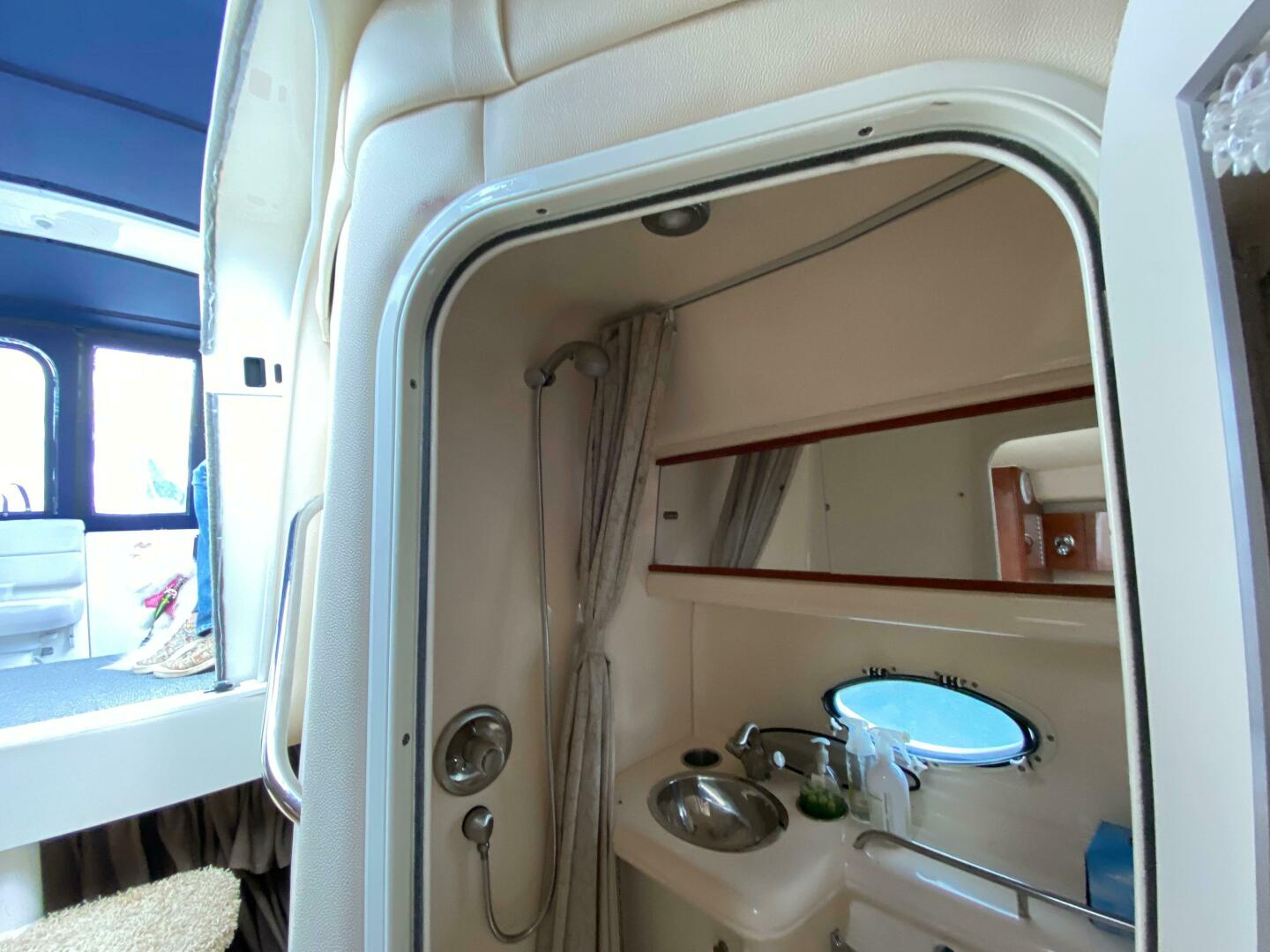 Step down into the mid-cabin layout and you’ll find an offset forward V-berth, convertible dinette, a private aft cabin/lounge, plus an enclosed head with shower — making this truly live-aboard capable. Cherry-laminate woodwork, good headroom and thoughtful ergonomics reaffirm the tried and true Larson quality.