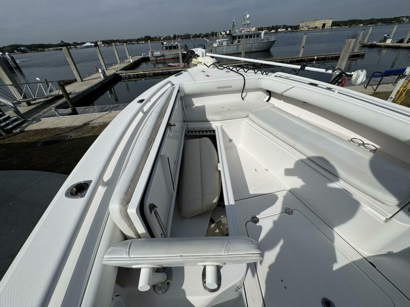 2017 Everglades 273 CC for sale in Jacksonville Beach, Florida with twin Yamaha F250 outboards (568 hours). Hybrid inshore-offshore design featuring twin Garmin XSV displays, Power-Pole, windlass, and enclosed head. Clean, capable 27’ center console.