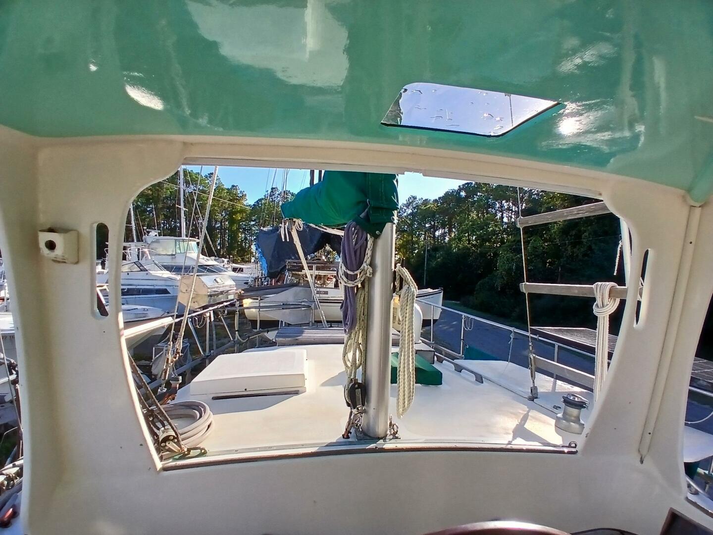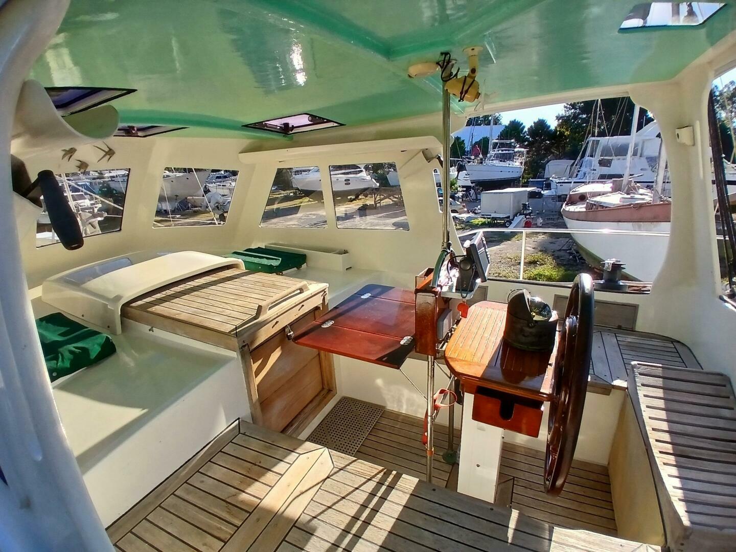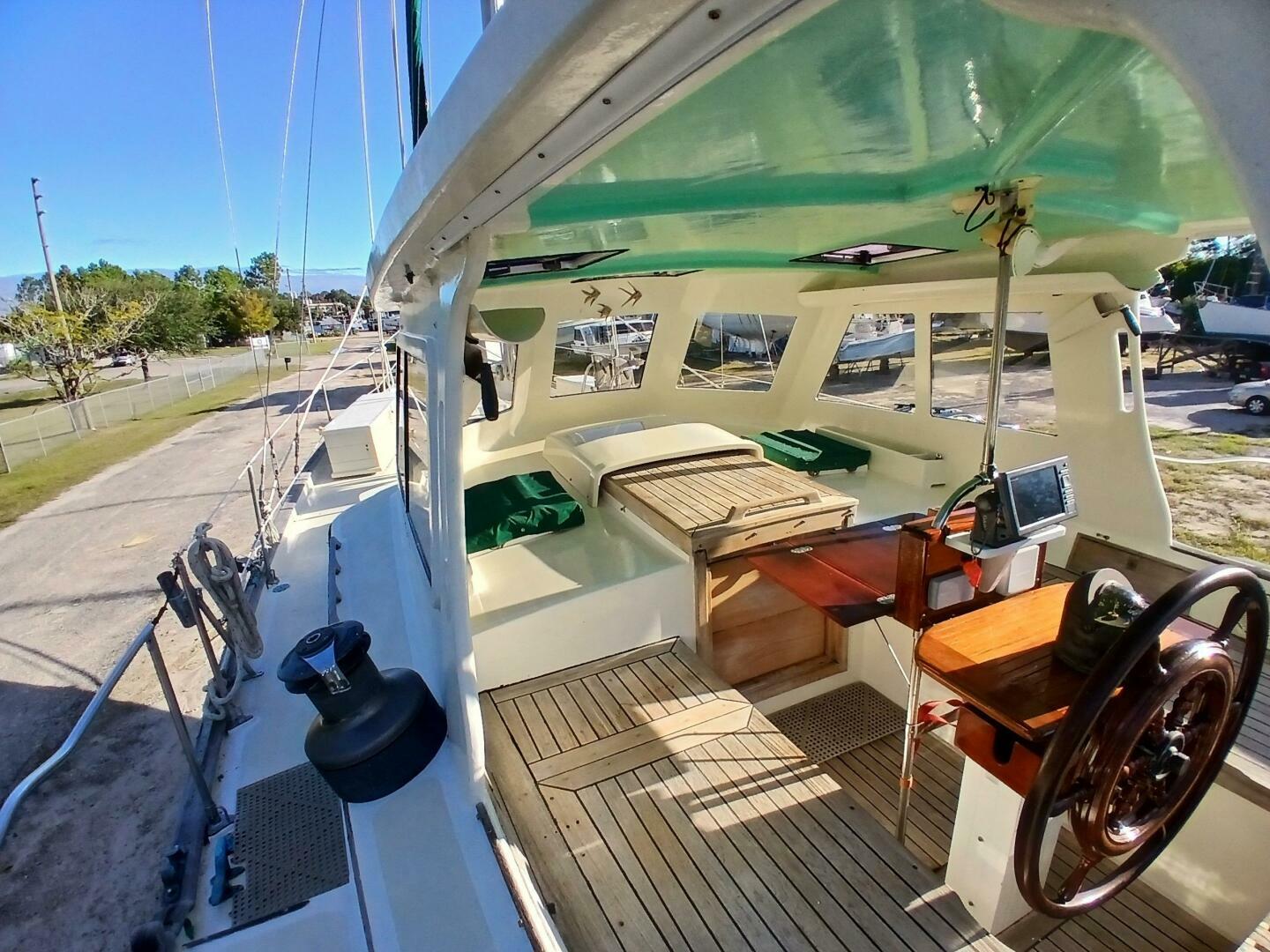- Custom Pilot House Hardtop enclosure with 73-inch headroom, large tinted double pane safety glass windows and 3 top hatches for ventilation. Glass view port in top for viewing sail and windvanes.