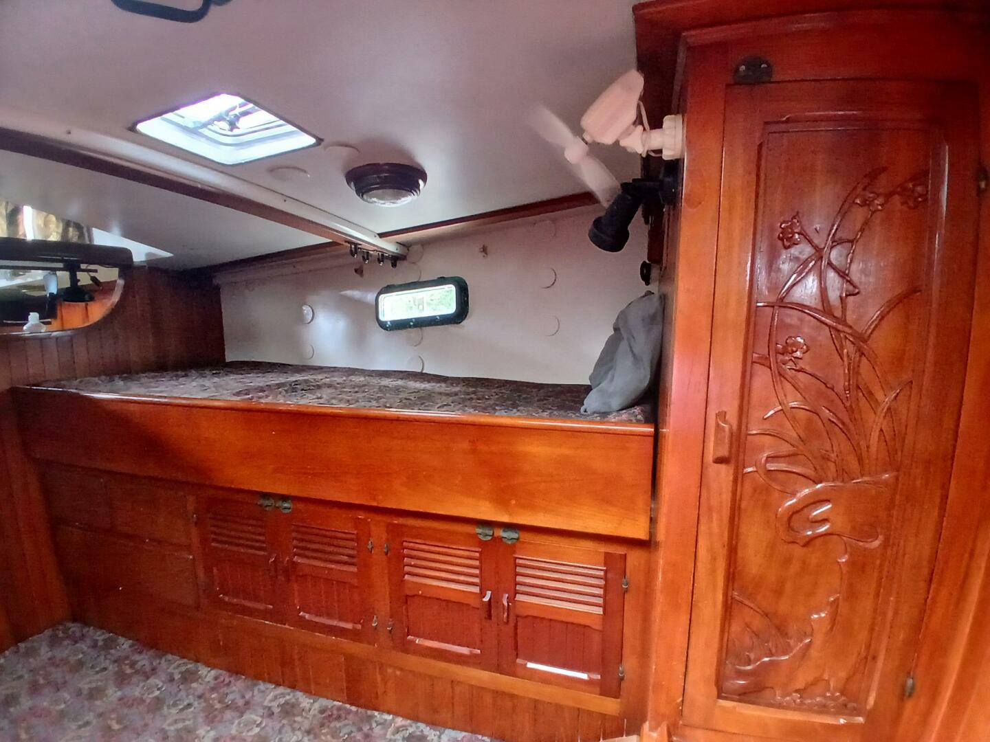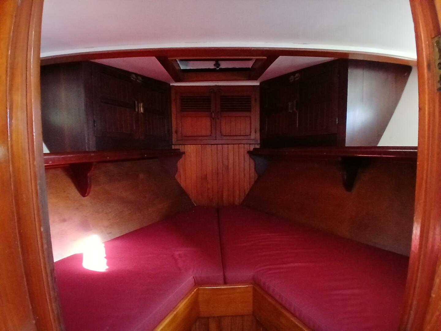 Forward towards the bow there is a spacious V-Berth with a beautifully carved door for privacy. There are lockers and shelves on both sides and a hatch large enough to pass sails through. V-berth cushions are covered in burgundy sunbrella, and underneath them is even more storage. The anchor locker is just forward of the V-Berths with great access via double doors towards the bow.