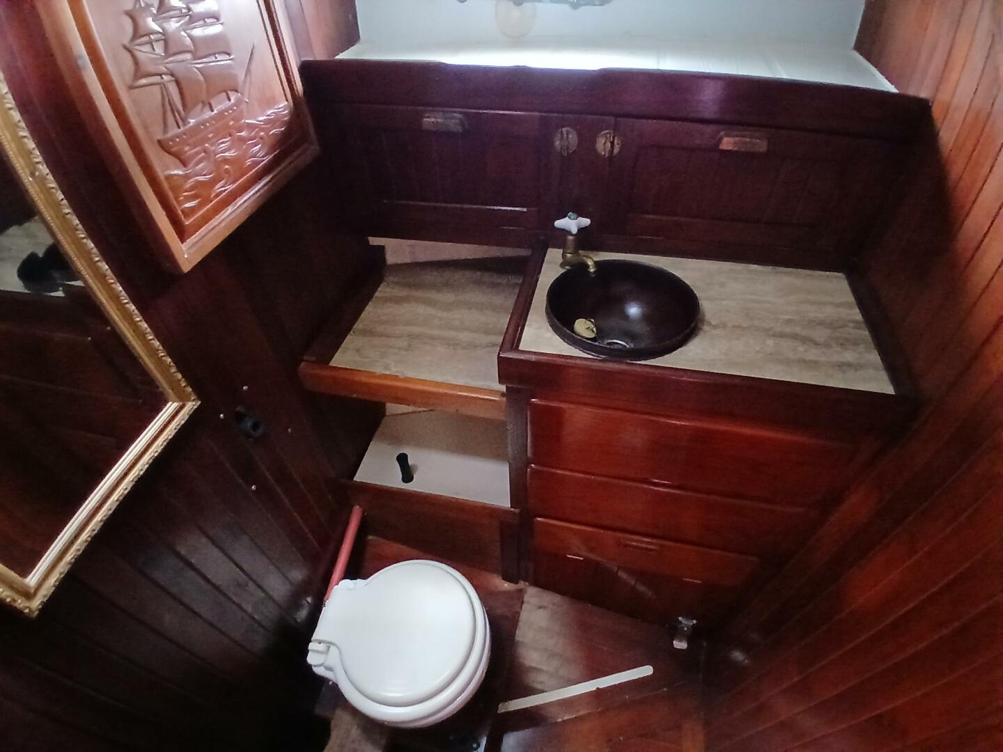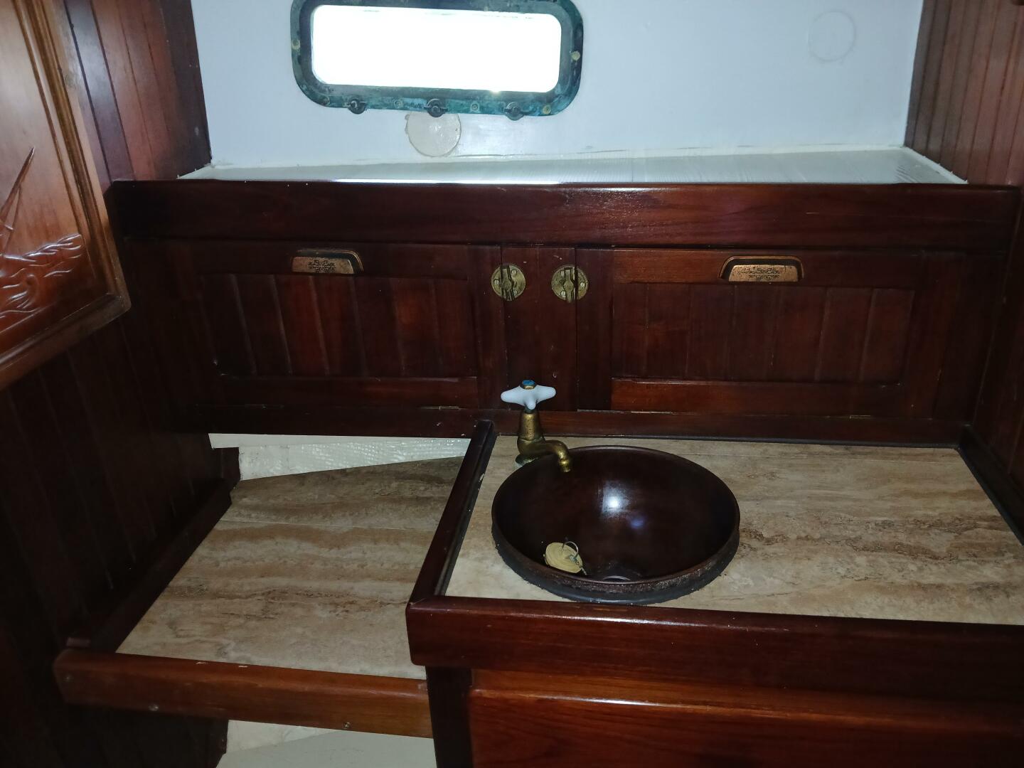 - Aft Head- Jabsco Manual Head with new pump 3/2024, Standup separate Shower, Marble coutertop, Stainless bowl Sink with foot pedal, access to engine room