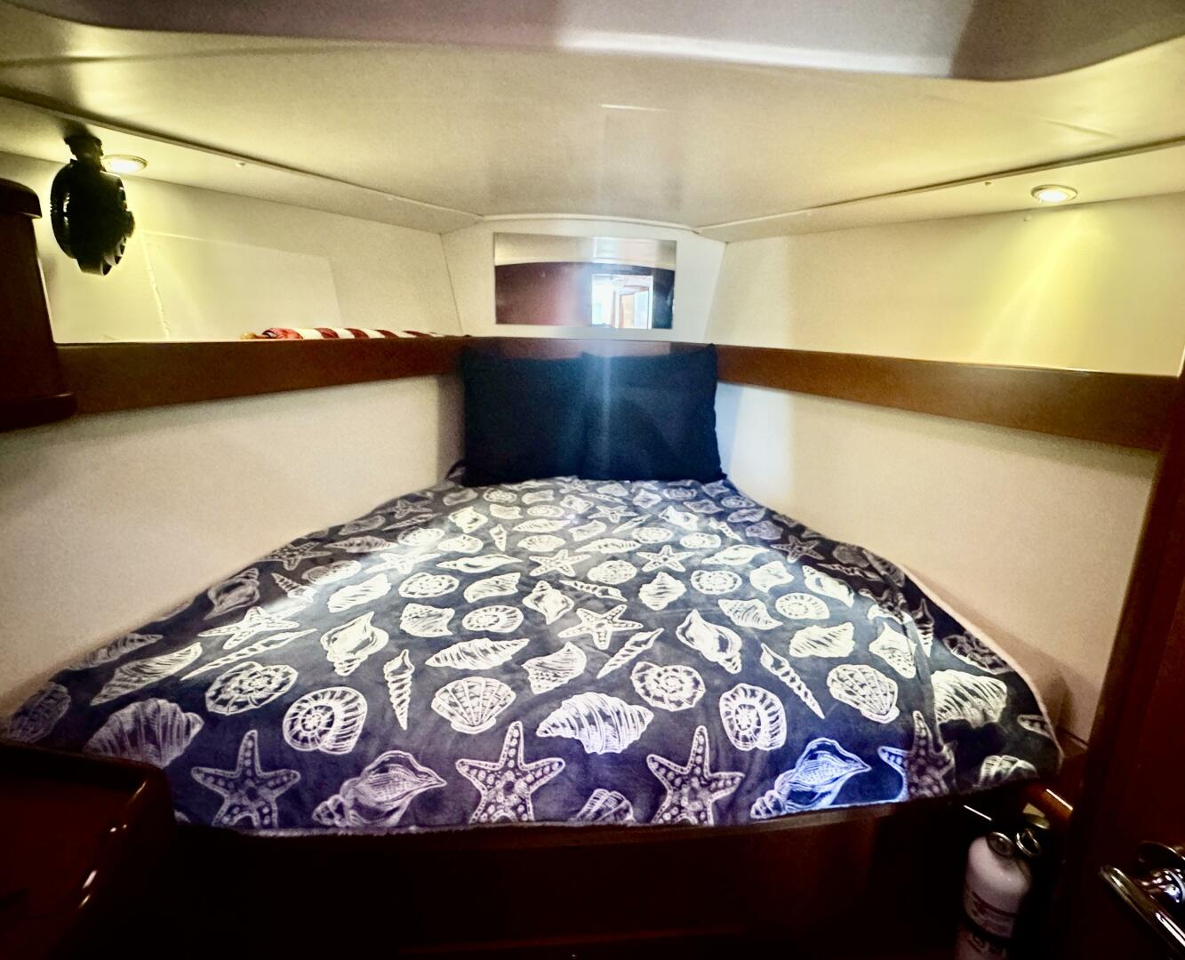 Features a large athwartship bed. There are transom opening ports for additional ventilation and light. The Mattress has inner spring support. Hanging clothes locker.