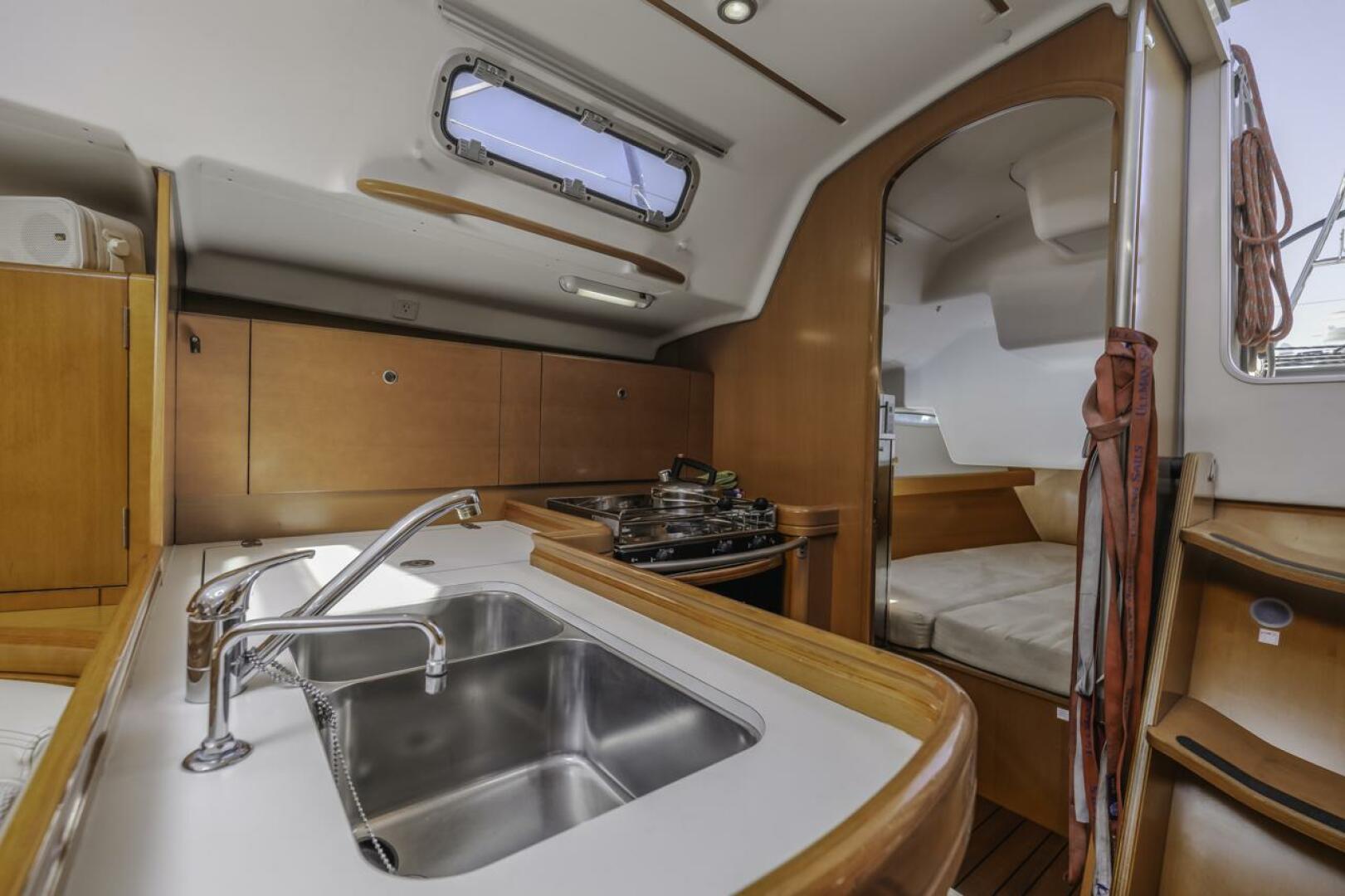 Enter the wide companionway to galley starboard suited for a Chef with plenty of storage ample counter space, refrigeration and 3 burner stove / oven. aft is a guest stateroom equipped with additional refrigerator, microwave, large Berth for two and 6'8" of headroom.